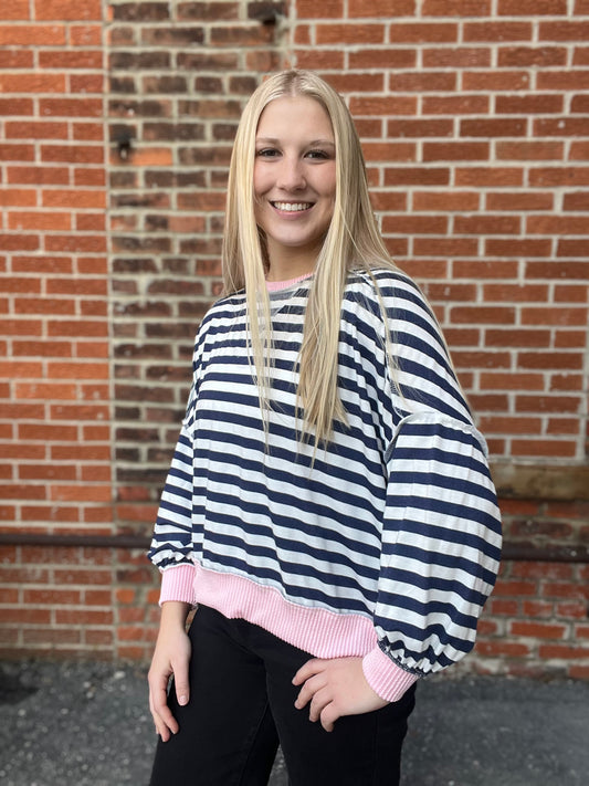 The Milla Drop Shoulder Taupe and Blue Knit Sweater Top