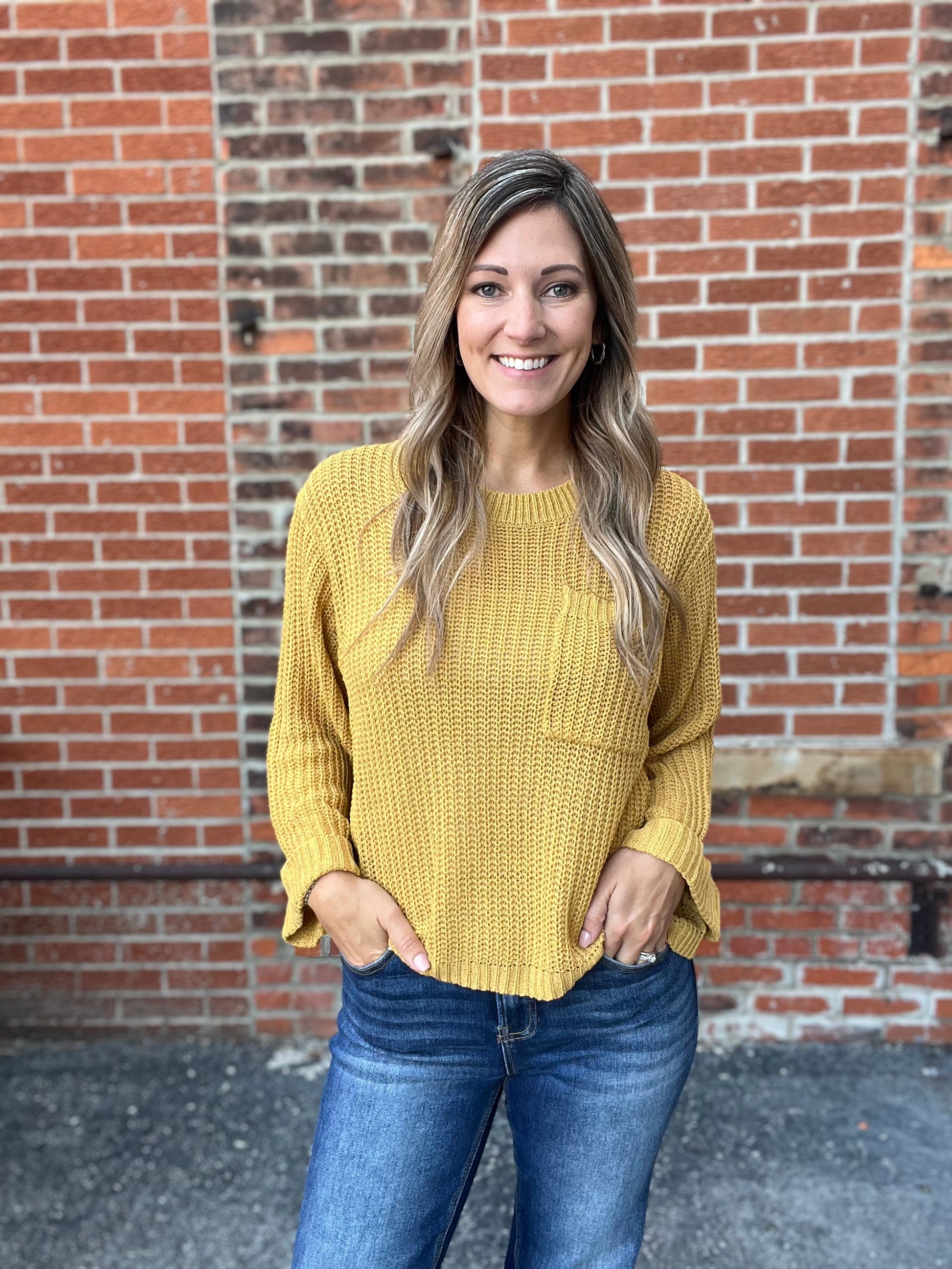 Stay cozy and stylish with our knitted sweater, featuring a classic round neck and a convenient pocket on the top left. Crafted from soft, lightweight fabric, offering both comfort and a touch of casual elegance. The pocket detail adds a unique touch, making this piece a versatile addition to your fall wardrobe.
