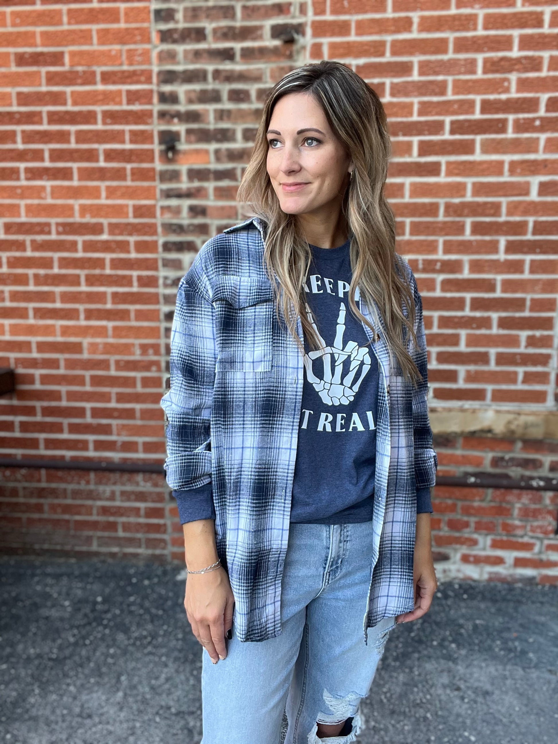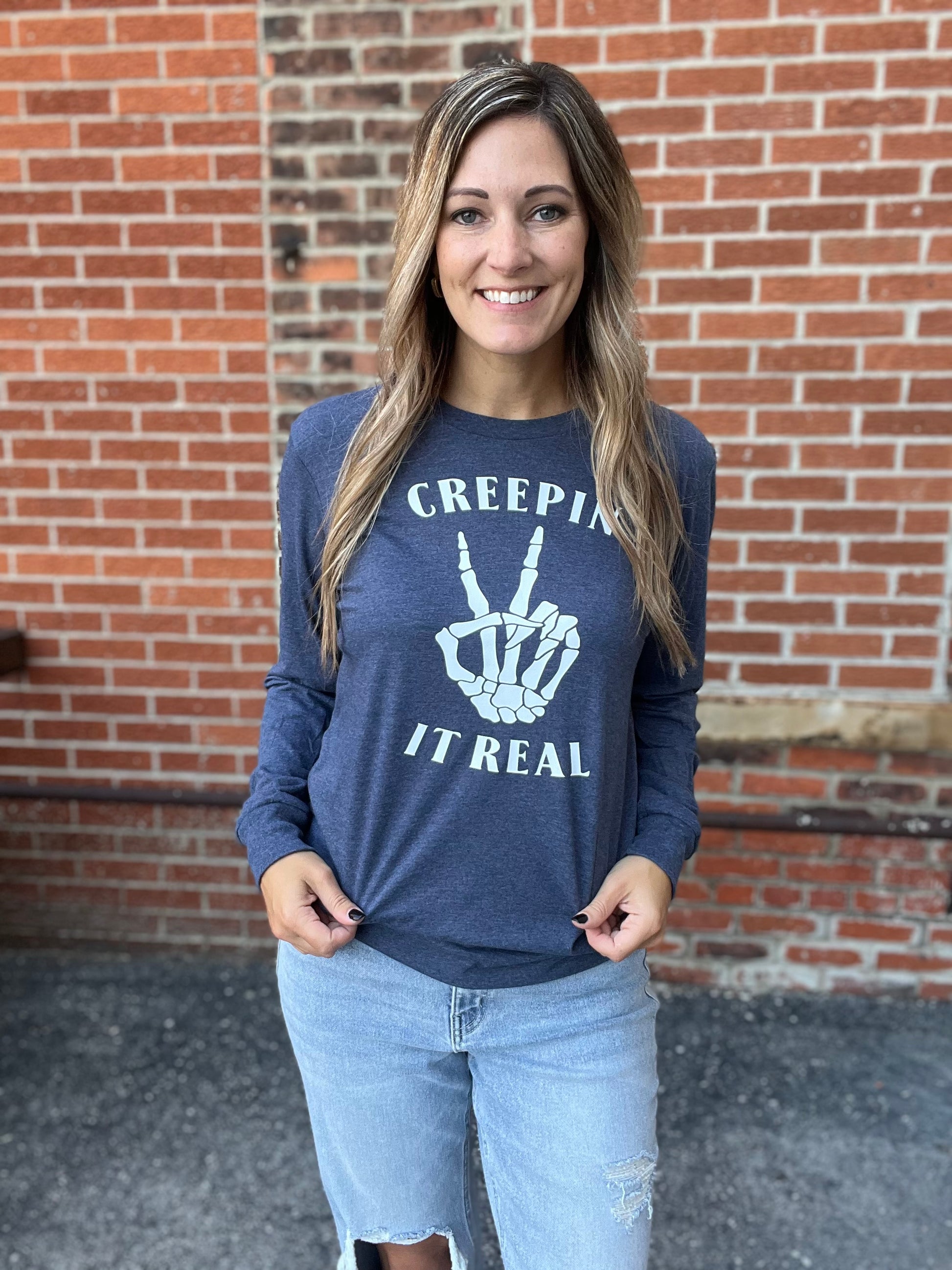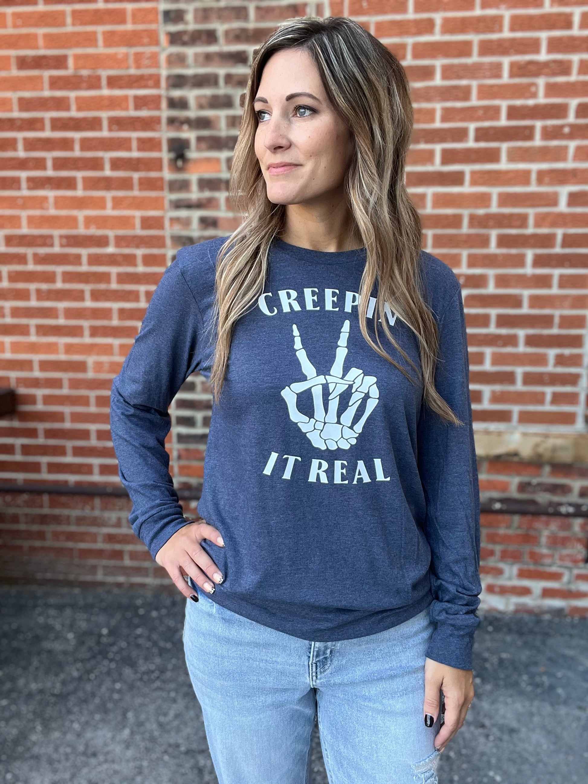 Embrace the spooky season with our Soft and Lightweight Long Sleeve Ash Navy "Creepin' It Real" Graphic Top. Crafted from ultra-comfortable fabric, this shirt is perfect for those cool autumn days. Ideal for layering or wearing on its own, this long sleeve tee is your go-to for effortless style and cozy comfort. Keep it real and keep it creepy with this must-have fall wardrobe addition!