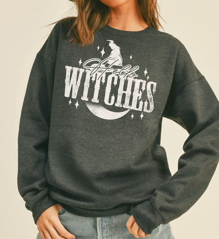 Get in the Halloween Spirit with our Hello Witches Halloween Graphic Sweatshirt