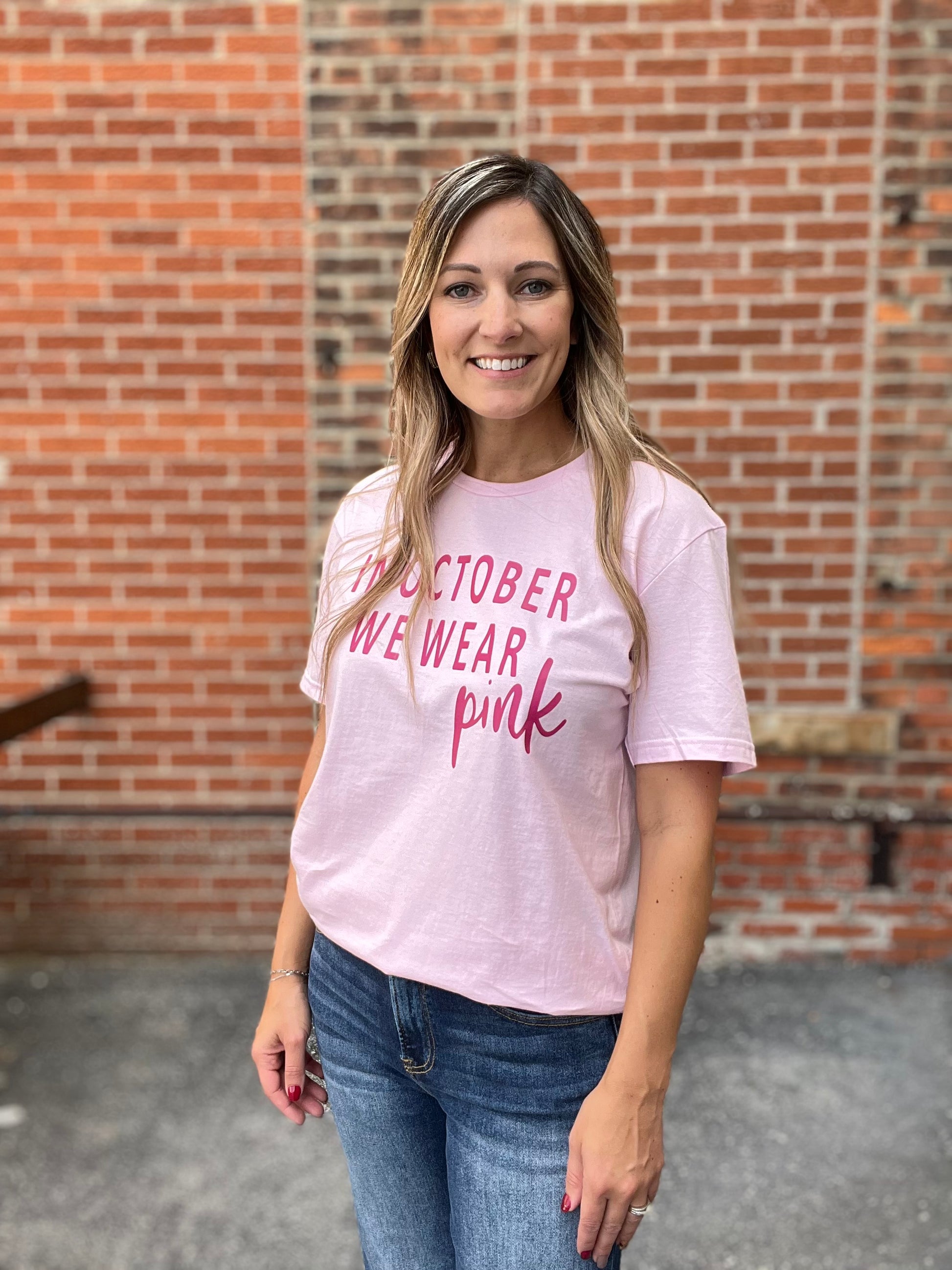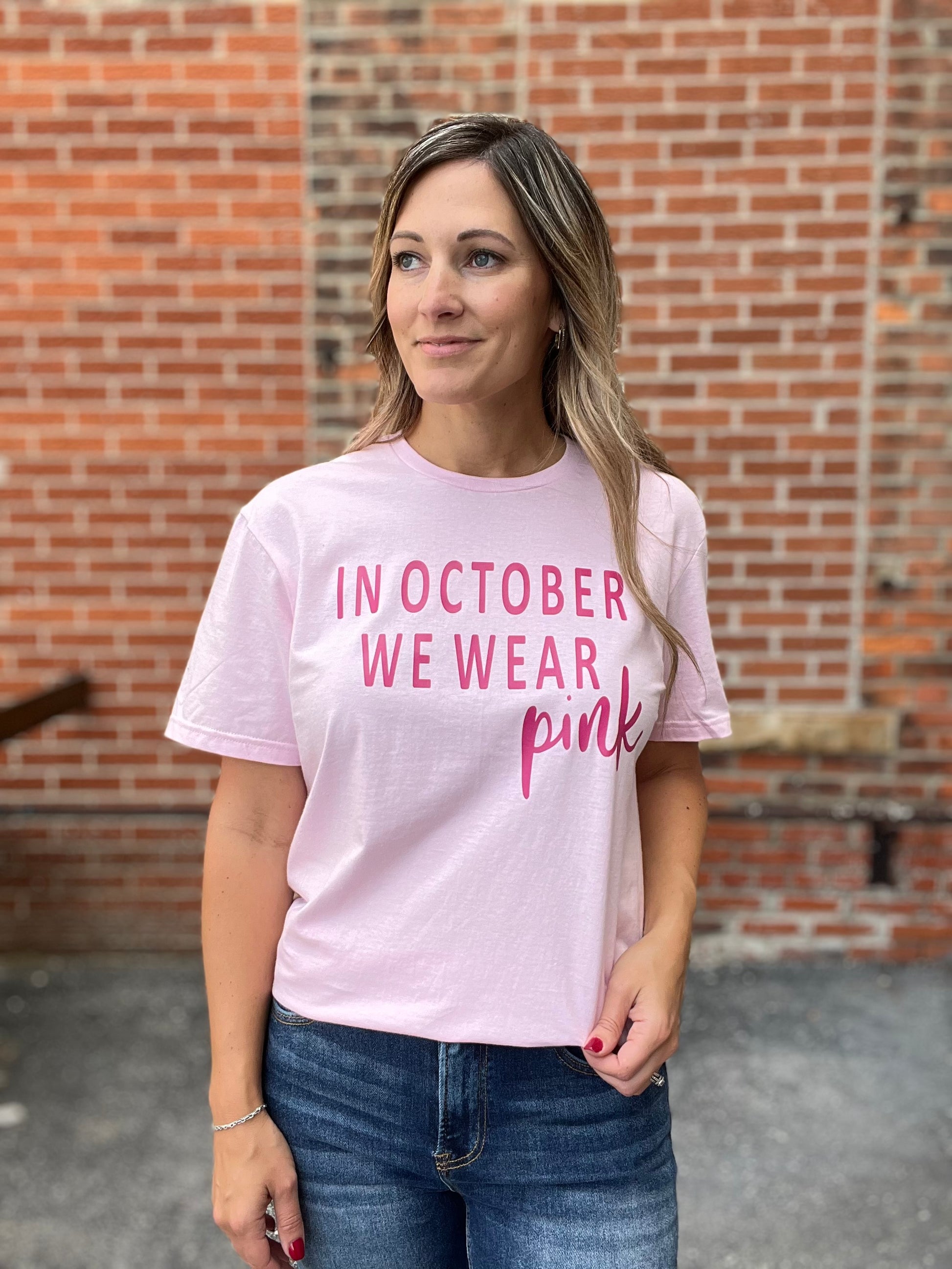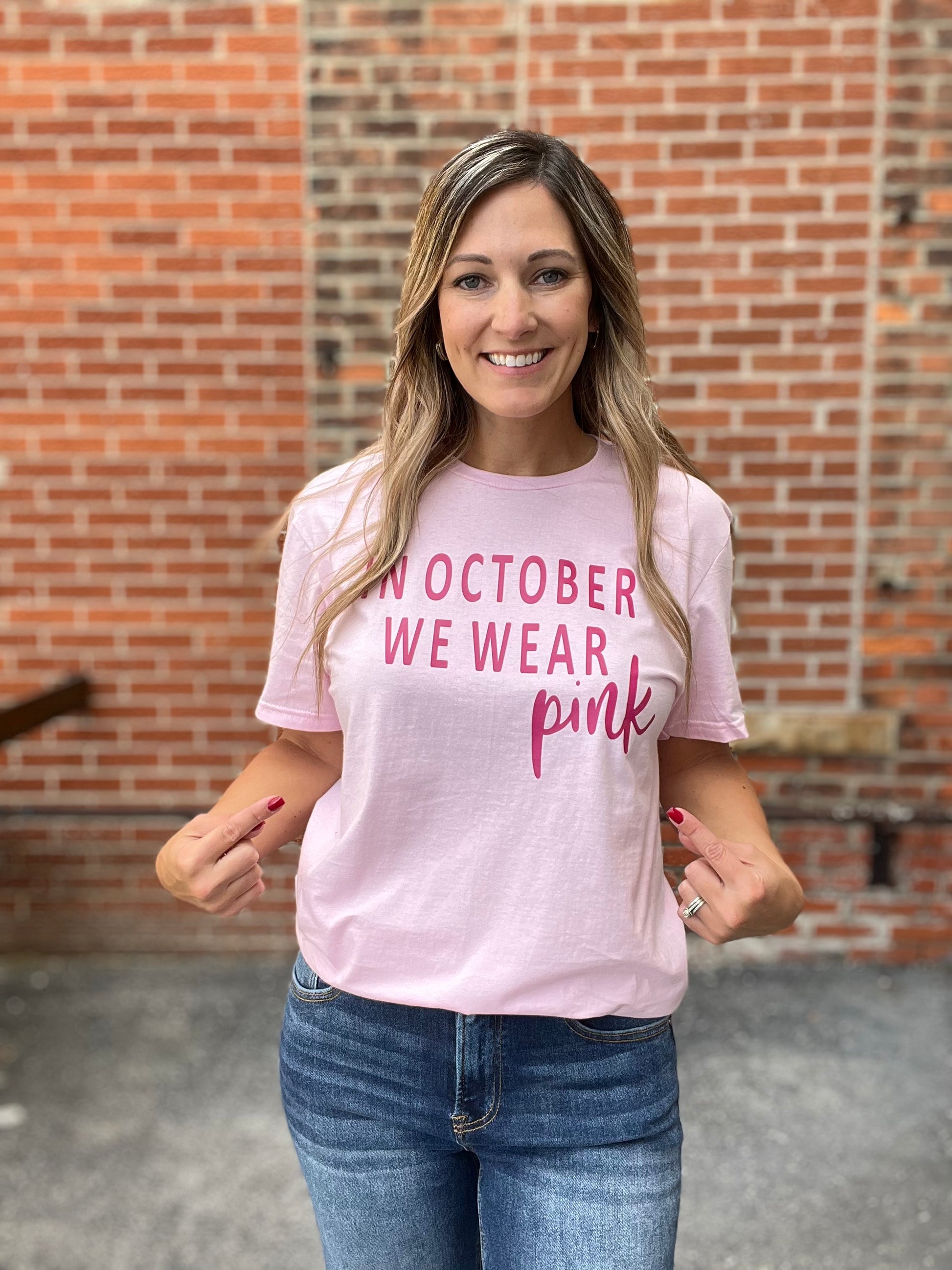 This "In October We Wear Pink" tee is a stylish and meaningful way to show your support during Breast Cancer Awareness Month. Crafted from soft, breathable fabric, it offers all-day comfort while making a bold statement. The classic design features eye-catching pink lettering, celebrating solidarity and raising awareness for a worthy cause. Perfect for layering or wearing solo, this tee is not just a fashion statement but a symbol of strength and unity. Wear it proudly throughout October to honor the fight against breast cancer in style.