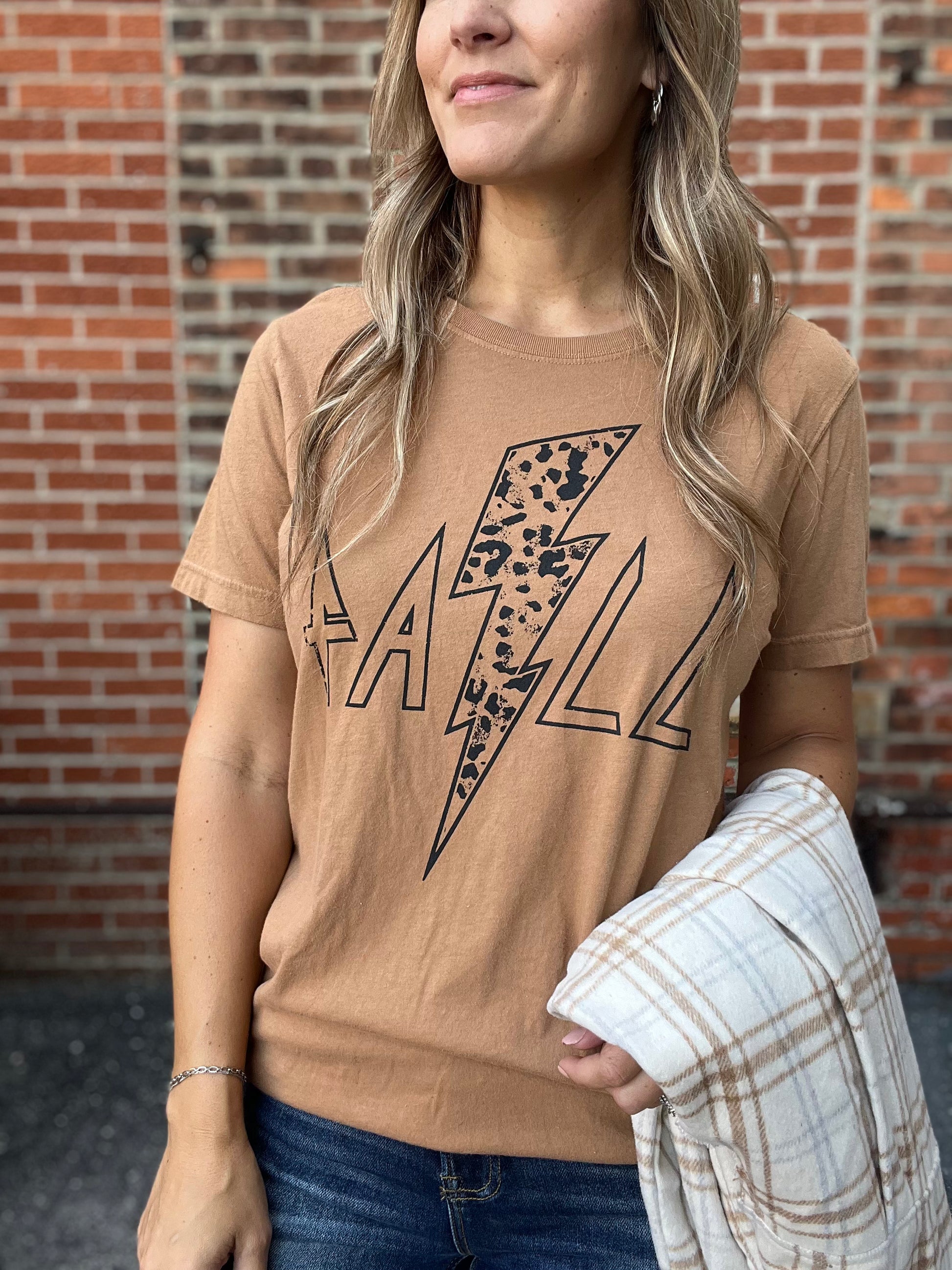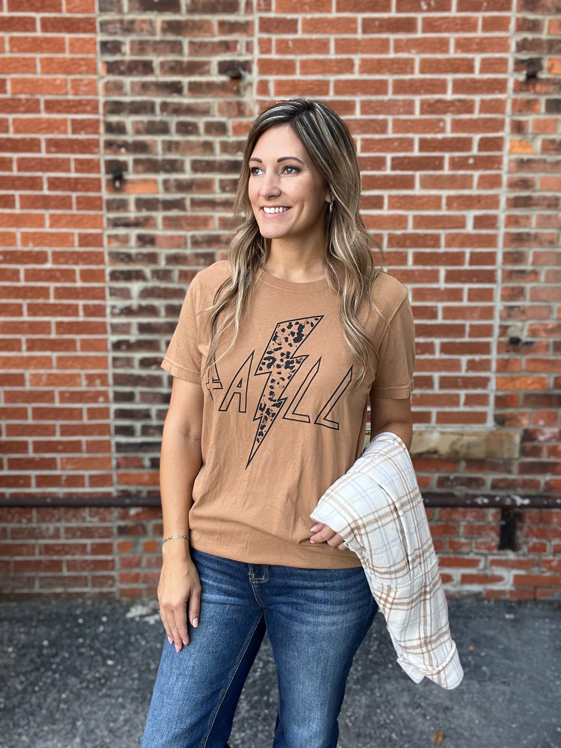 Embrace the season with our cozy brown fall tee, featuring a stylish round neck and a striking lightning bolt design. Crafted from soft, breathable fabric, this tee offers comfort