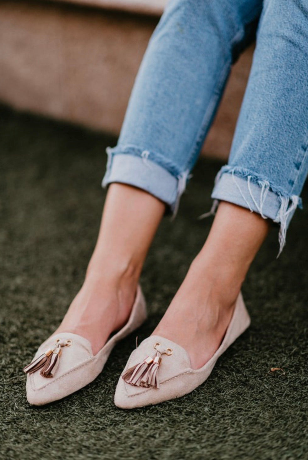 These Beige Faux Suede Flats With Tassels Are Adorable! Roll Em’ Up And Have Them ready For Your Tired Feet.