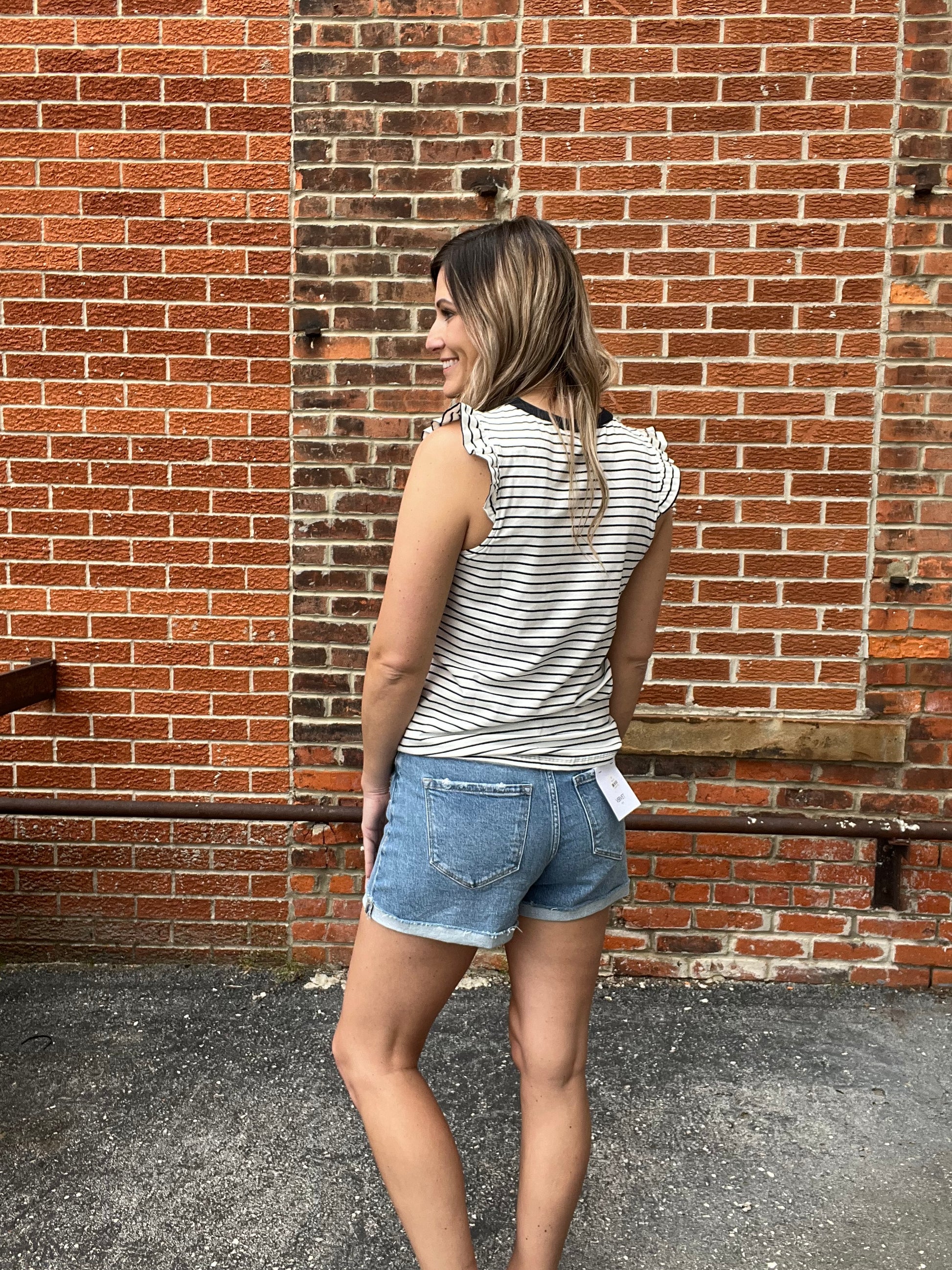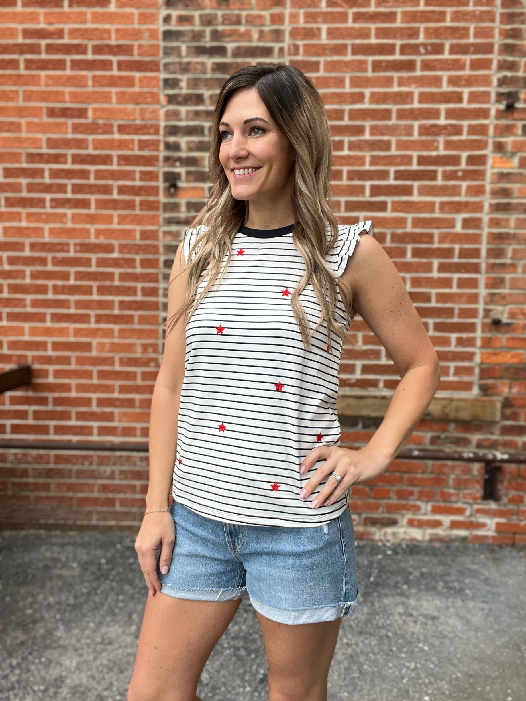 This timeless stripped top features: charming embroidered stars, navy rounded neckline tank with classic ruffled sleeves. Tank is true to size, the model is pictured in a size small for reference.