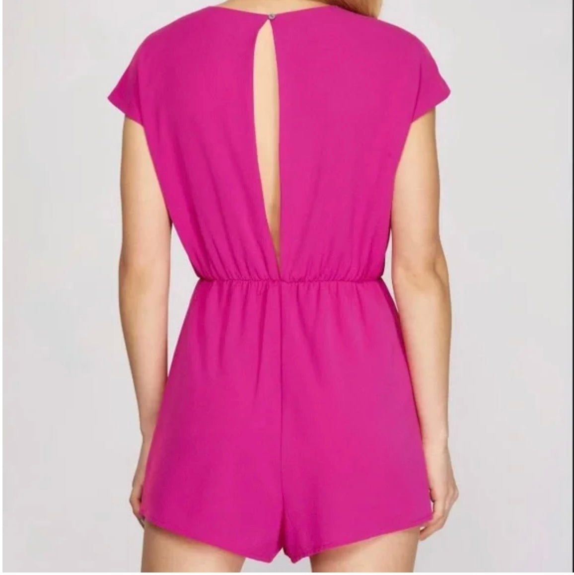V Neckline Solid Tie Front Romper With Open Back Detail And Button Closure.