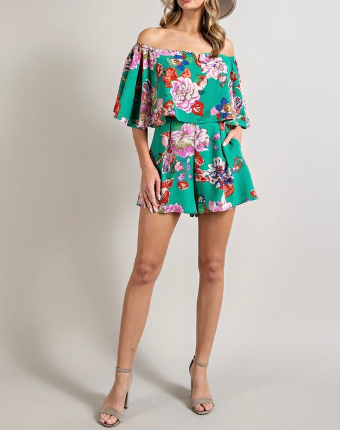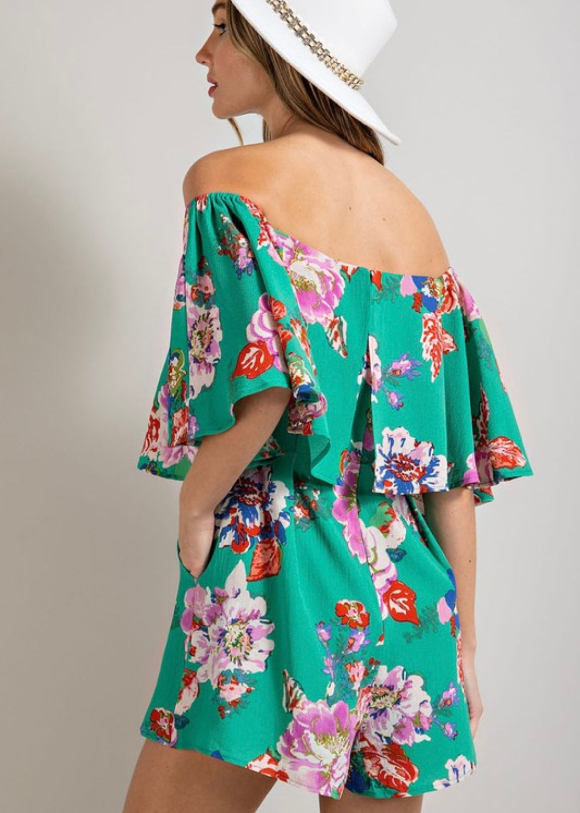 Kelly Green Off The Shoulder Romper In An All Around Floral Print And Also Has Pockets. Model is 5’4” Wearing A Medium