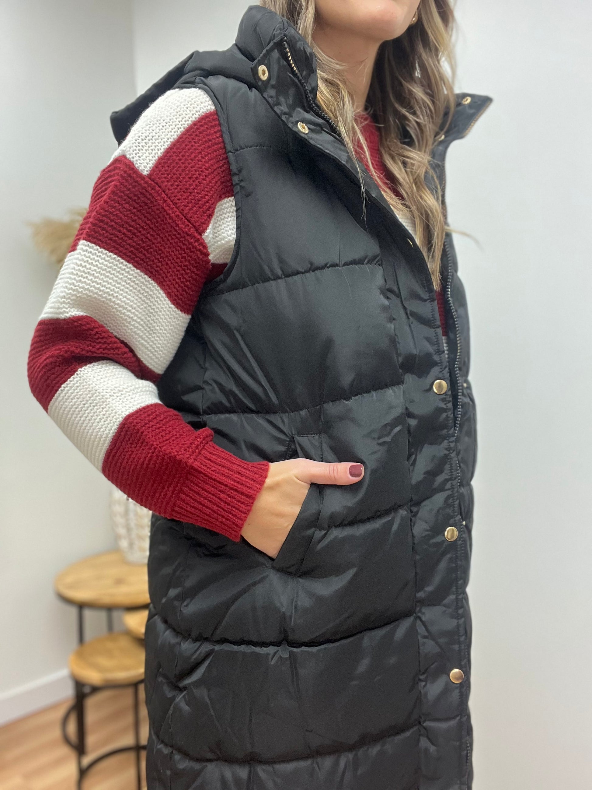 Stay warm and stylish in this long quilted puffer vest featuring an attached hood for extra coziness. Designed with a sleek gold zipper and snap closures, it offers both function and flair. Perfect for layering over your favorite sweaters for an effortlessly chic cold weather look.