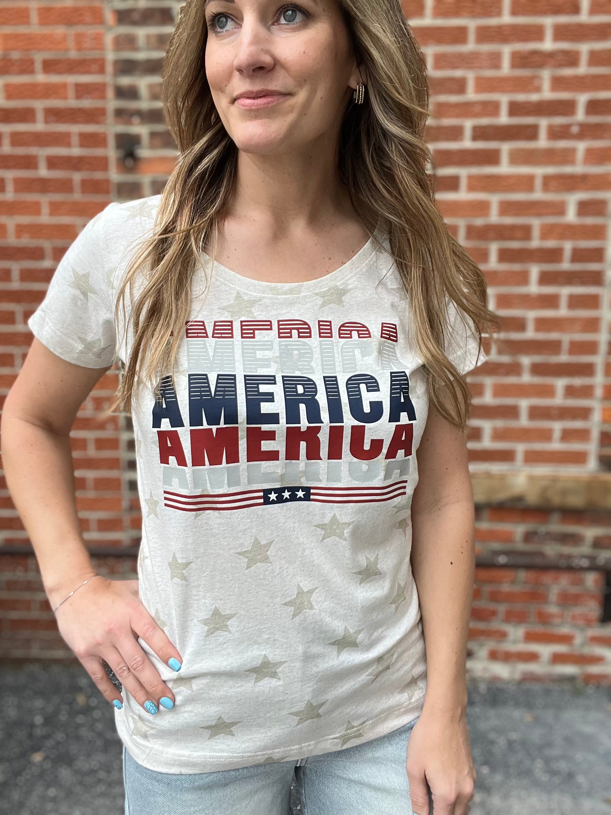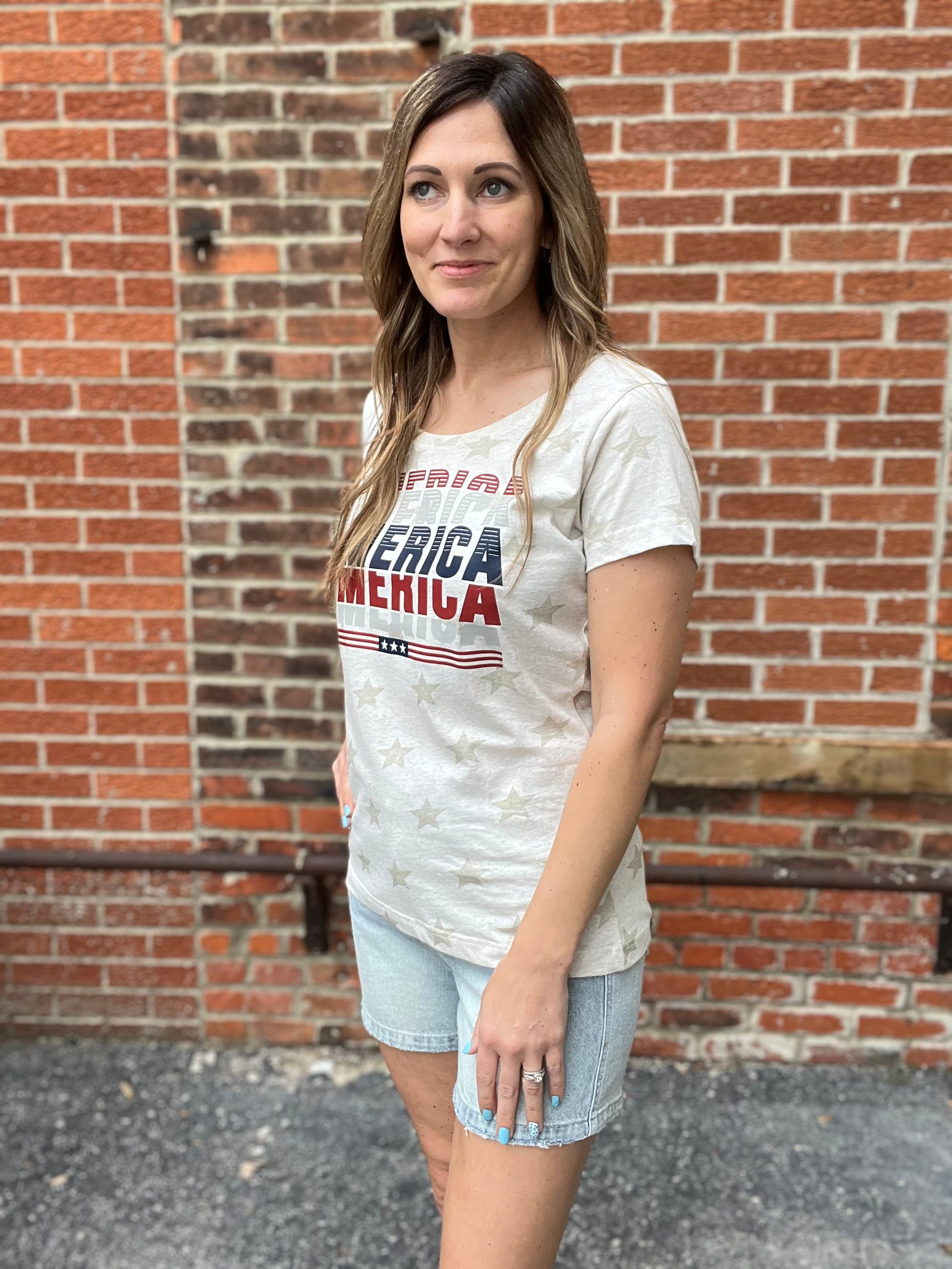 Show your red, white, and blue pride in this fun and festive star print tee! Featuring a stacked “AMERICA” graphic in bold patriotic colors and a soft beige background sprinkled with subtle tonal stars, this tee is perfect for celebrating the Fourth of July, Memorial Day, or any day you’re feeling all American. With a relaxed fit and lightweight feel, it’s made for comfort and laid back style all summer long.
