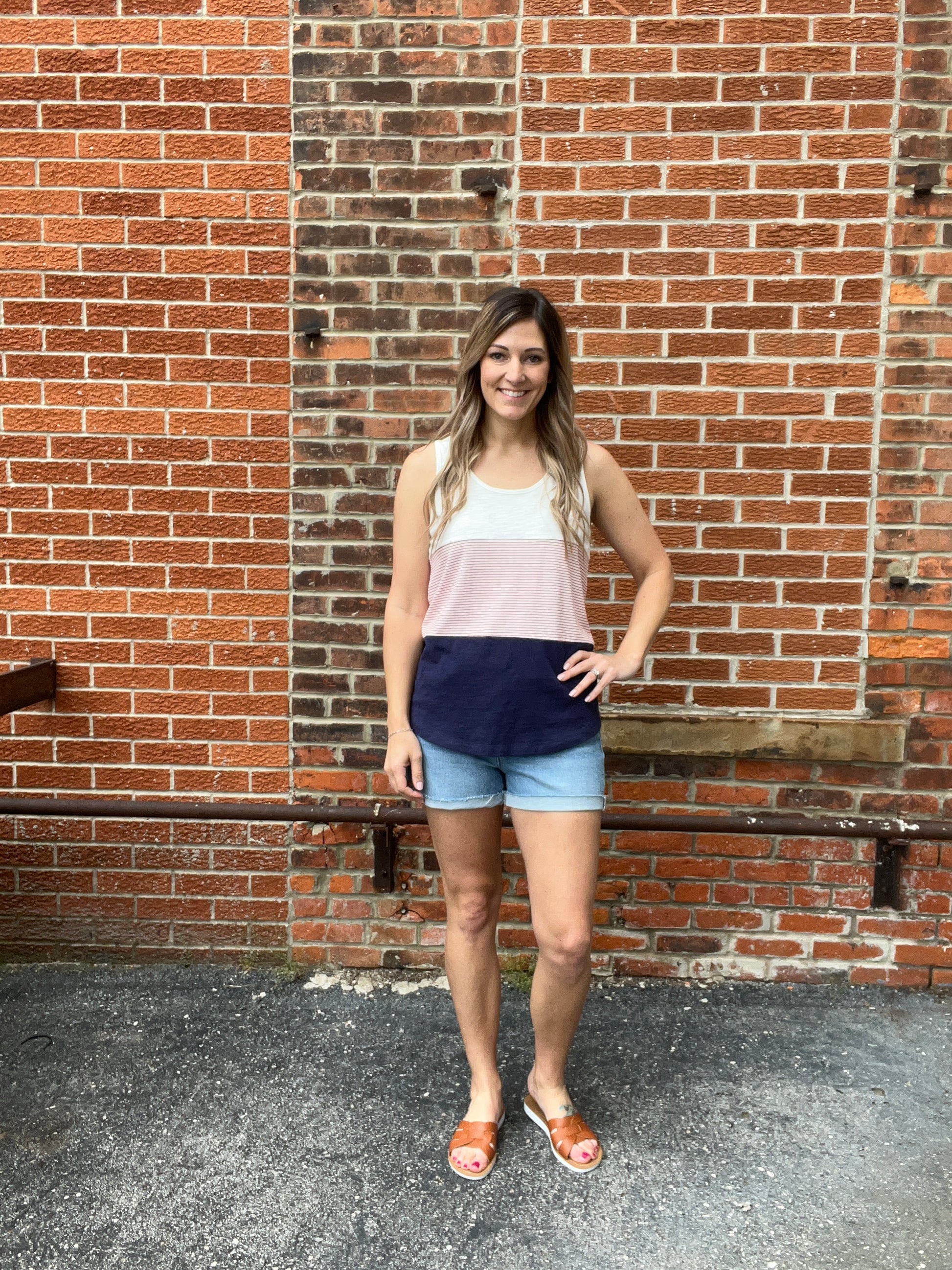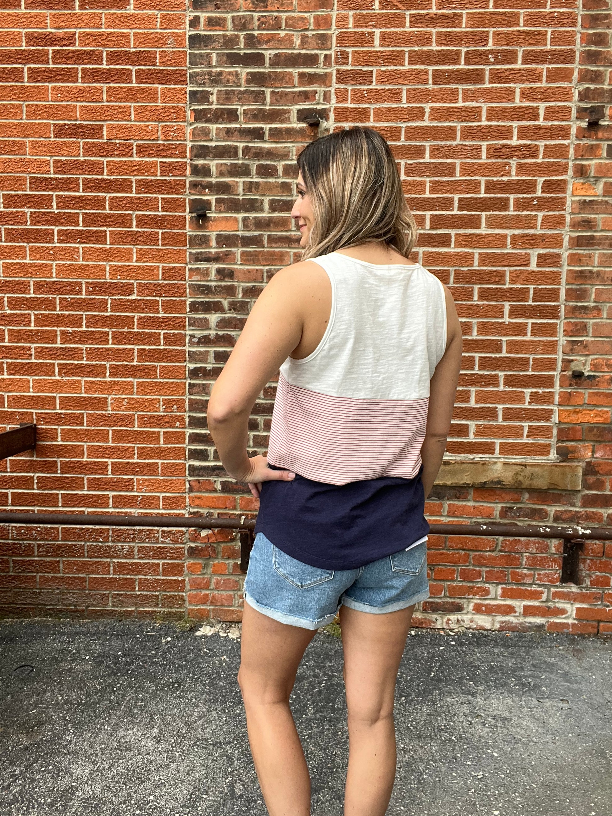 Show your American pride in style with our patriotic sleeveless tank! This color block beauty features classic navy, red, and crisp ivory, adorned with charming pinstripes for an extra touch of flair. Perfect for celebrating Independence Day or adding a pop of patriotism to any summer ensemble, this tank is a must-have for any fashion-forward patriot. Stay chic and stylish while showing off your love for the red, white, and blue!