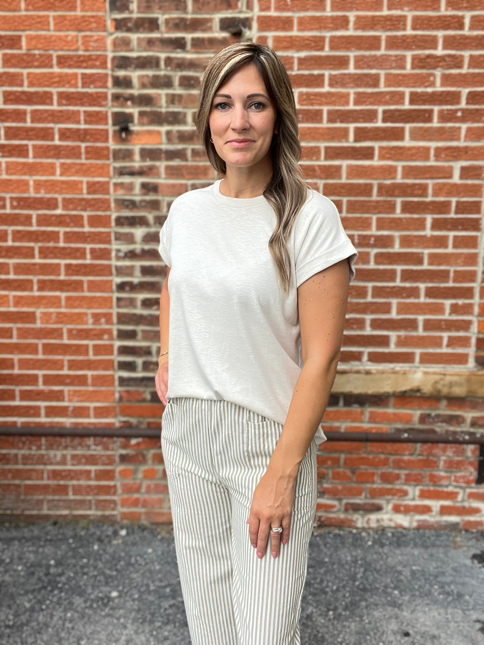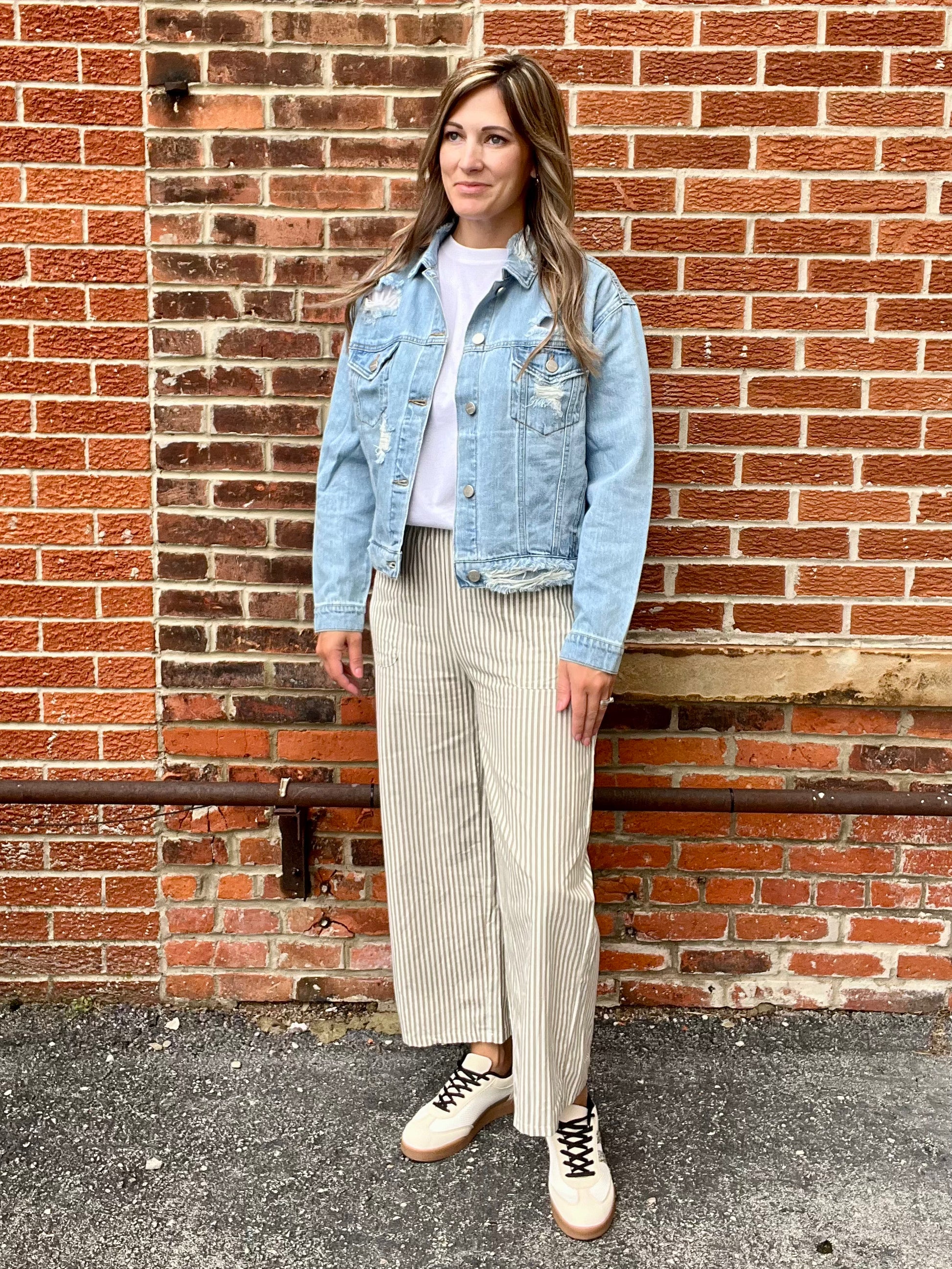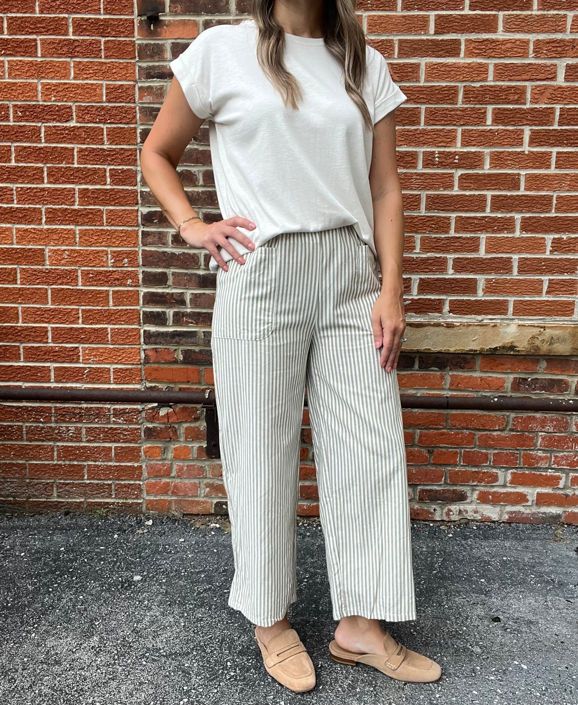 Make a statement in these green striped wide leg pants, designed for both comfort and style. With a relaxed, fashion forward silhouette and casual pocket detail, they blend effortless ease with everyday chic. Perfect for dressing up or down, these pants pair beautifully with simple tops for an elevated yet laid back look.