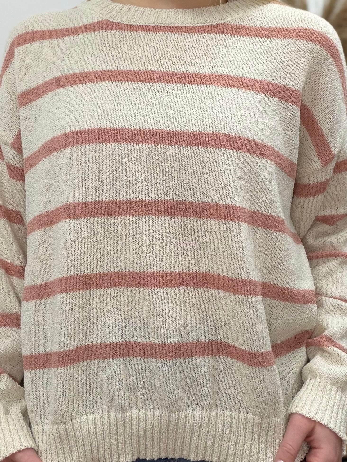 The soft blush striped knit sweater has a relaxed silhouette with long sleeves and a cuffed bottom hem for an effortless, laid back look.