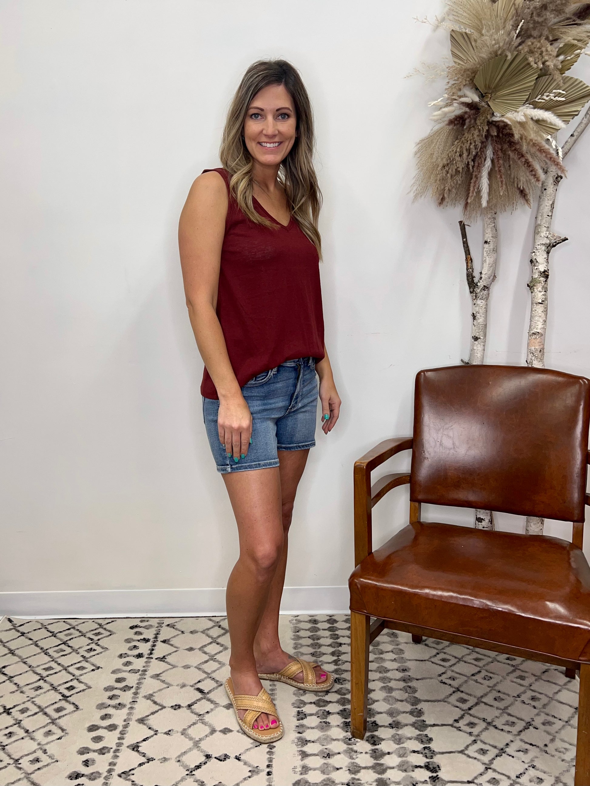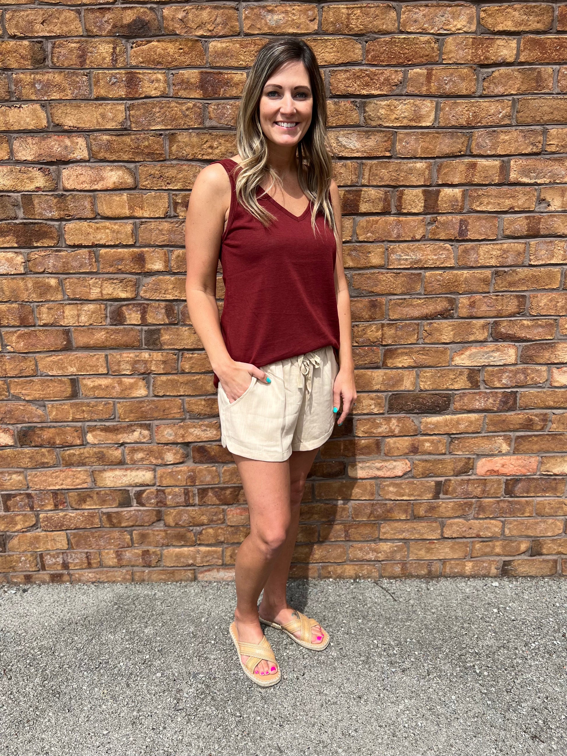 Burgundy V Neck Sleeveless Knit Top With Open Back Detail.