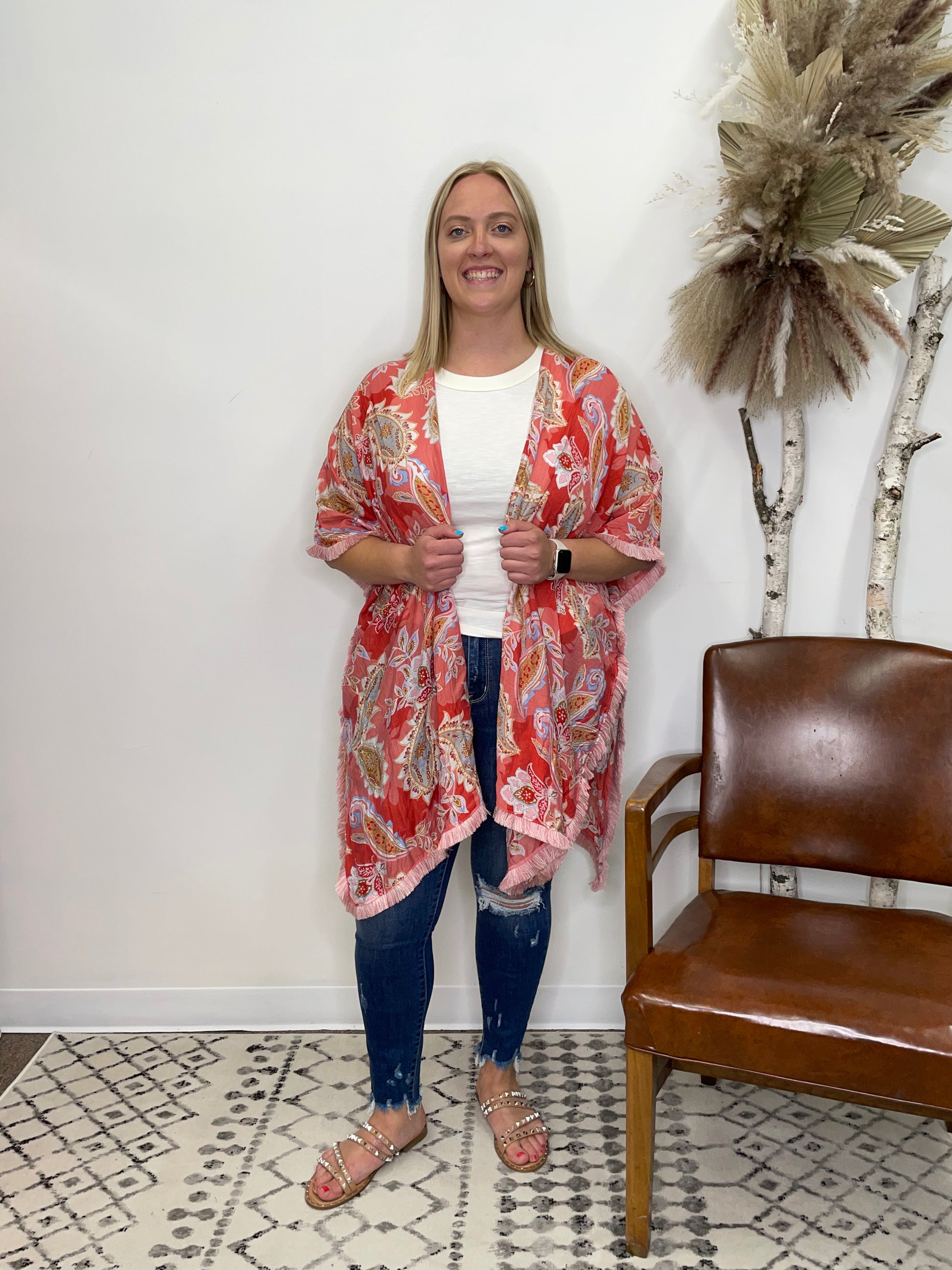 A stunning layering piece with a boho chic vibe! Featuring a gorgeous paisley print in shades of coral, pink, blue, and ivory, this kimono is accented with delicate fringe detailing for added movement and flair. Lightweight and flowy, it’s perfect for layering over your favorite outfit, whether you’re heading to the beach, a brunch, or a summer festival. Effortless style, endless possibilities!