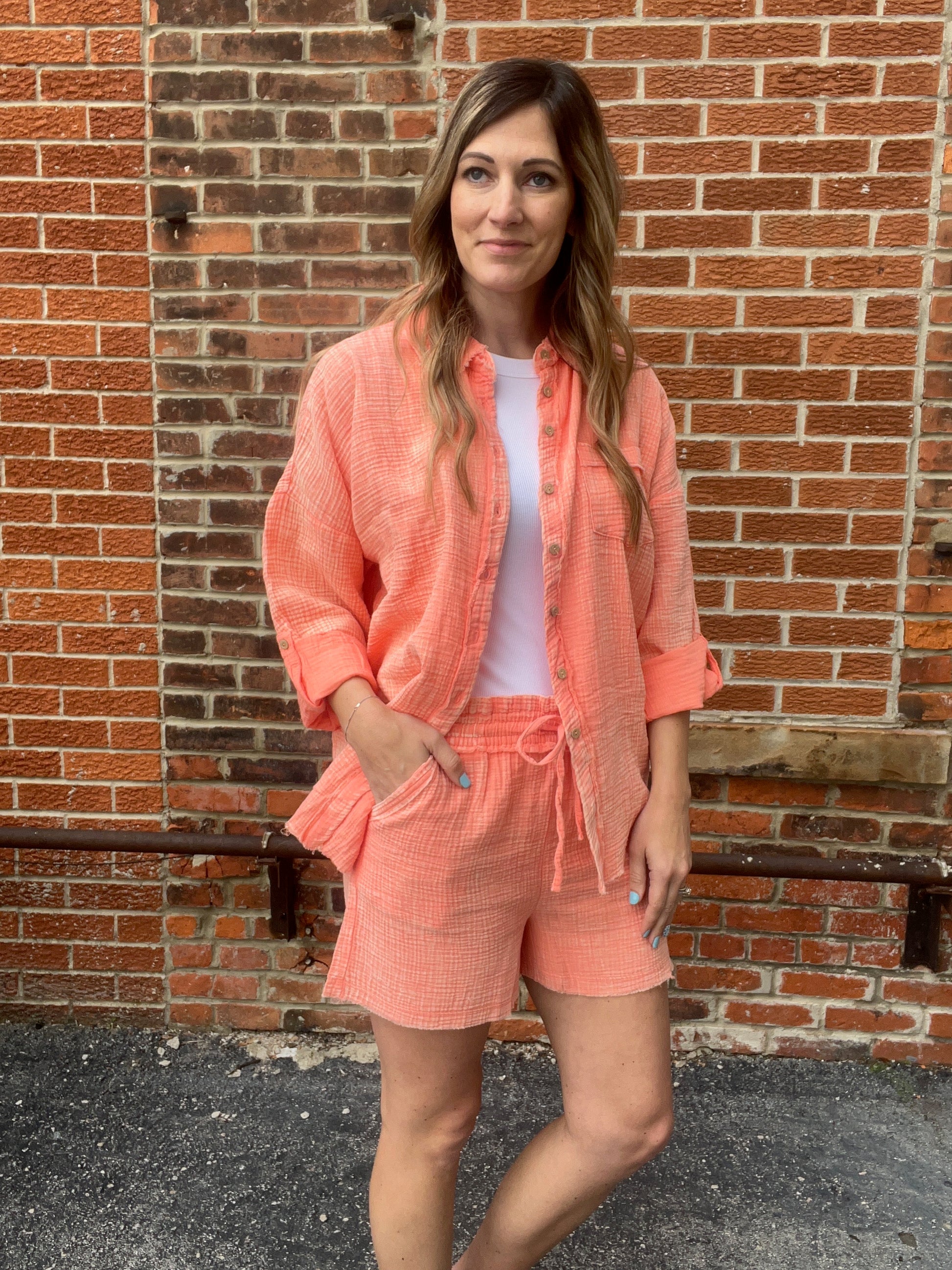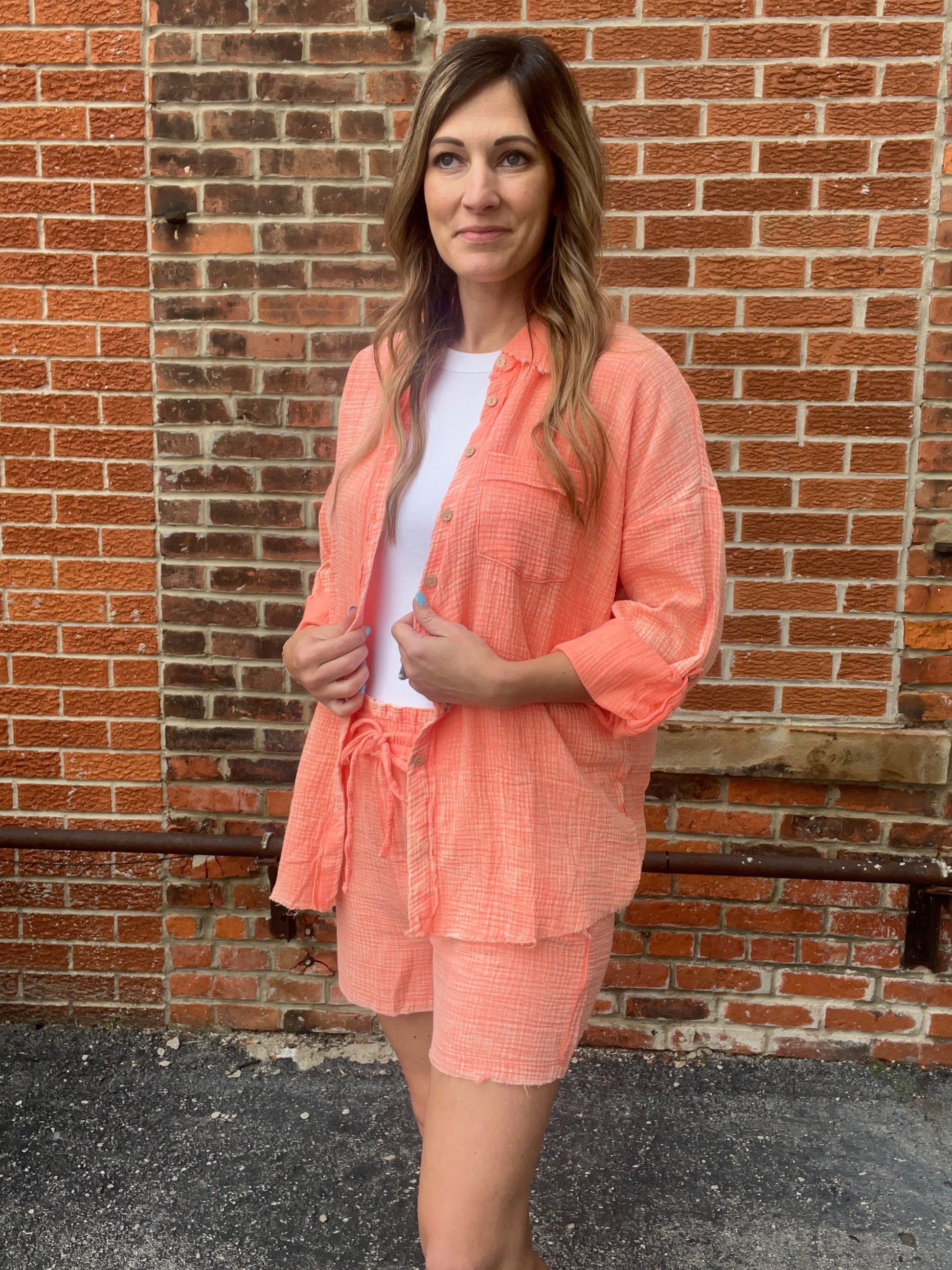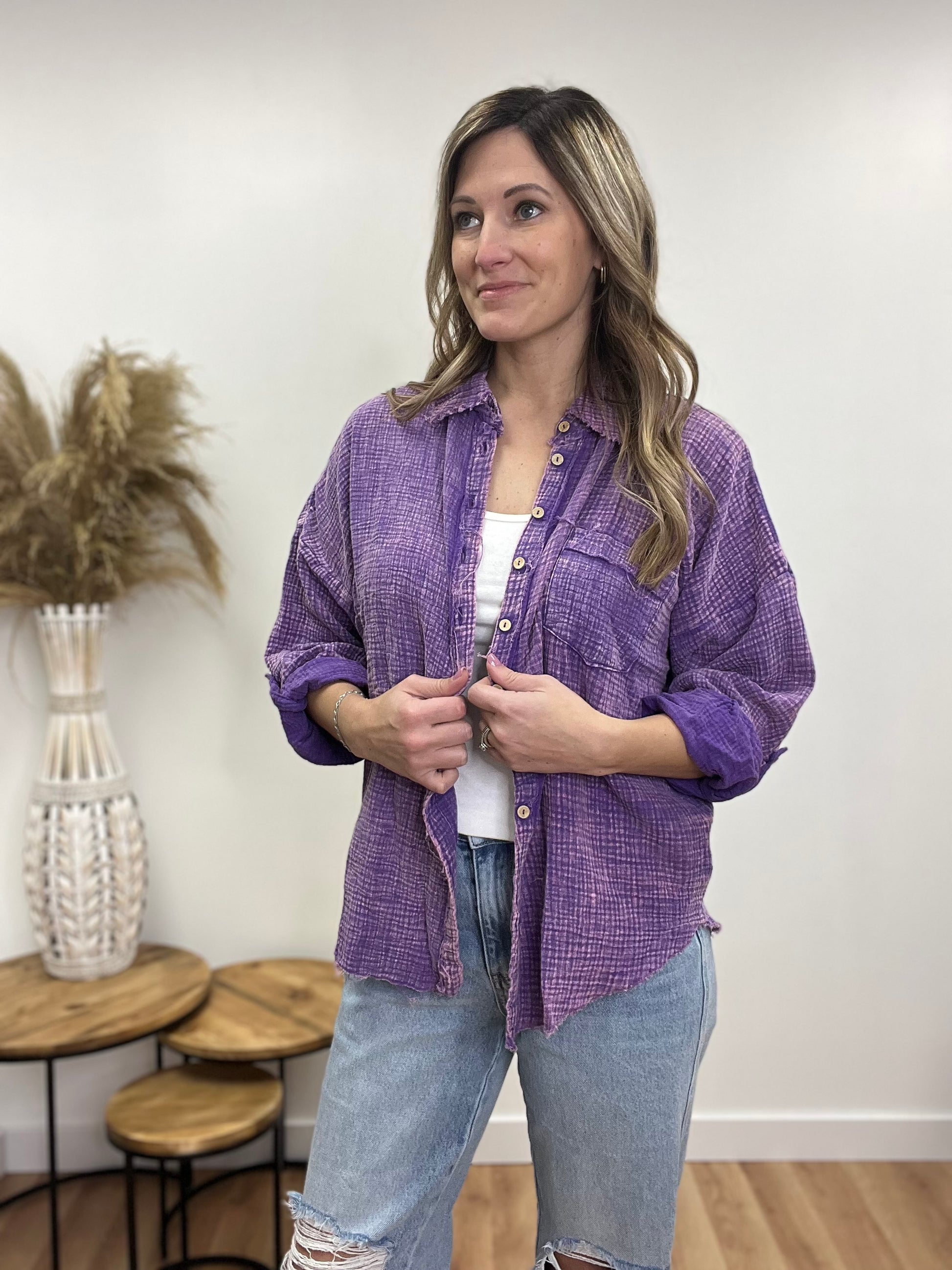 This gauze button-down top is a lightweight and breathable wardrobe essential, perfect for layering or wearing on its own. Featuring a soft crinkled texture, raw-edge detailing for a relaxed look, and it combines effortless style with comfort. Complete with a front chest pocket, button cuffs, and a curved hem, this versatile shirt is available in multiple colors to suit any mood or season. Ideal for casual days, beach outings, or layering over a tank.