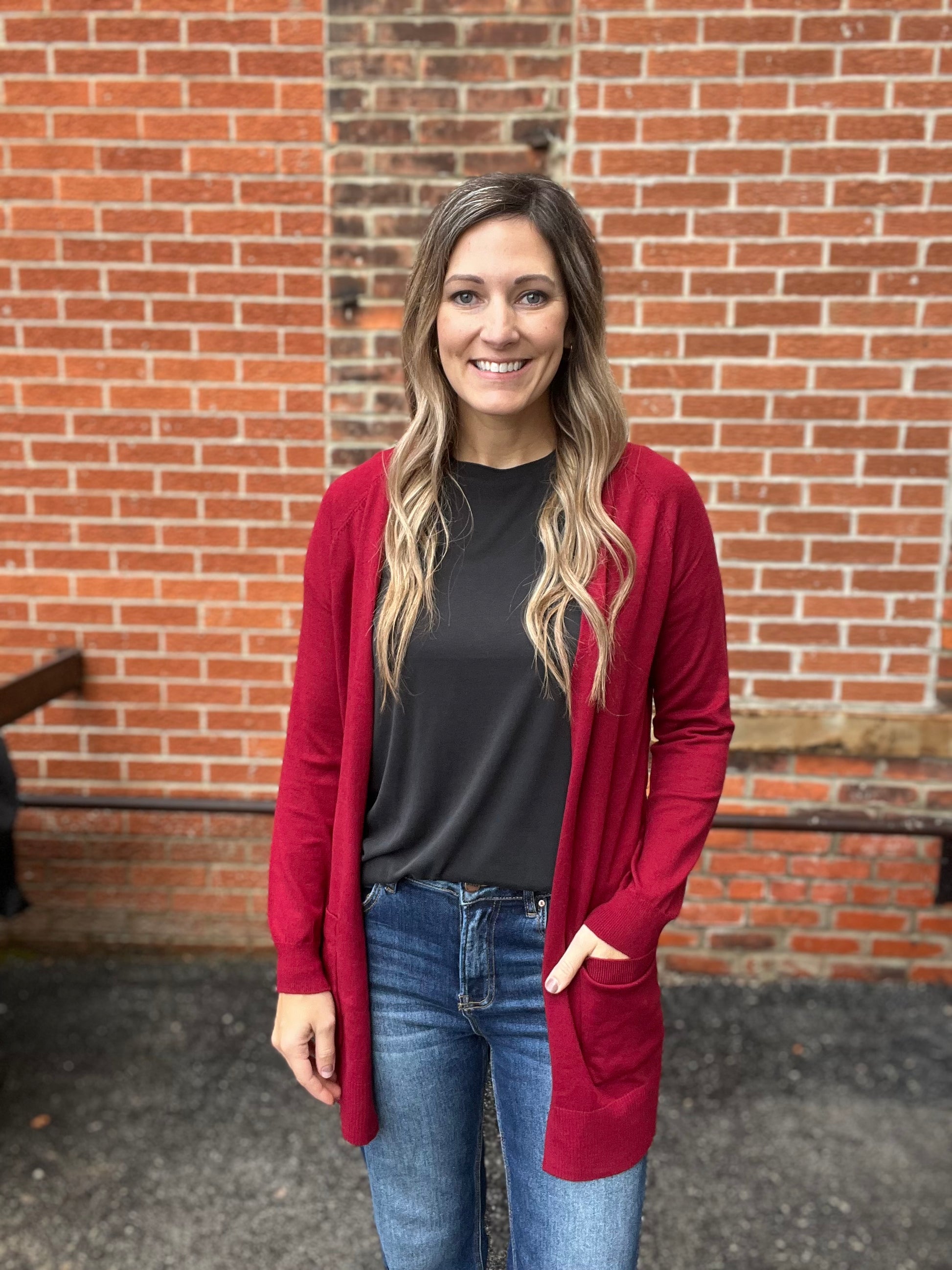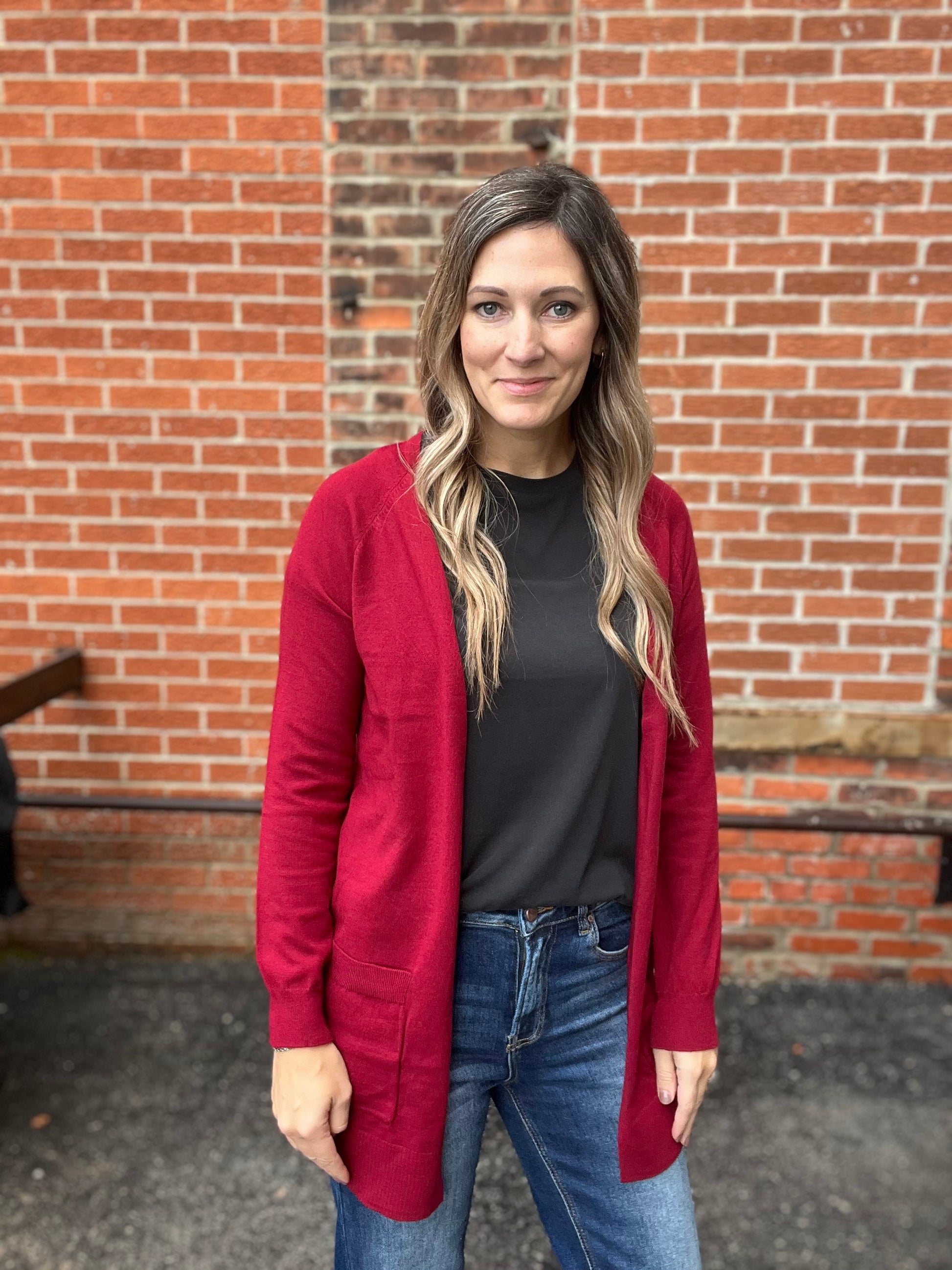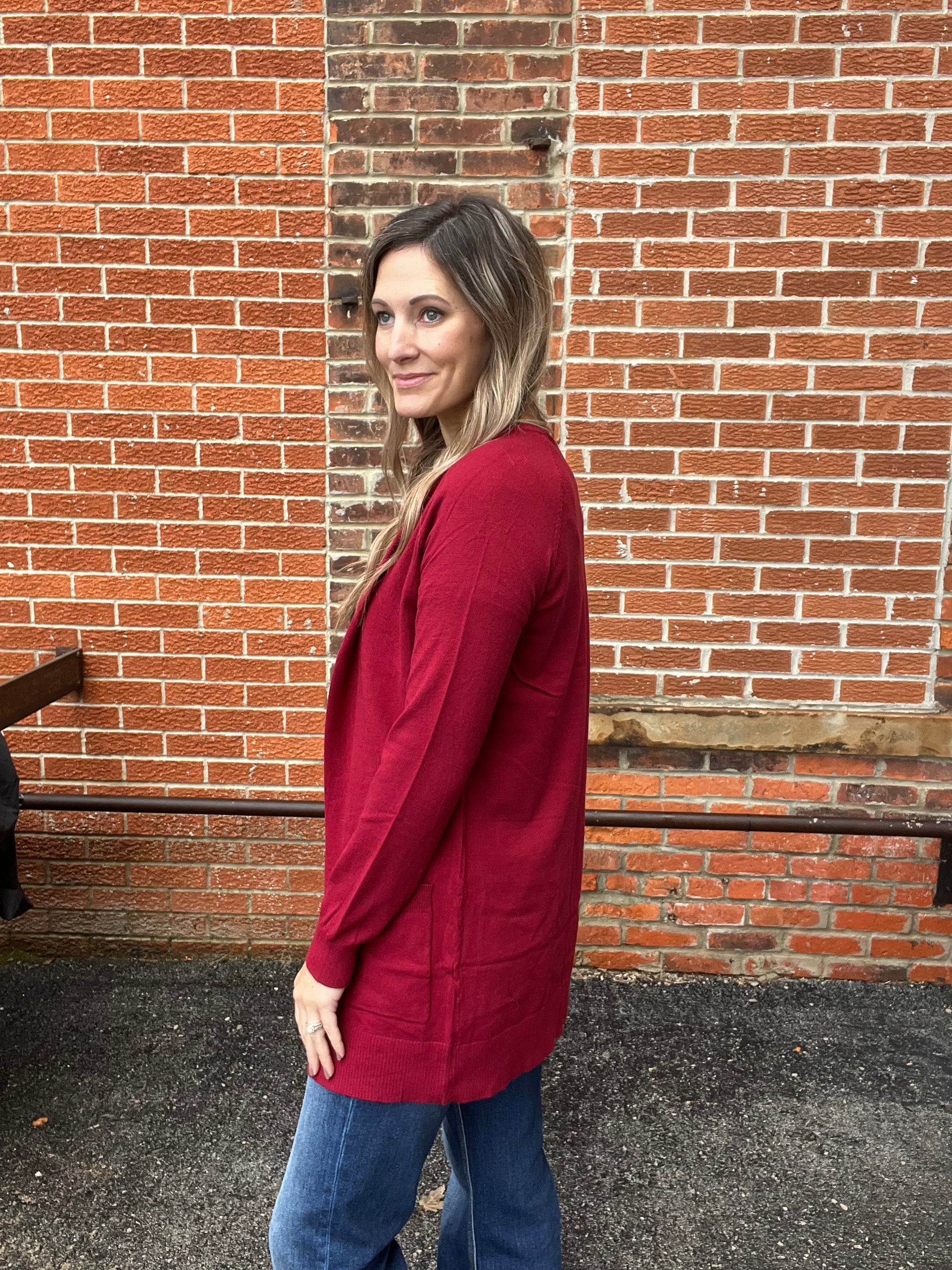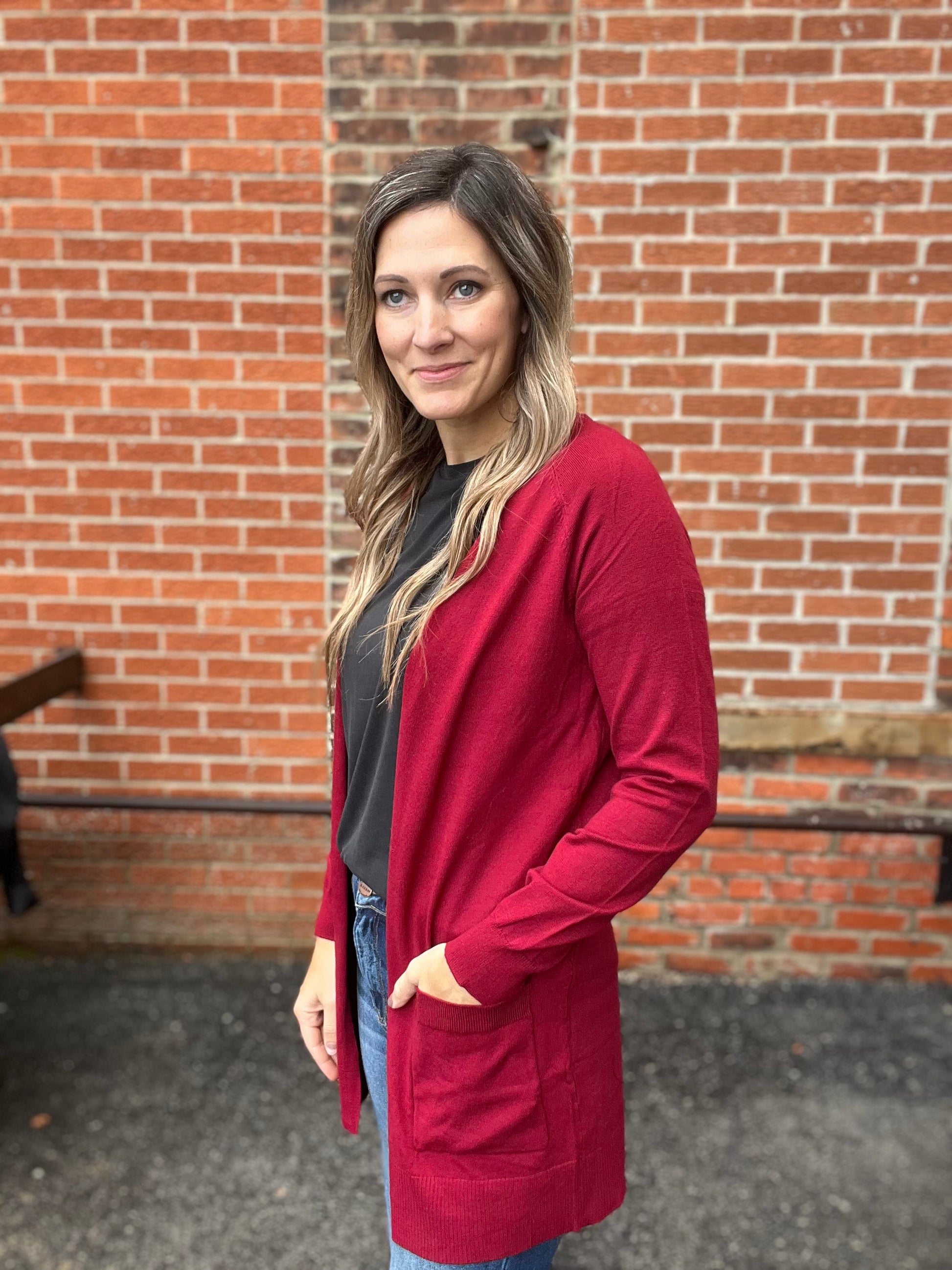 A lightweight wine-colored cardigan with a soft, breathable fabric that drapes elegantly. This cardigan has a rich, deep hue that adds a sophisticated touch to any outfit. The open-front design makes it easy to layer over tops, while the long sleeves and relaxed fit add to its effortless style. The fabric is thin but cozy, perfect for adding a light layer on cooler days without feeling bulky. Its versatile color and airy feel make it suitable for both casual and dressier looks.