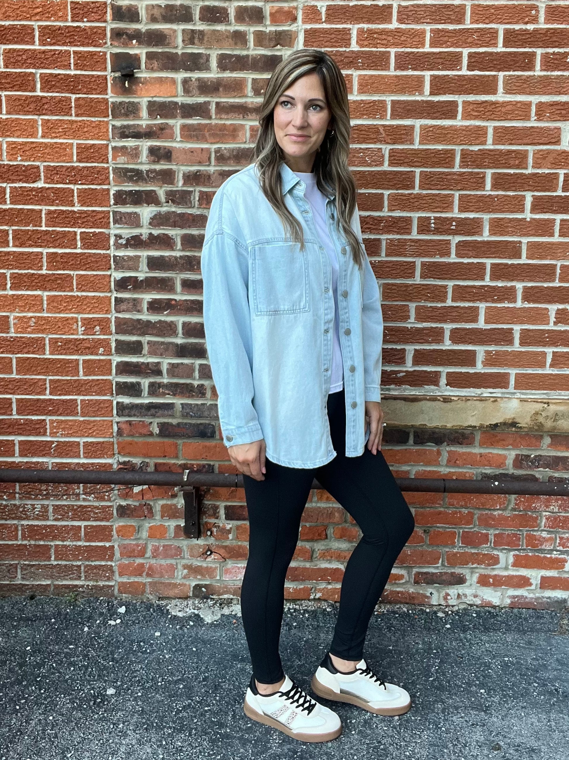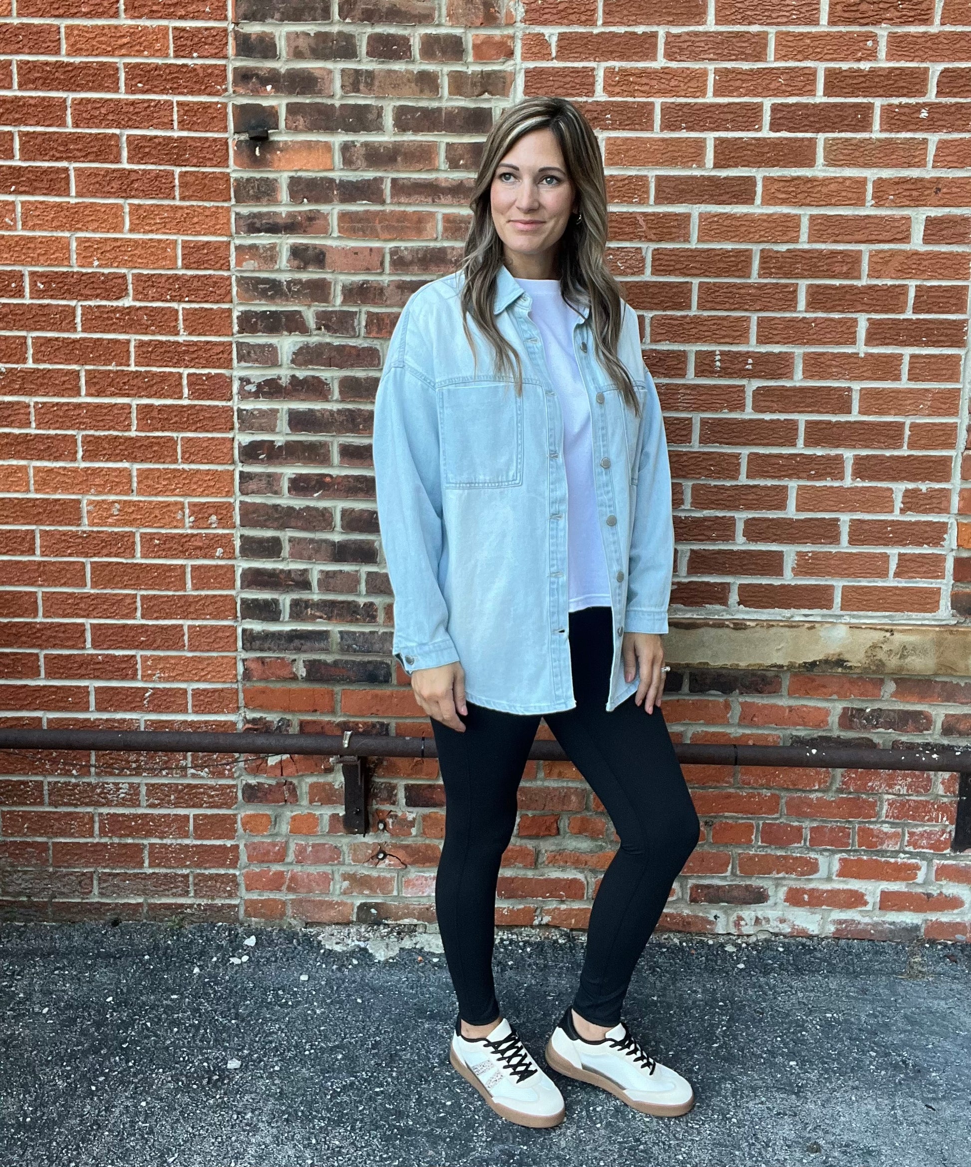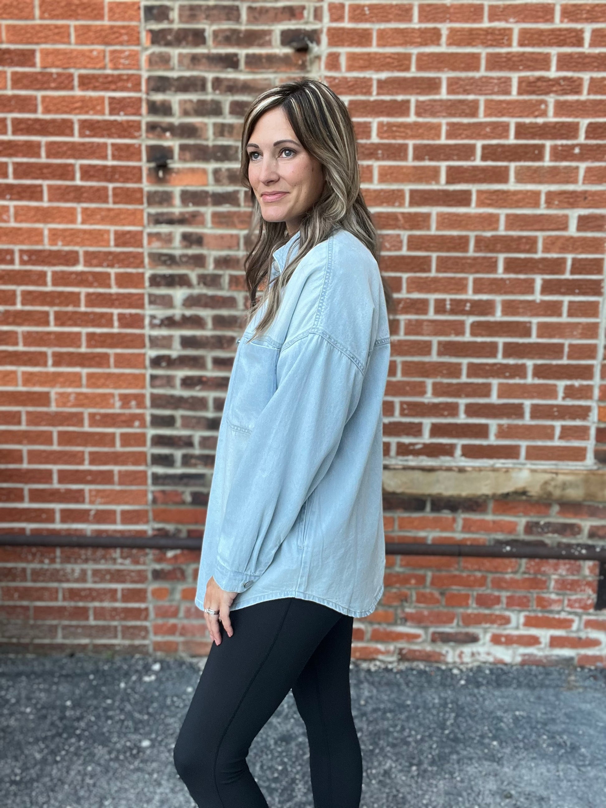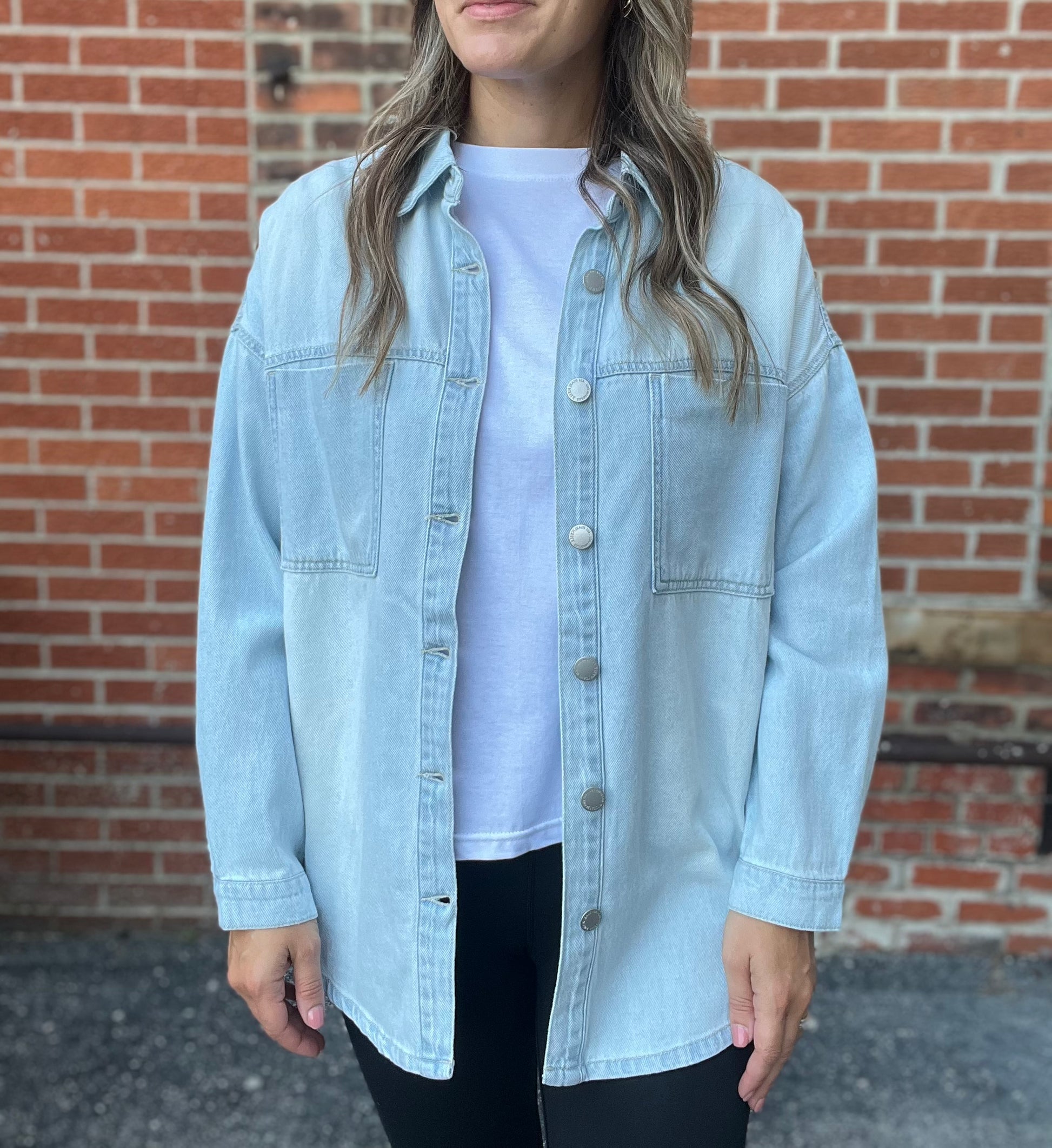 This lightweight oversized denim shacket combines the best of a shirt and jacket with a relaxed fit and light wash. Designed with stylish shaped front pockets, it adds subtle structure and effortless cool to your layering game.