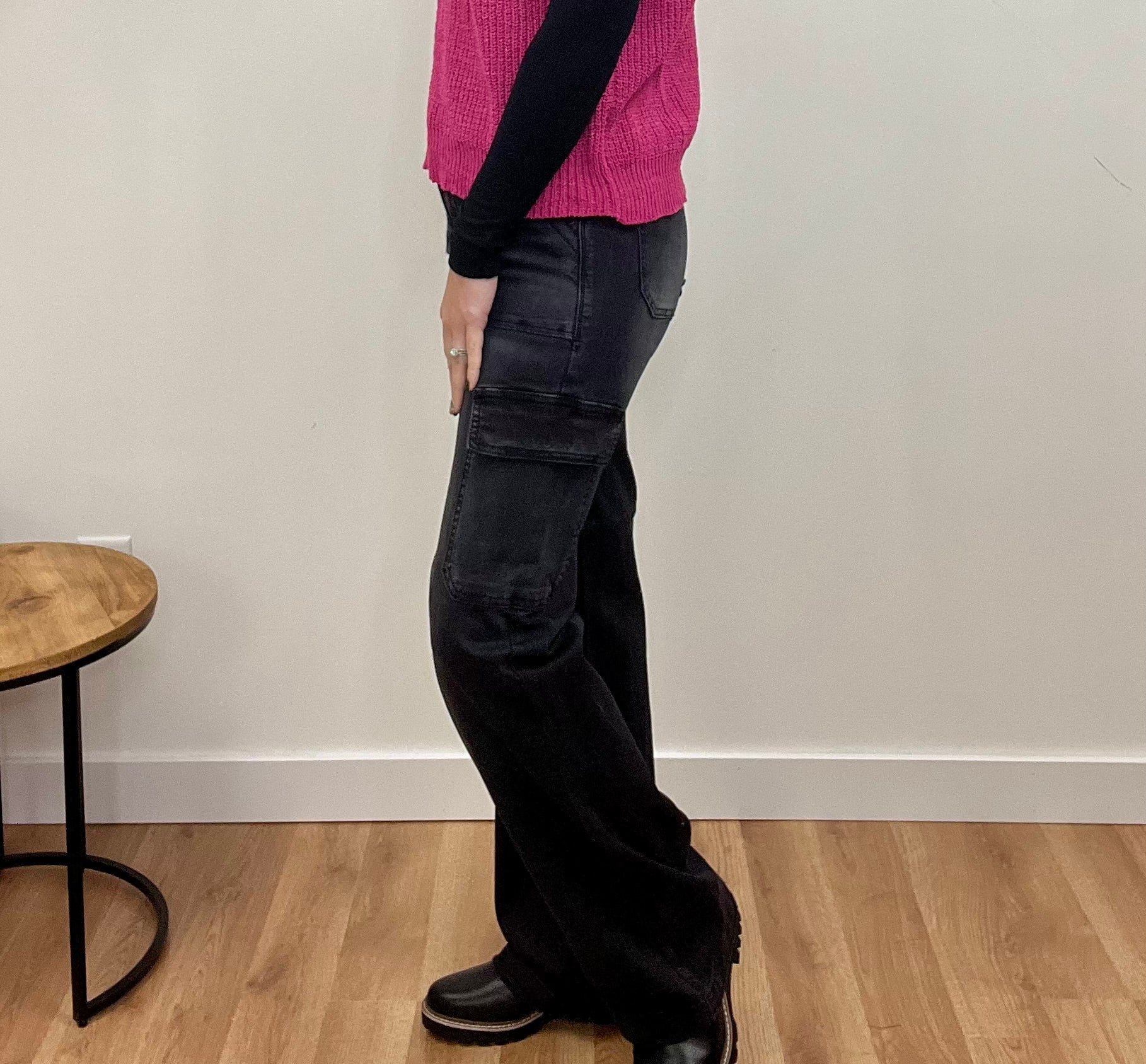 A pair of sleek black wide-leg jeans designed for both style and functionality. Featuring a contemporary loose fit, these jeans offer a relaxed silhouette that blends comfort with edgy fashion. The standout detail is the cargo pocket on the side, adding a utilitarian touch that’s perfect for carrying small essentials. Made from durable denim, these versatile jeans can be dressed up with a fitted top and boots or kept casual with a graphic tee and sneakers. Ideal for those seeking a bold and trendy look.