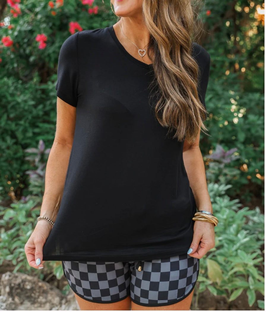 We know we're always on the lookout for a good, comfy basic! This basic tee is definitely one of those pieces! It's comfy and a perfect fit that makes it so easy to wear and the colors make styling and layering it a breeze! This top features short sleeves, a v neck, and a rounded hemline.