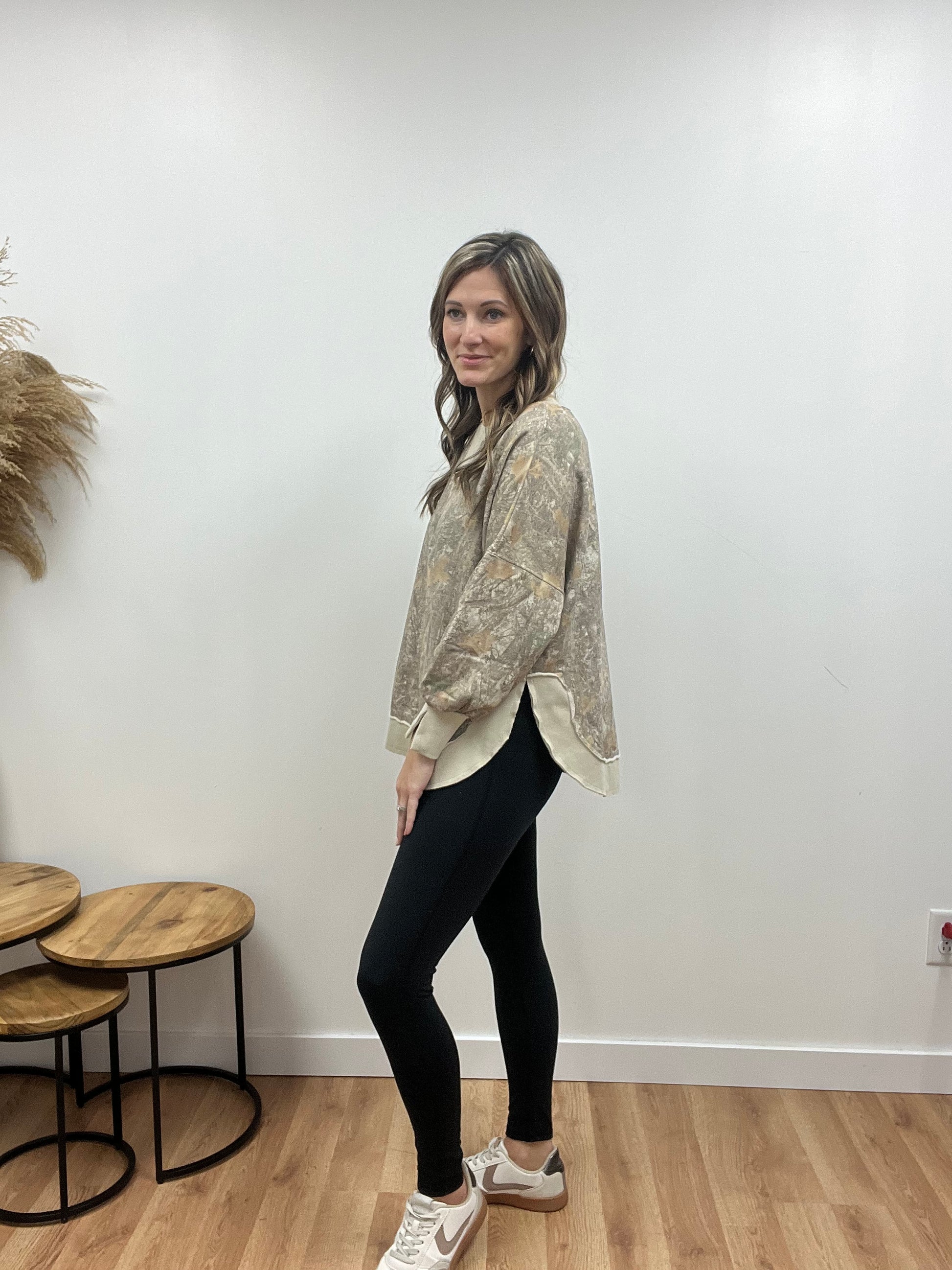 A cozy camo crewneck featuring a classic round neckline and a rounded hem for a relaxed, easygoing fit. Perfect for everyday wear and effortless layering.