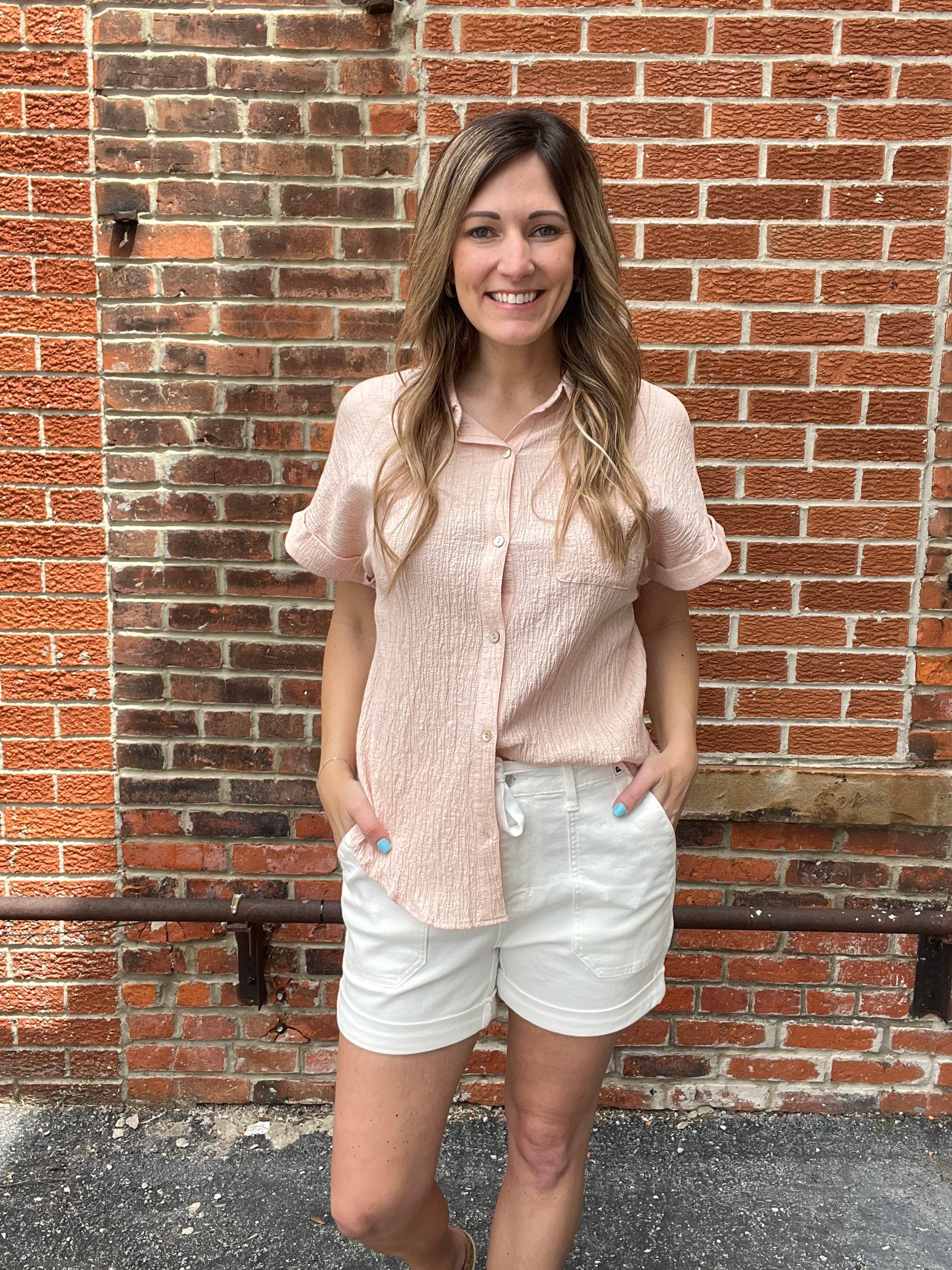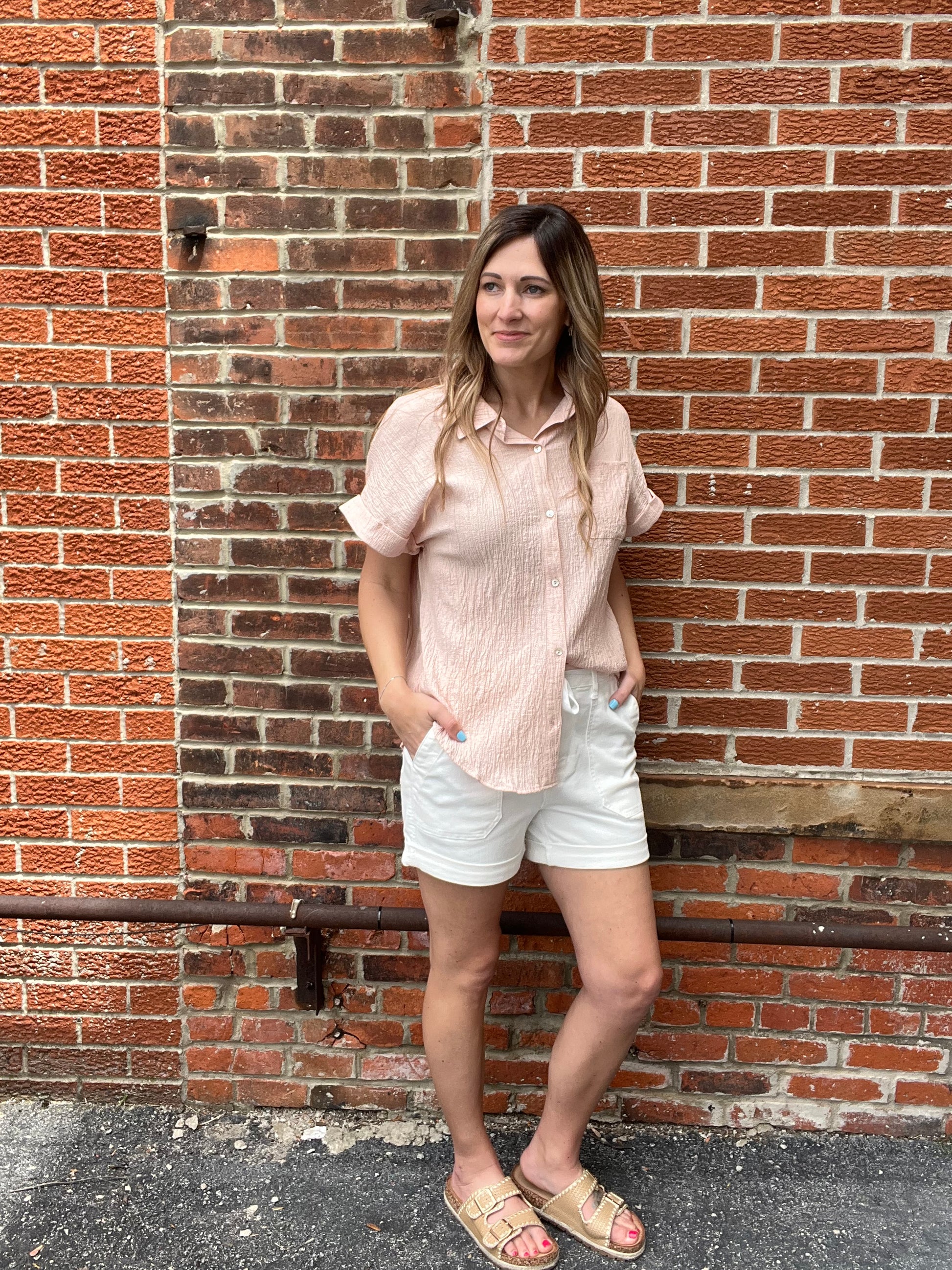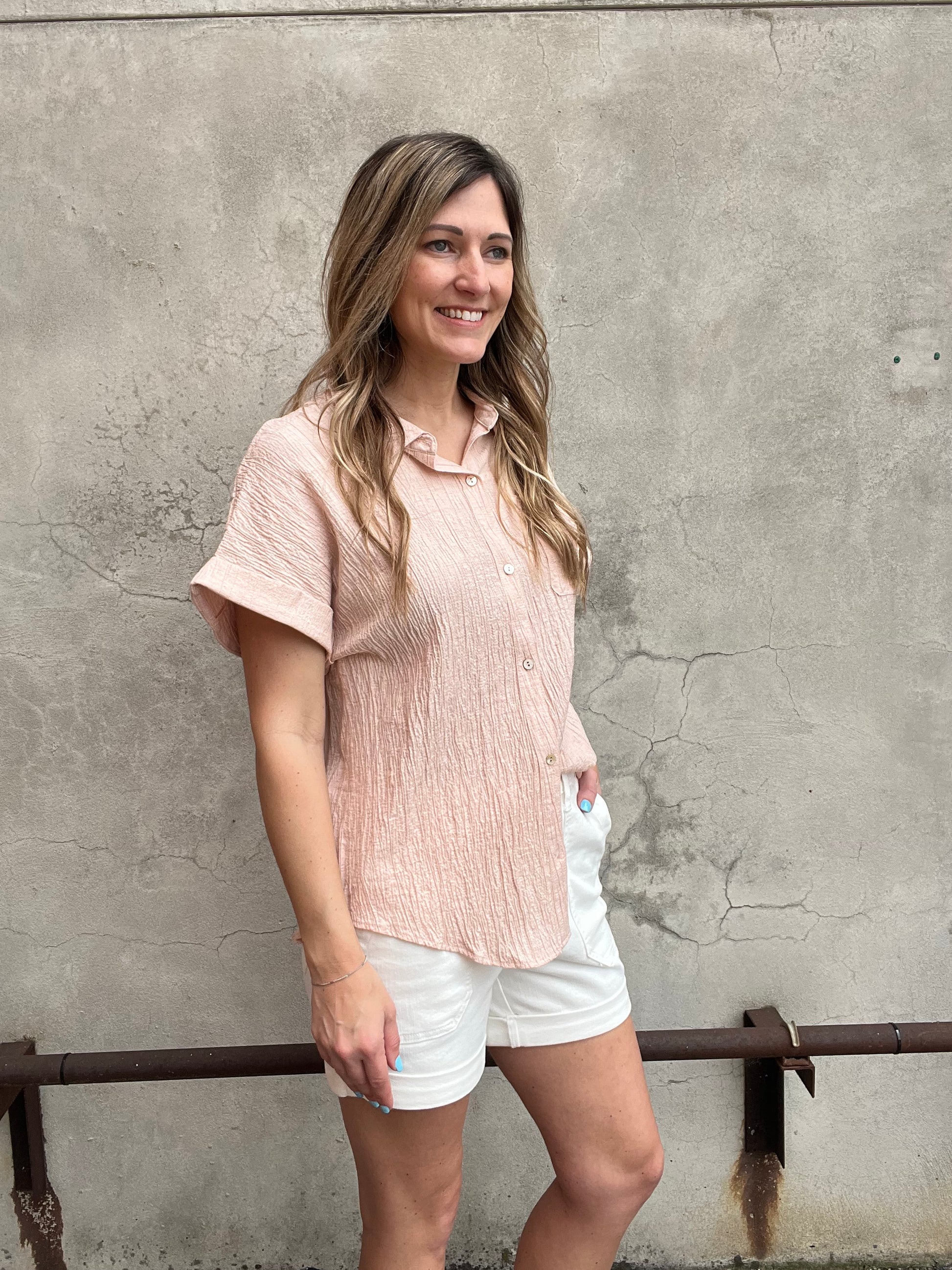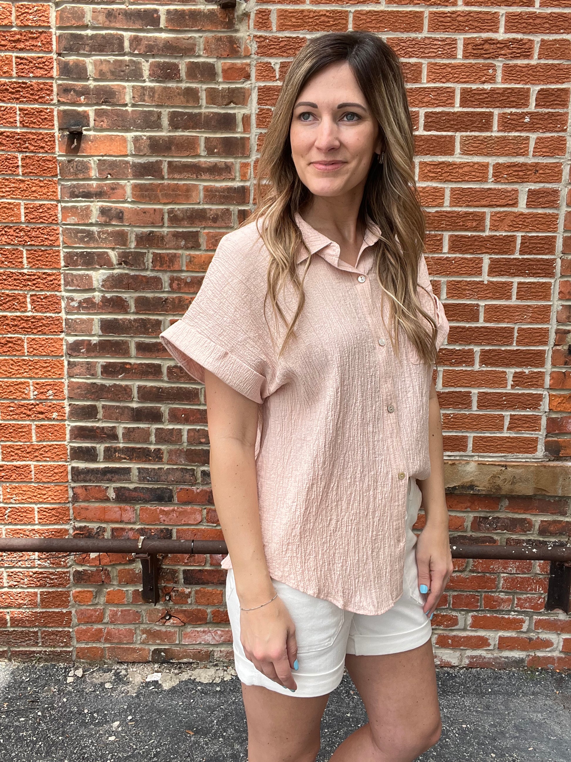 Textured blush button down short sleeve shirt featuring a relaxed fit, front chest pocket, and subtle woven detailing for an effortlessly stylish look.