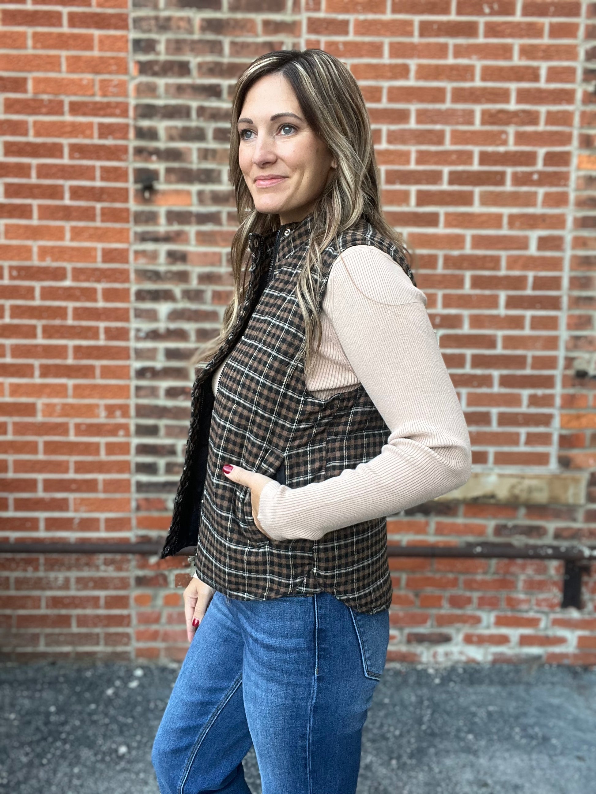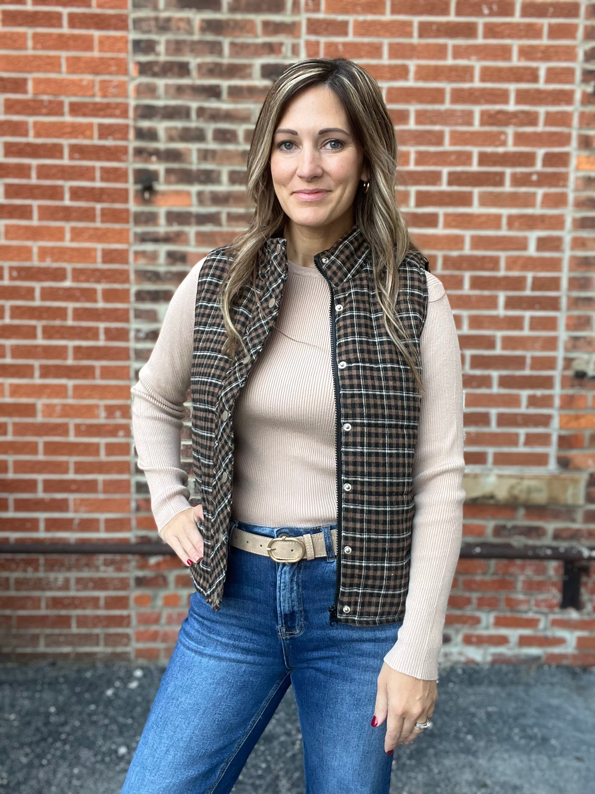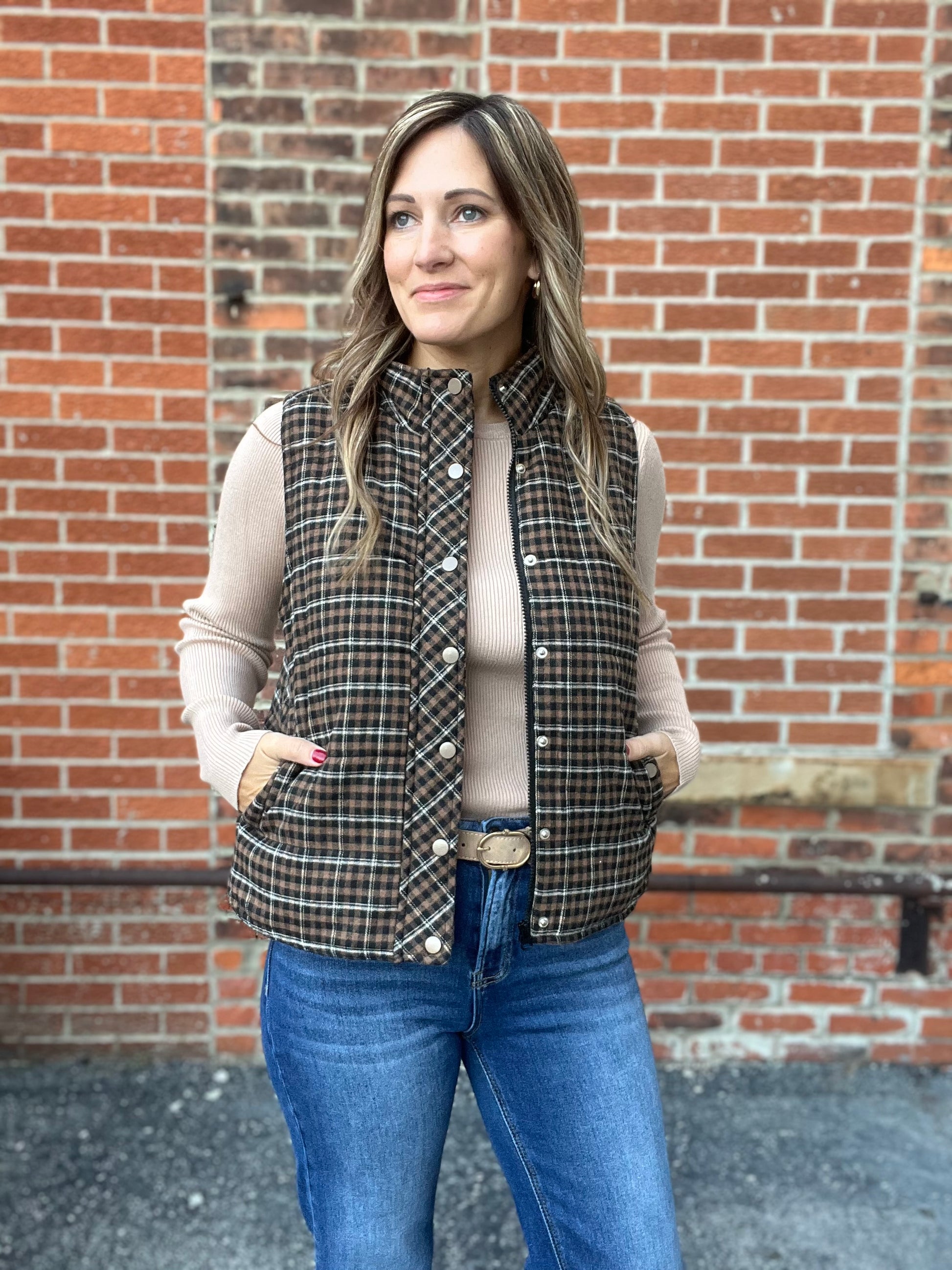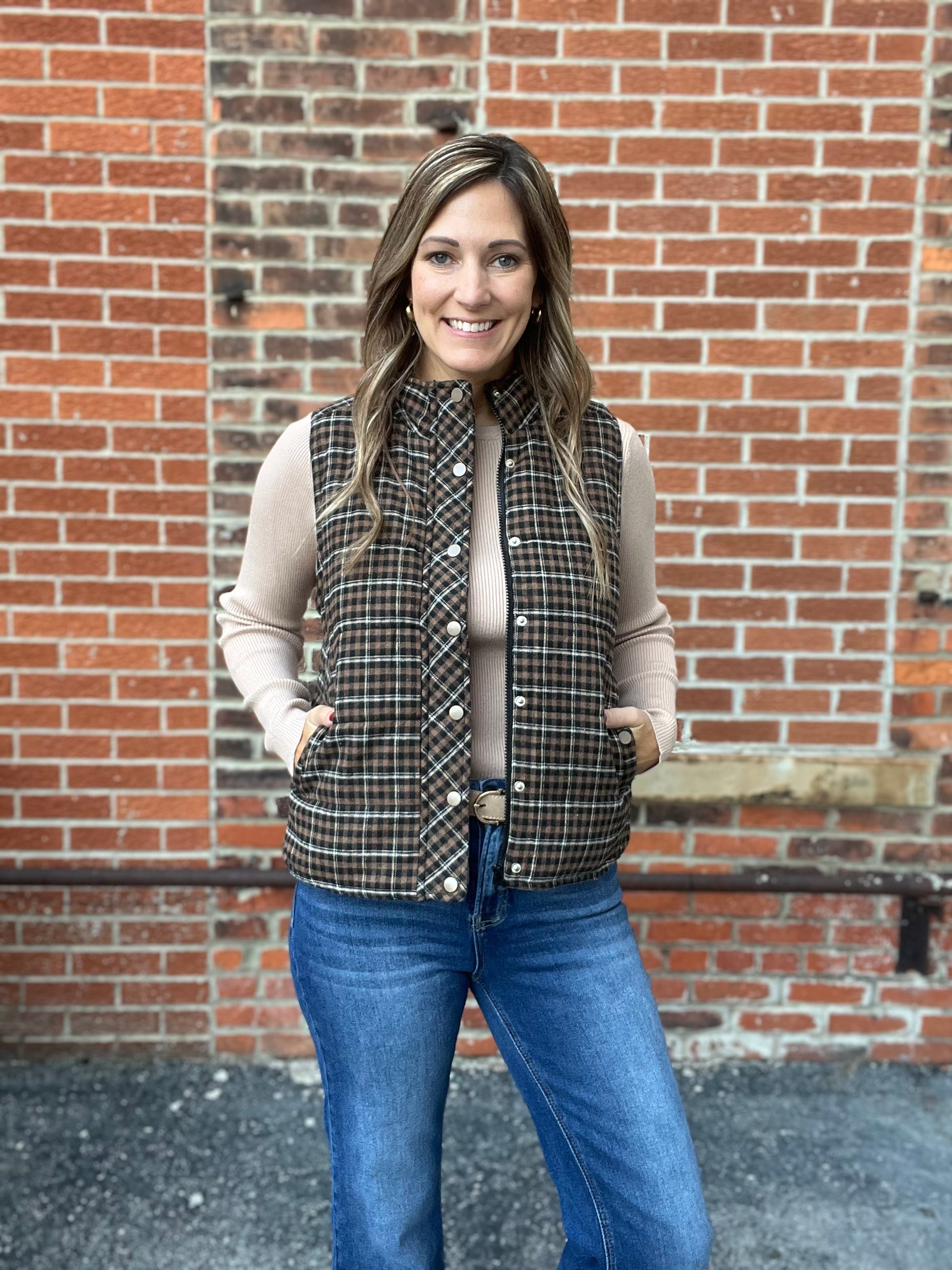 Stay warm in style with this black plaid puffer vest. Designed with a cozy mock neck, hidden zipper, and snap button closure, it combines function with fashion. The quilted puffer design adds lightweight warmth, while the convenient side pockets keep your hands toasty or essentials close by. A versatile layering piece that’s perfect for chilly days, casual outings, or elevating your everyday look.