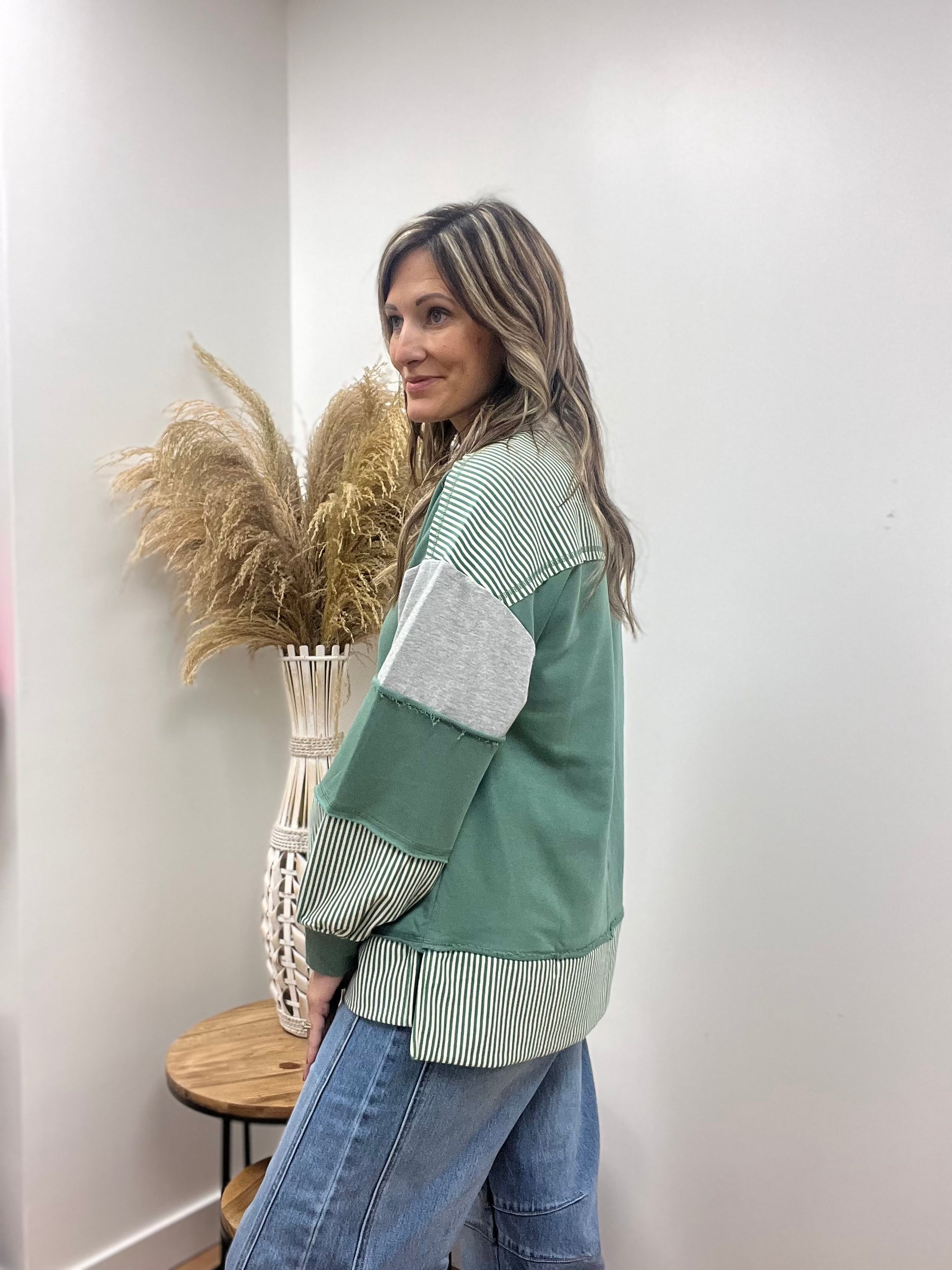 This cozy color block pullover features a fresh sage and crisp white combo for a modern, relaxed look. Soft and comfortable, it’s perfect for layering or wearing on its own for effortless style.