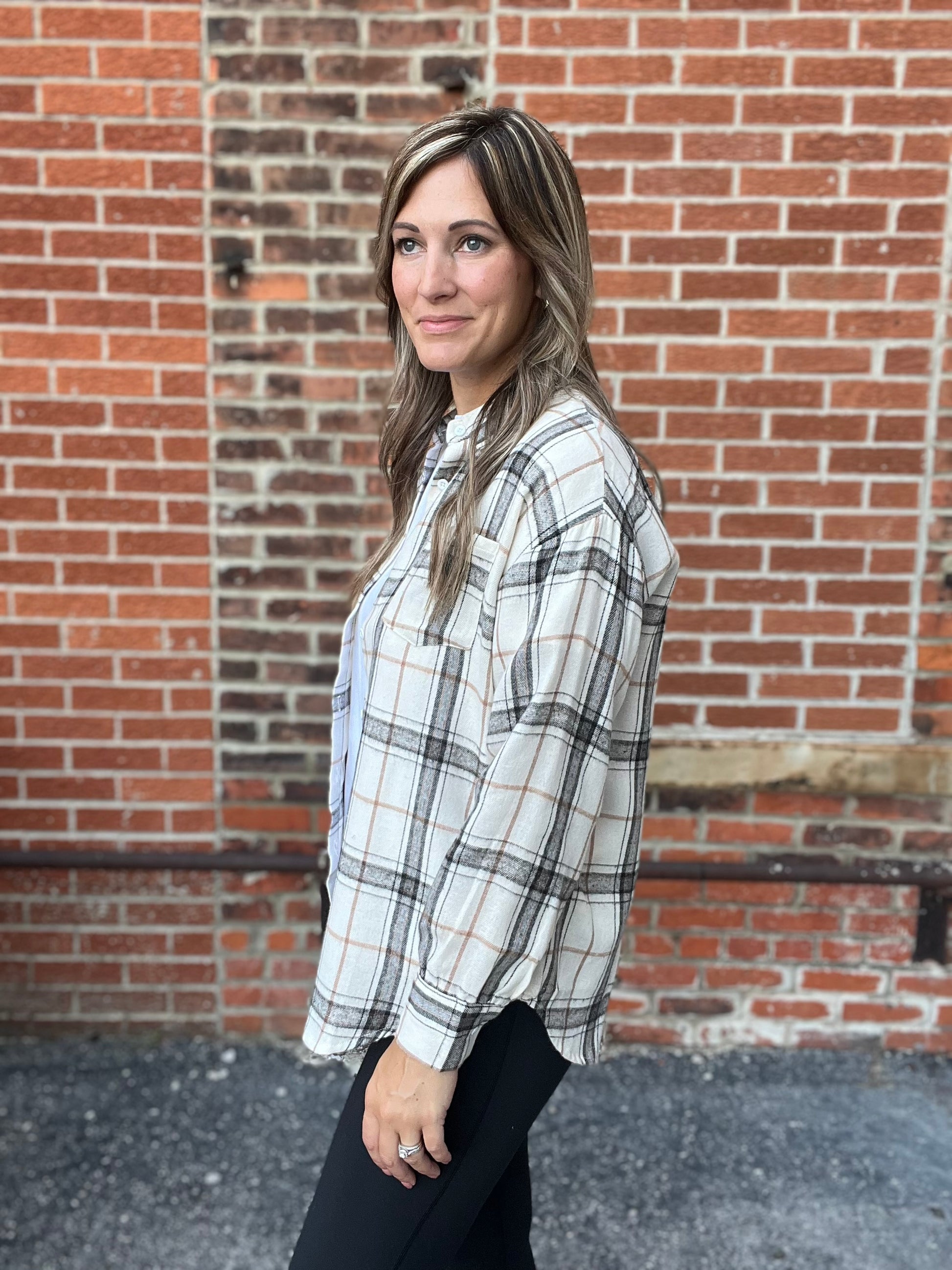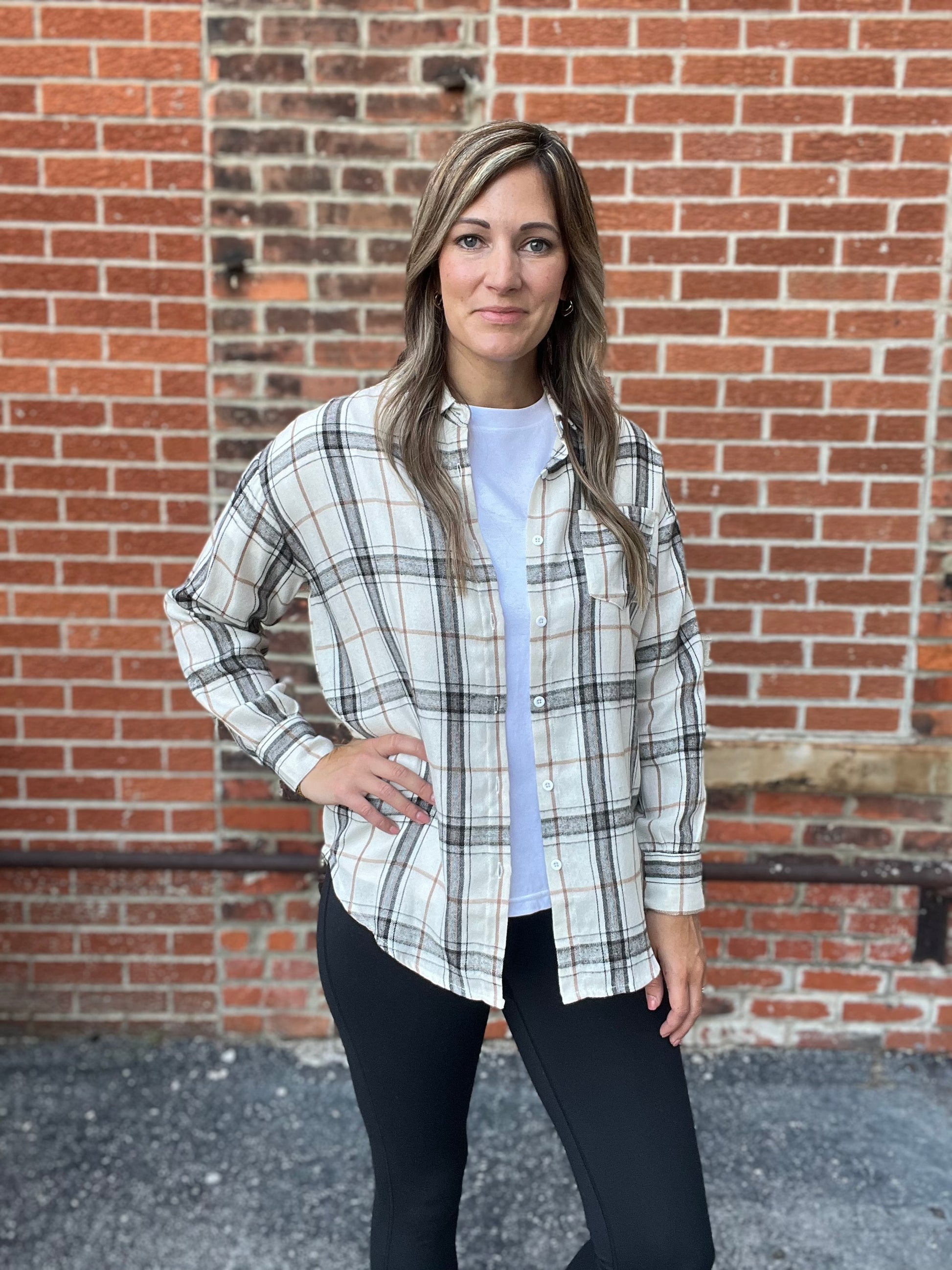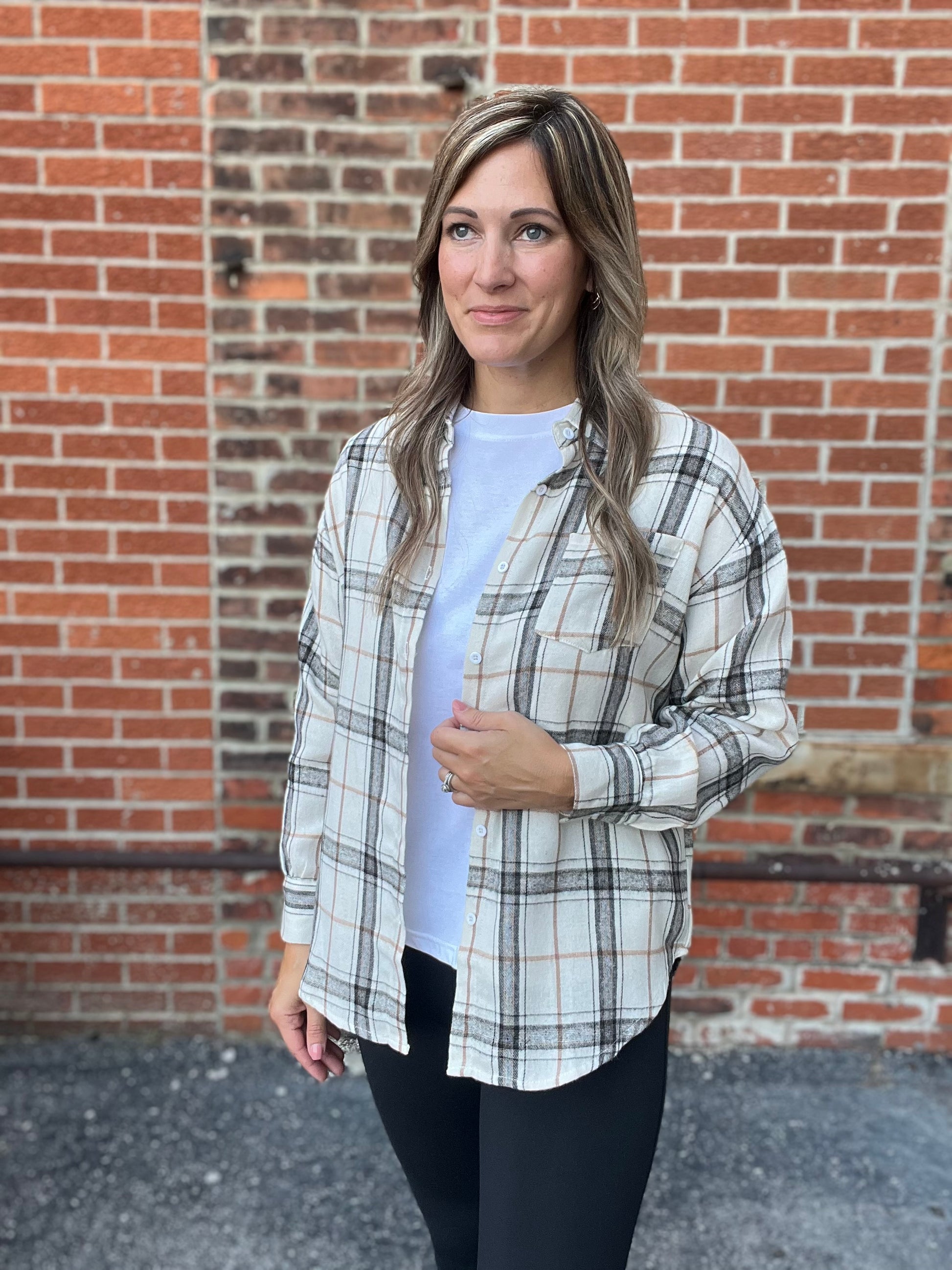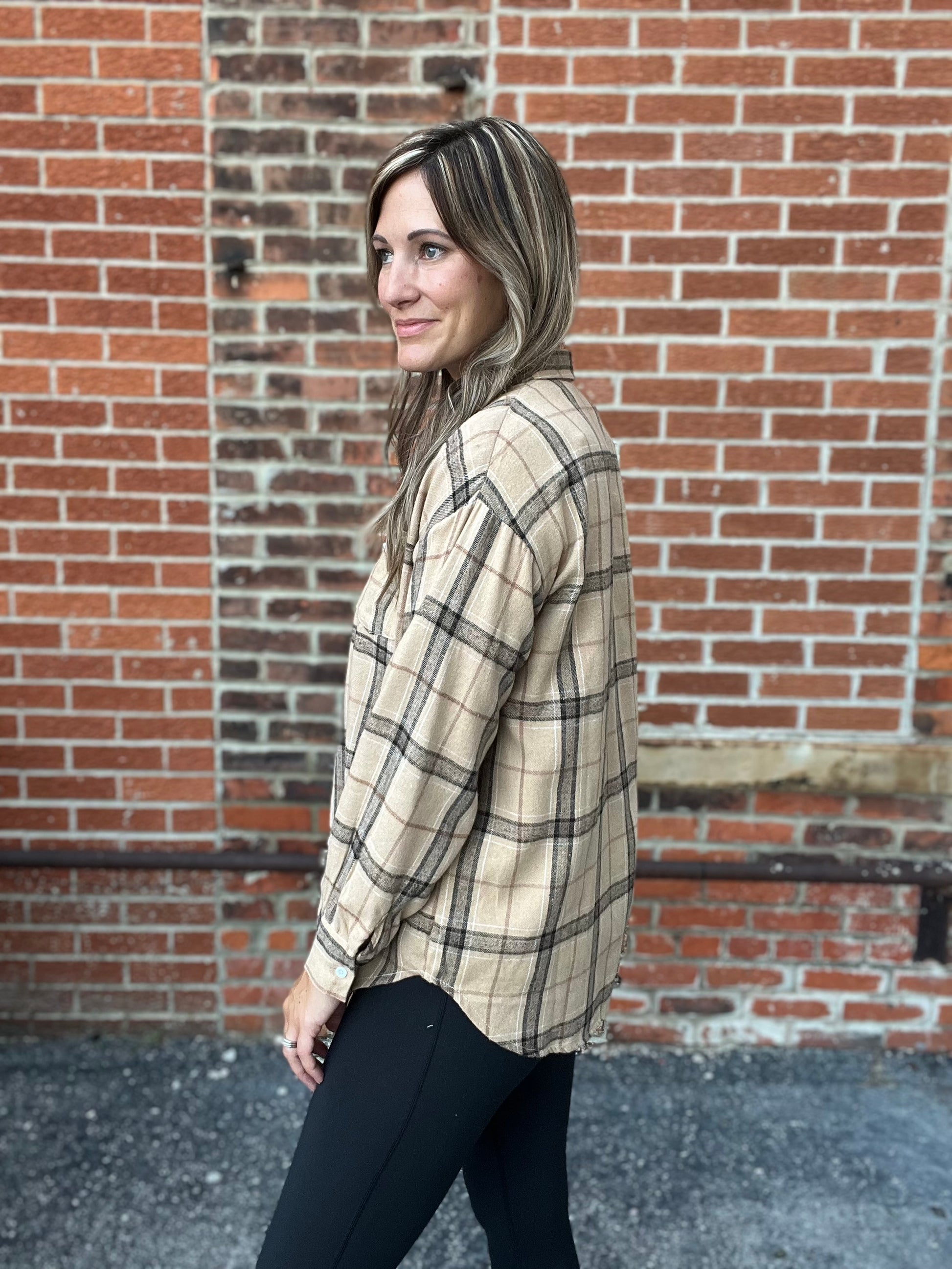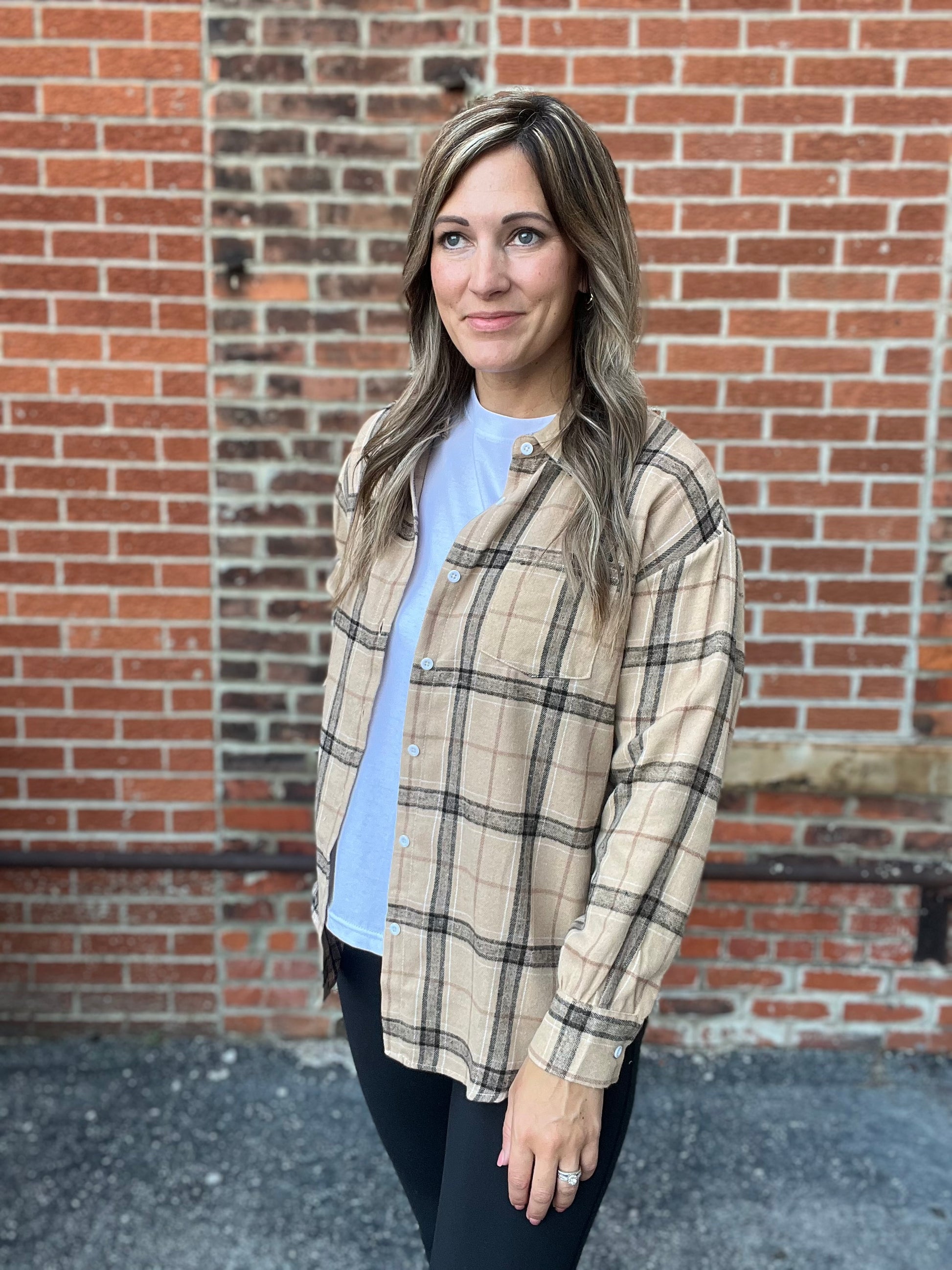 Lightweight and effortlessly laid back, this khaki plaid button up shacket is made from a breathable cotton blend fabric for all day comfort. With a relaxed fit and classic jacket styling, it layers easily over tanks or tees for that perfect transitional look. A go to piece for casual days, crisp mornings, or cozy fall layering.