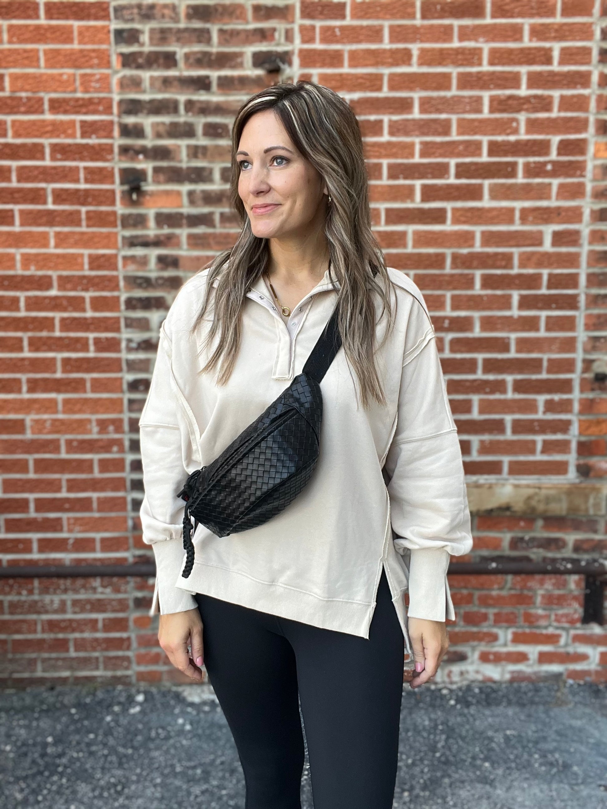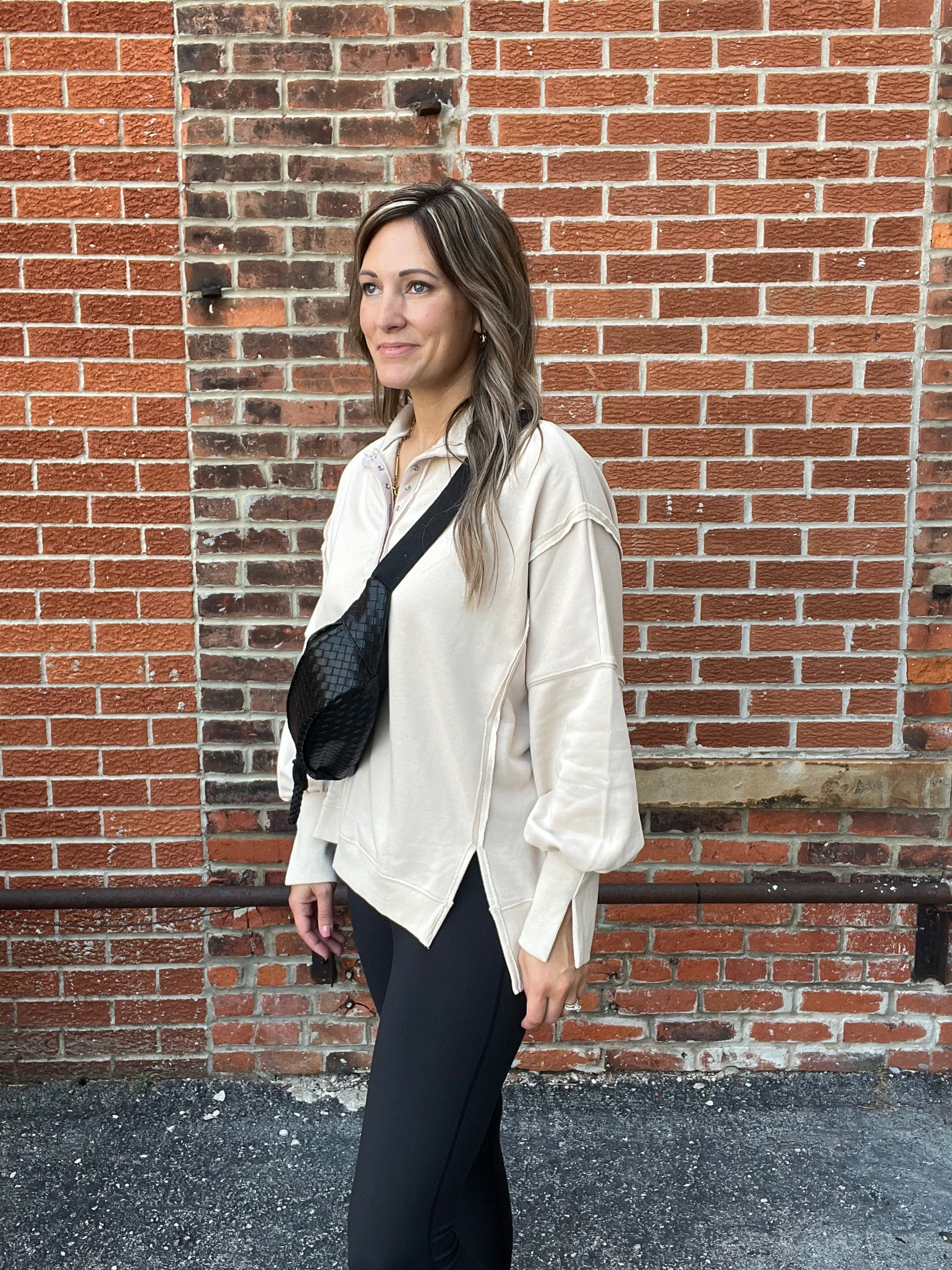 Stay cozy and effortlessly stylish in this oversized pullover sweatshirt. Designed with a casual quarter snap button neckline and exposed seam details for a touch of laid back edge. The soft fabric drapes beautifully for all-day comfort, while the front side slit adds movement and a flattering shape. Perfect for pairing with your favorite leggings or jeans for a relaxed, on trend look.