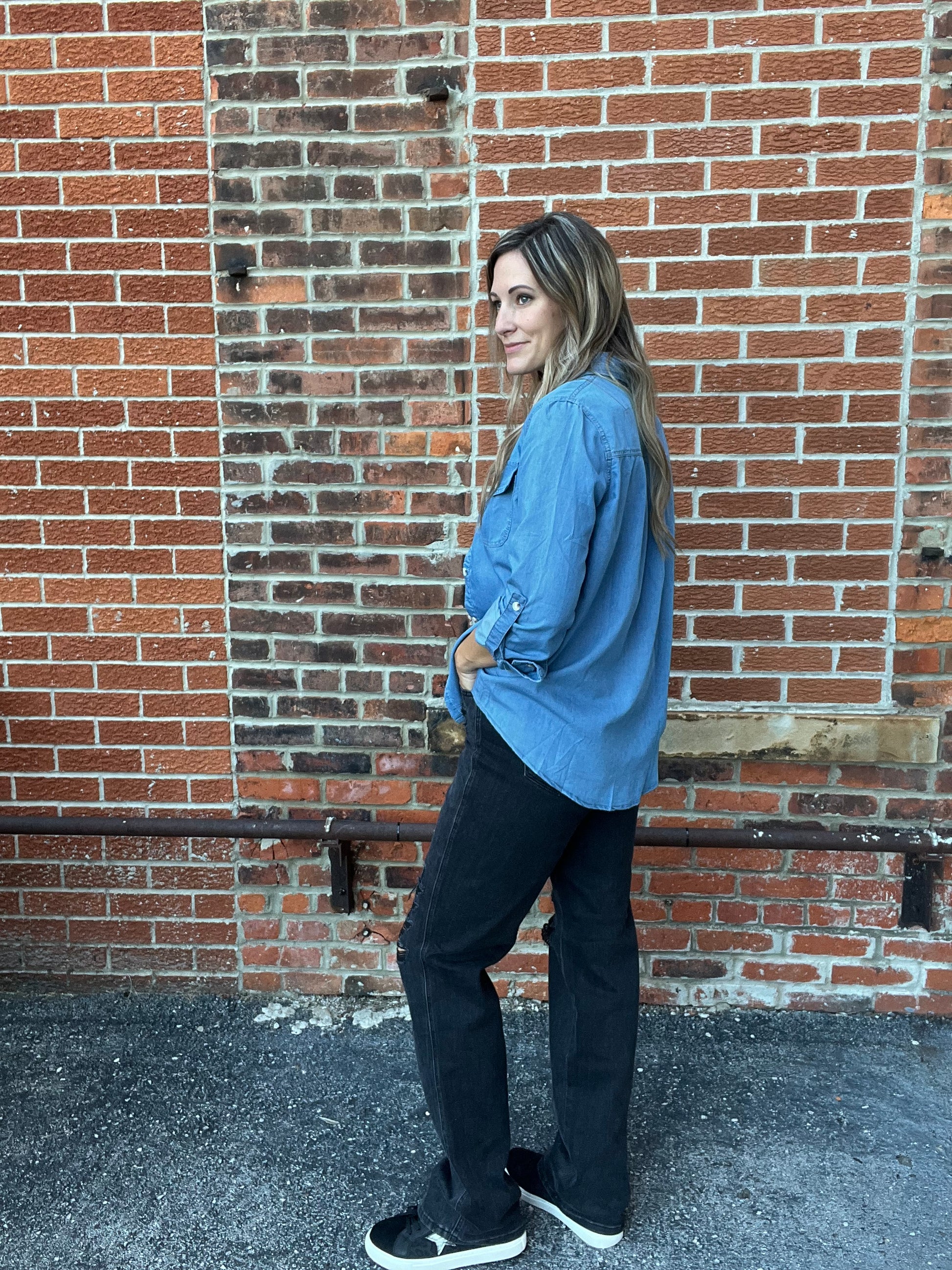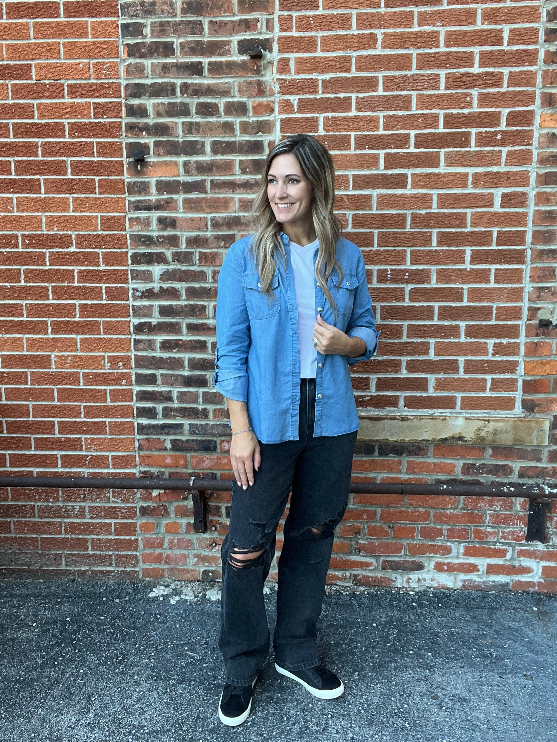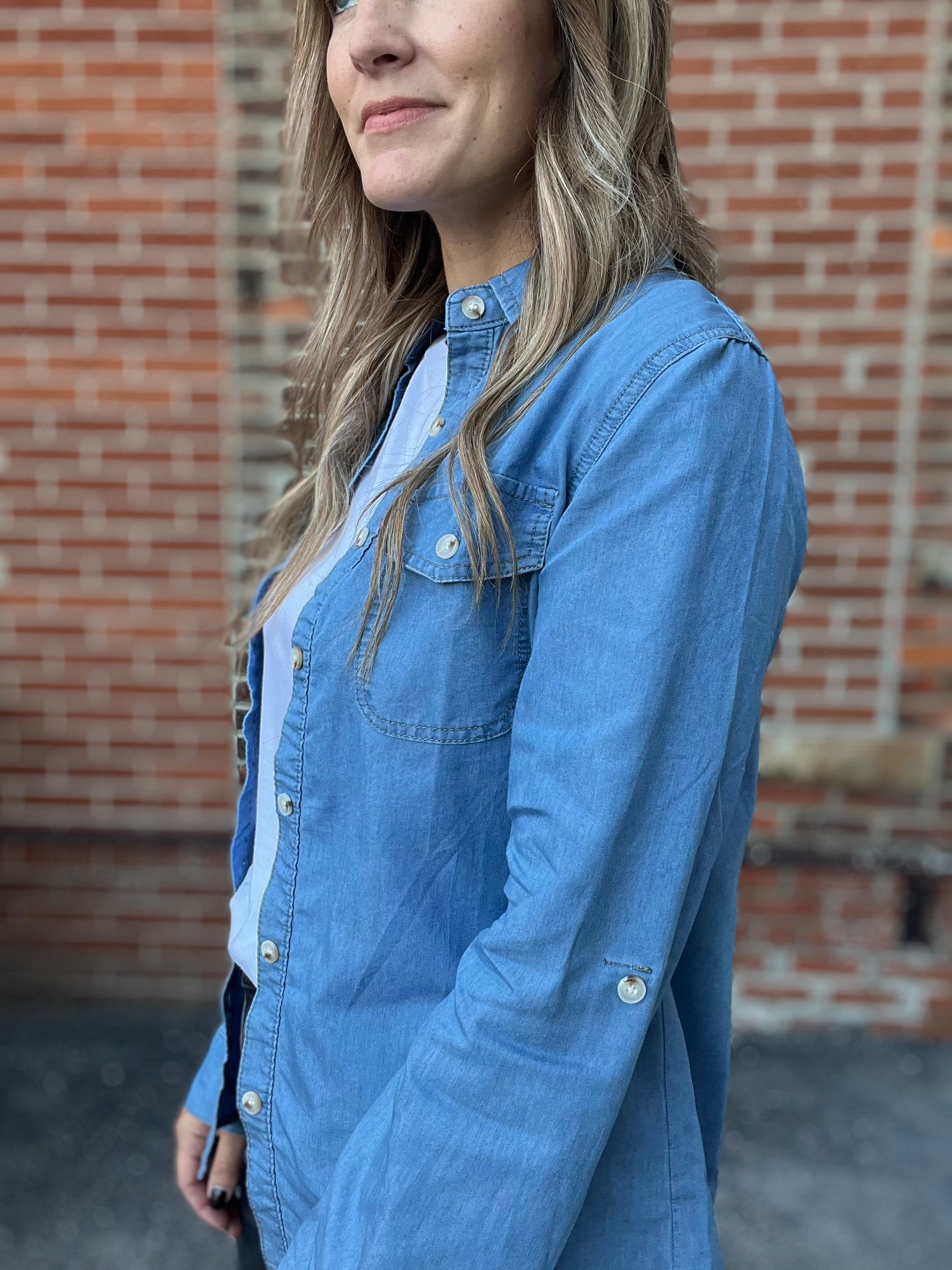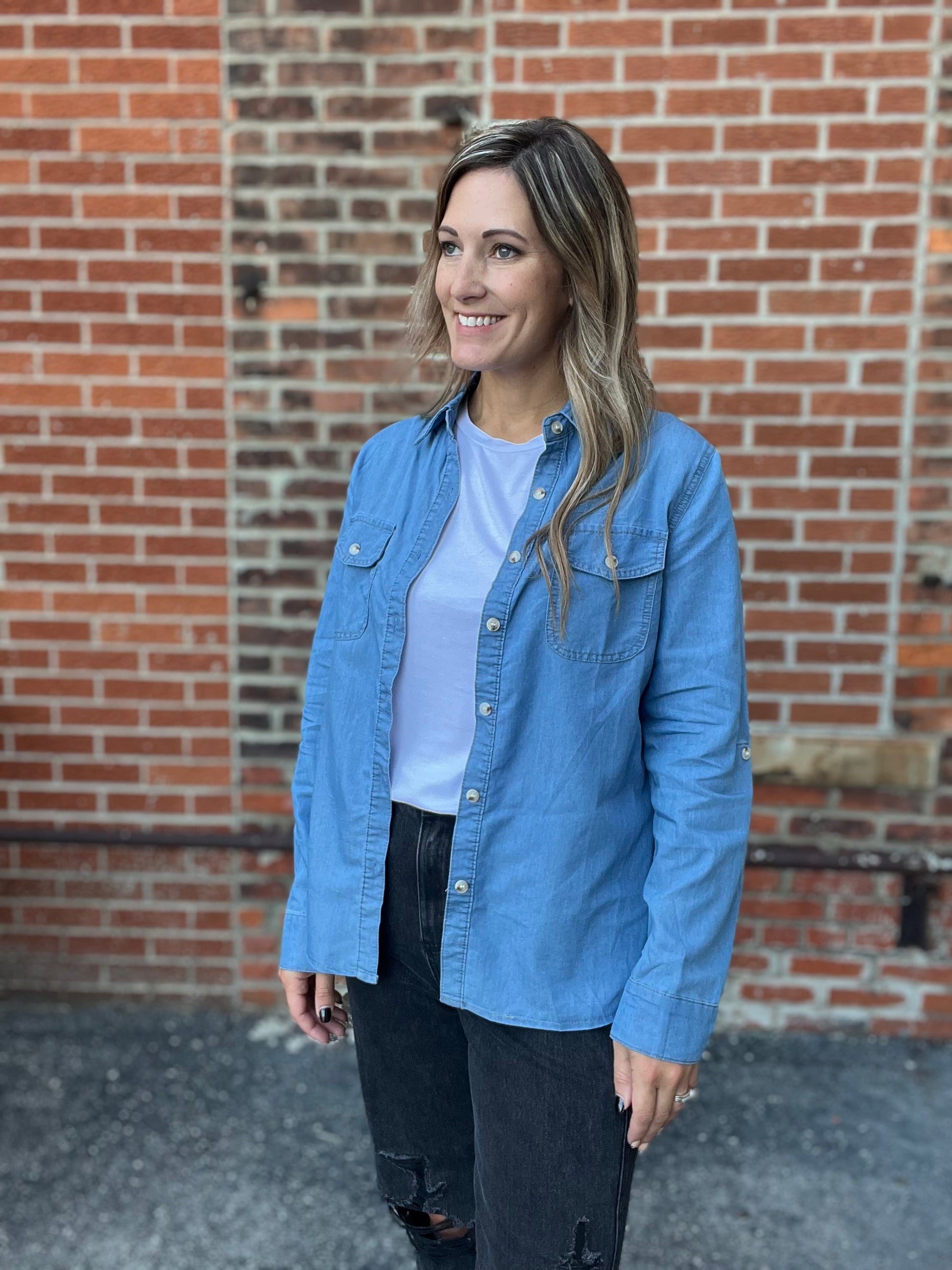 This denim long sleeve shirt features a classic design with a modern twist, highlighted by two functional breast pockets for added style.
