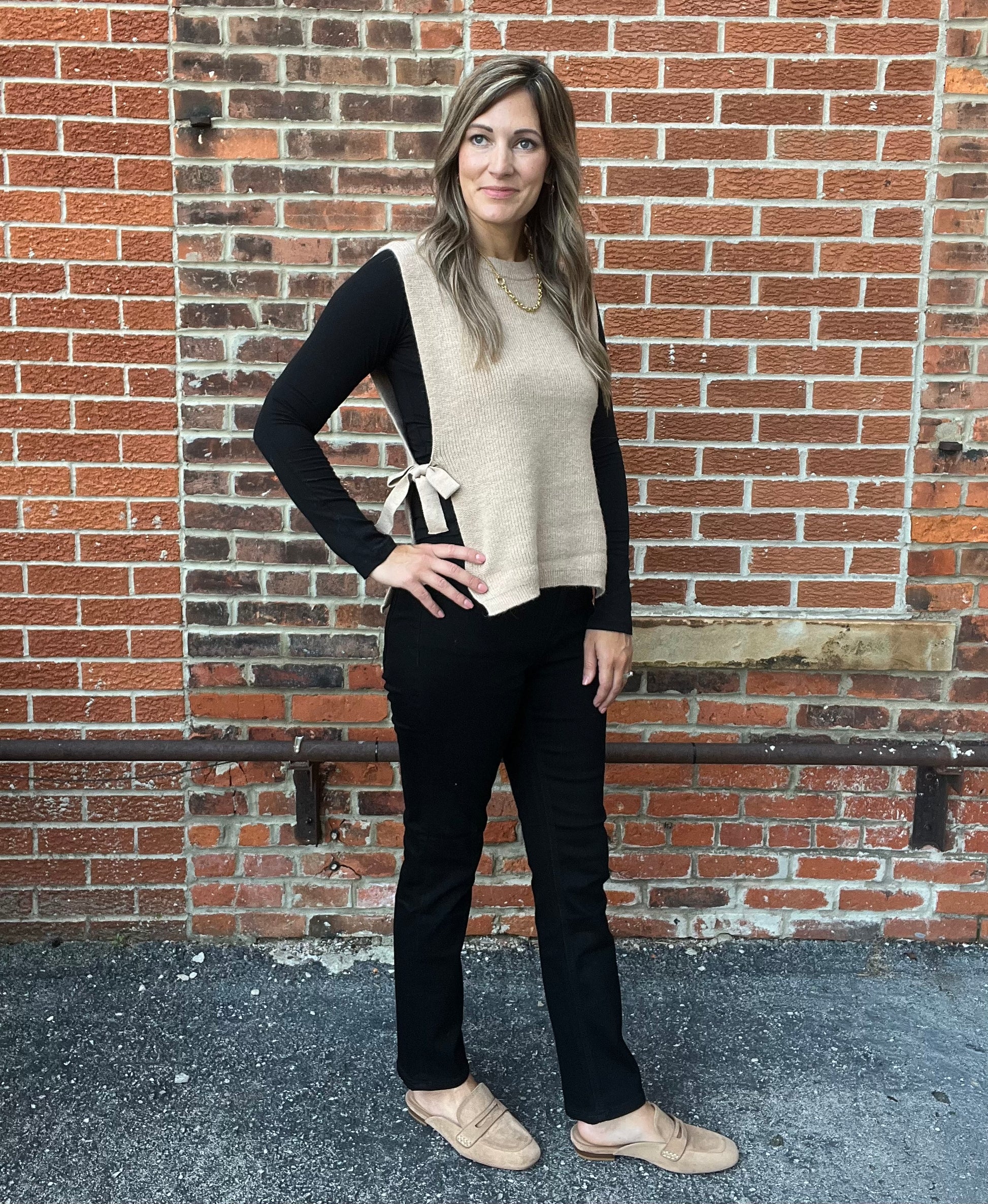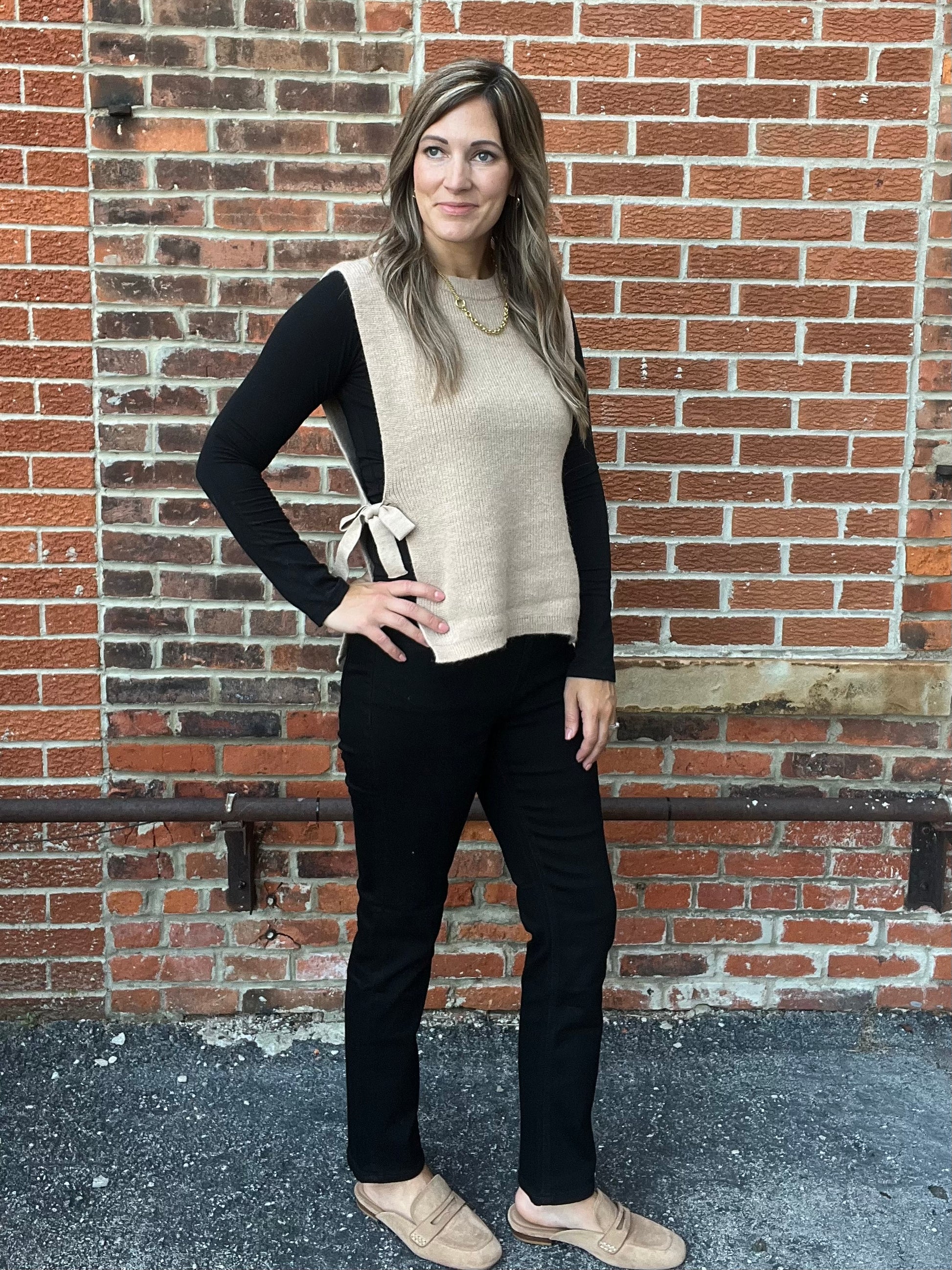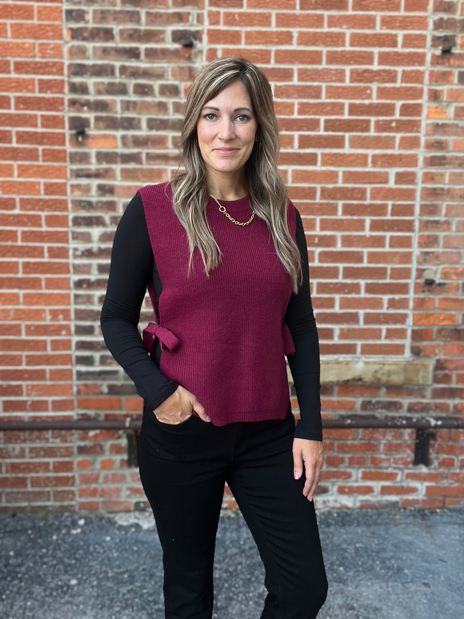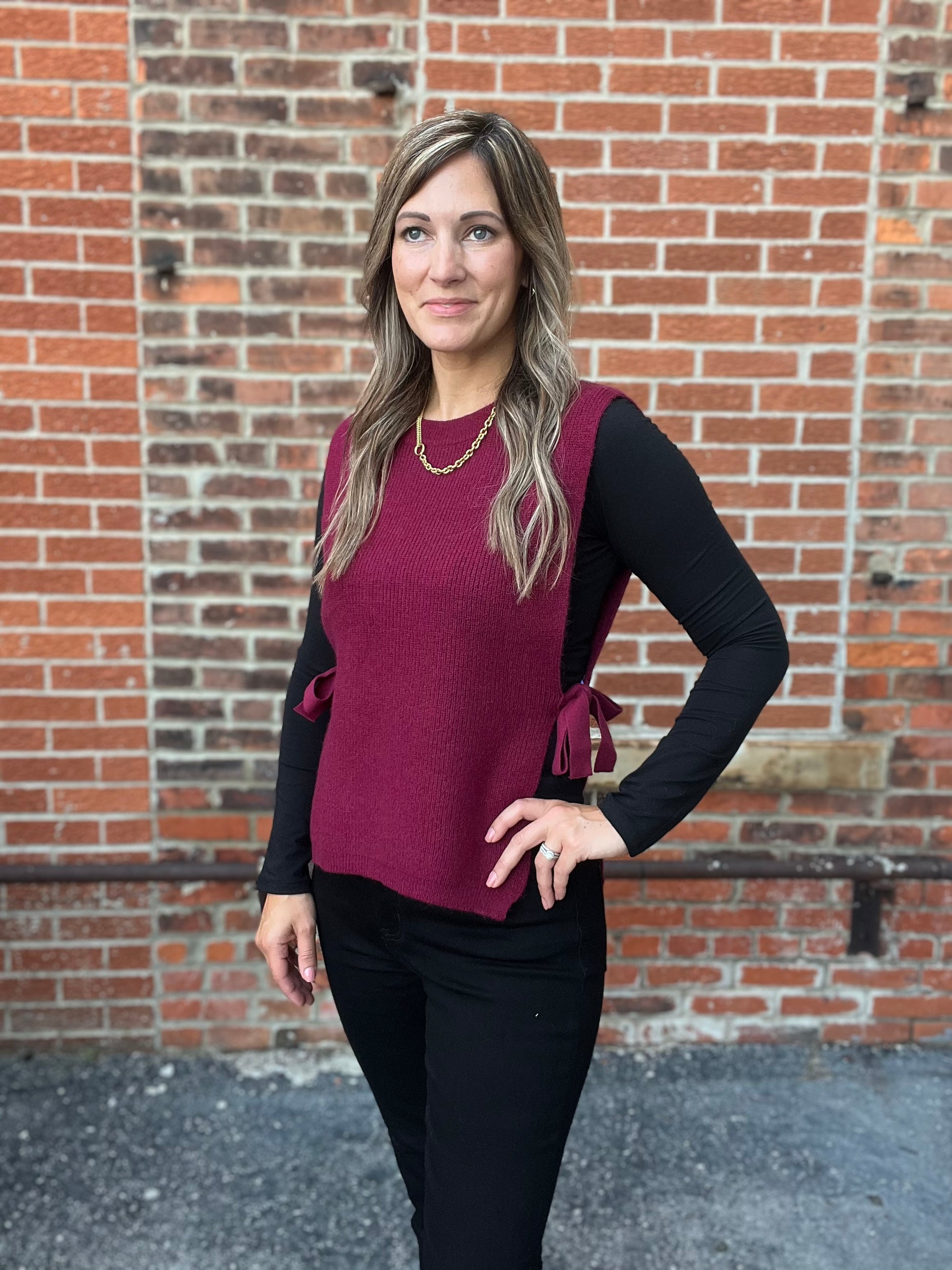 Chic and effortlessly layered our Open Side Sweater Vest brings style with a twist. Designed with an open-side silhouette and adjustable side ties, this sleeveless knit layers beautifully over long sleeves, blouses, or dresses. The rich hue adds warmth to your outfit, making it a perfect transitional piece for fall and beyond.