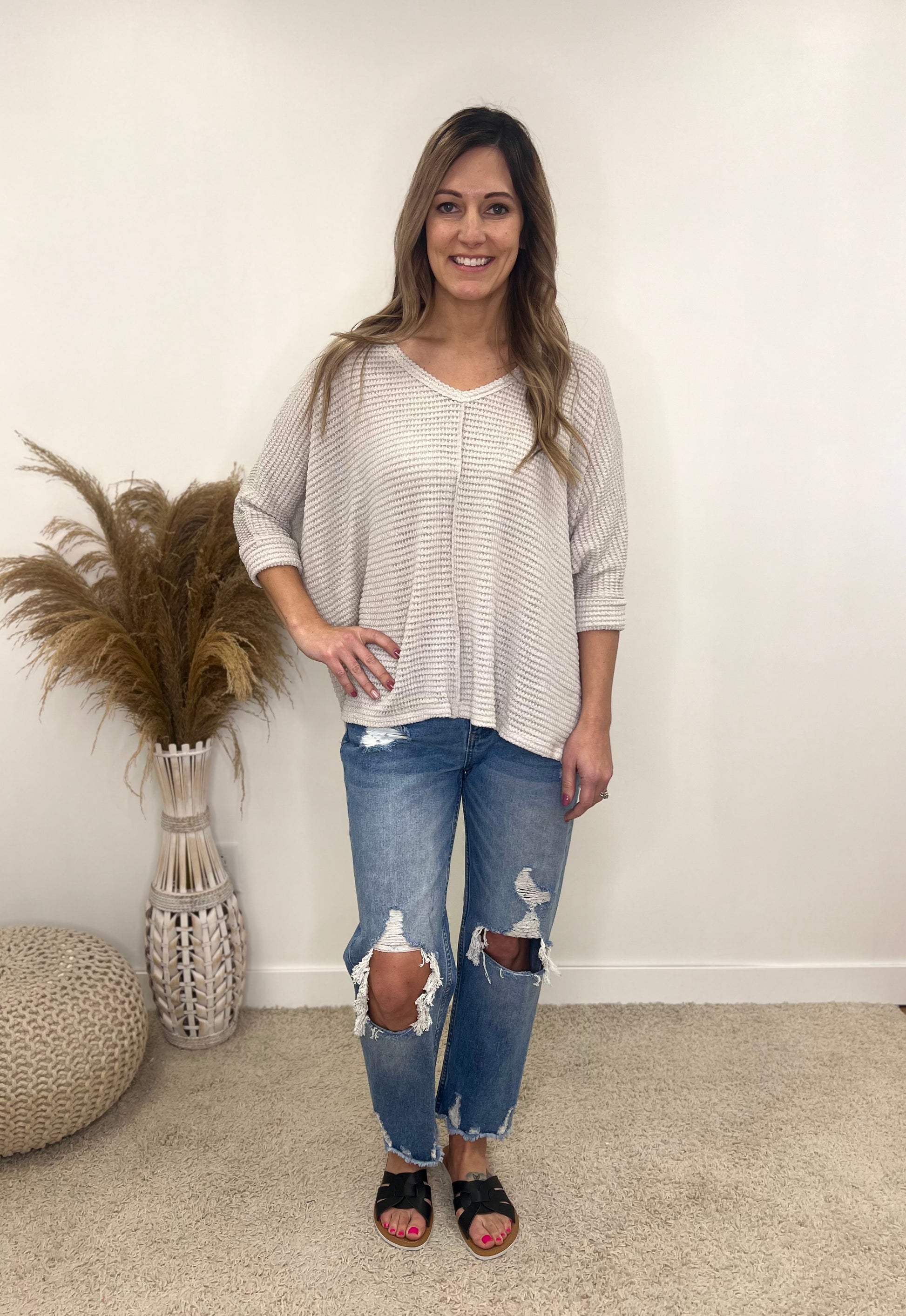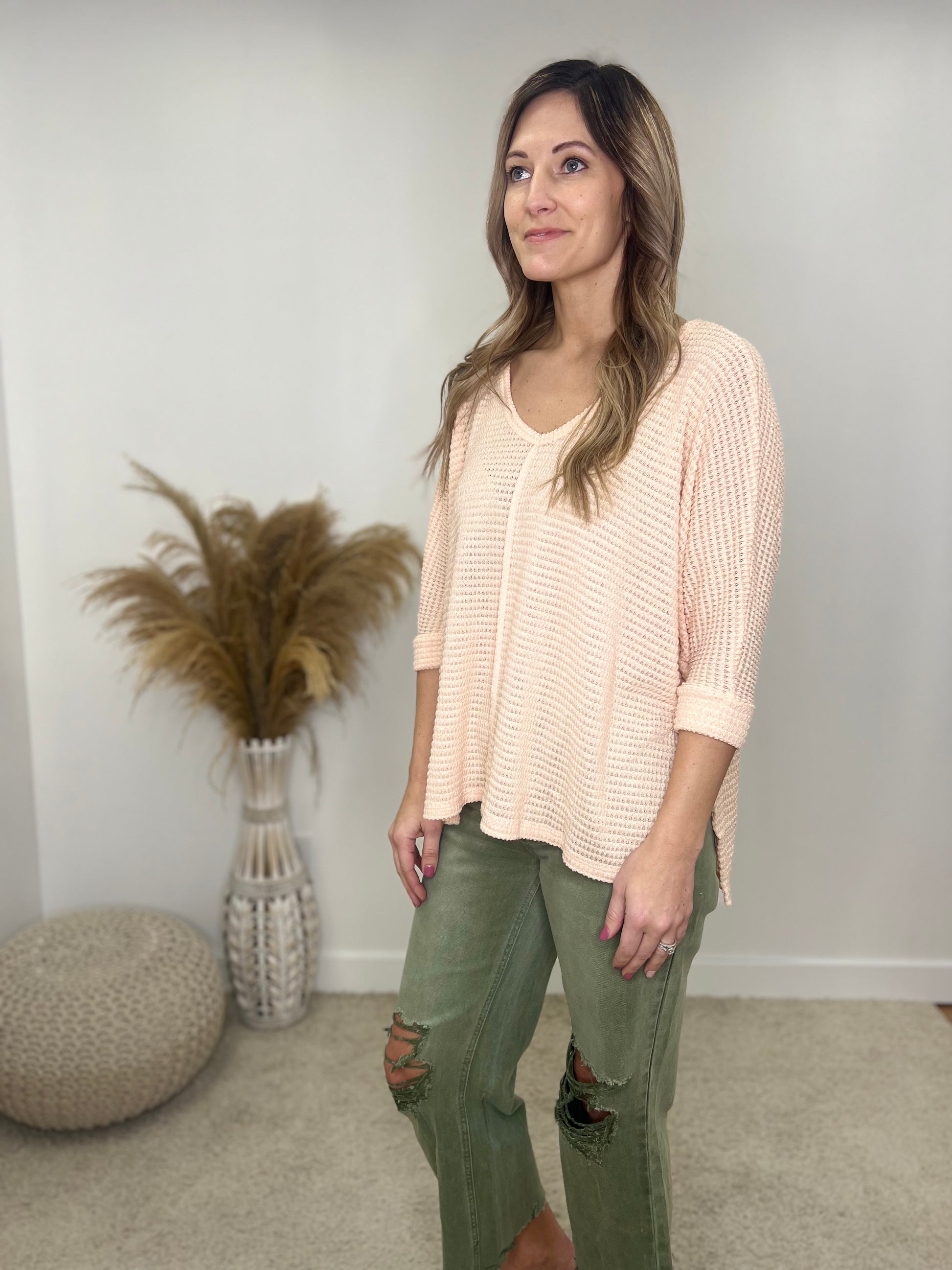 This Lightweight Material Three Quarter Sleeve Top Is Perfect For A Casual Day. With Its Spring Waffle Knit Material It Is Super Breathable And Comfy. This Top Features A High Low Hem With a Front Exposed Seam And Cuffed Sleeves.