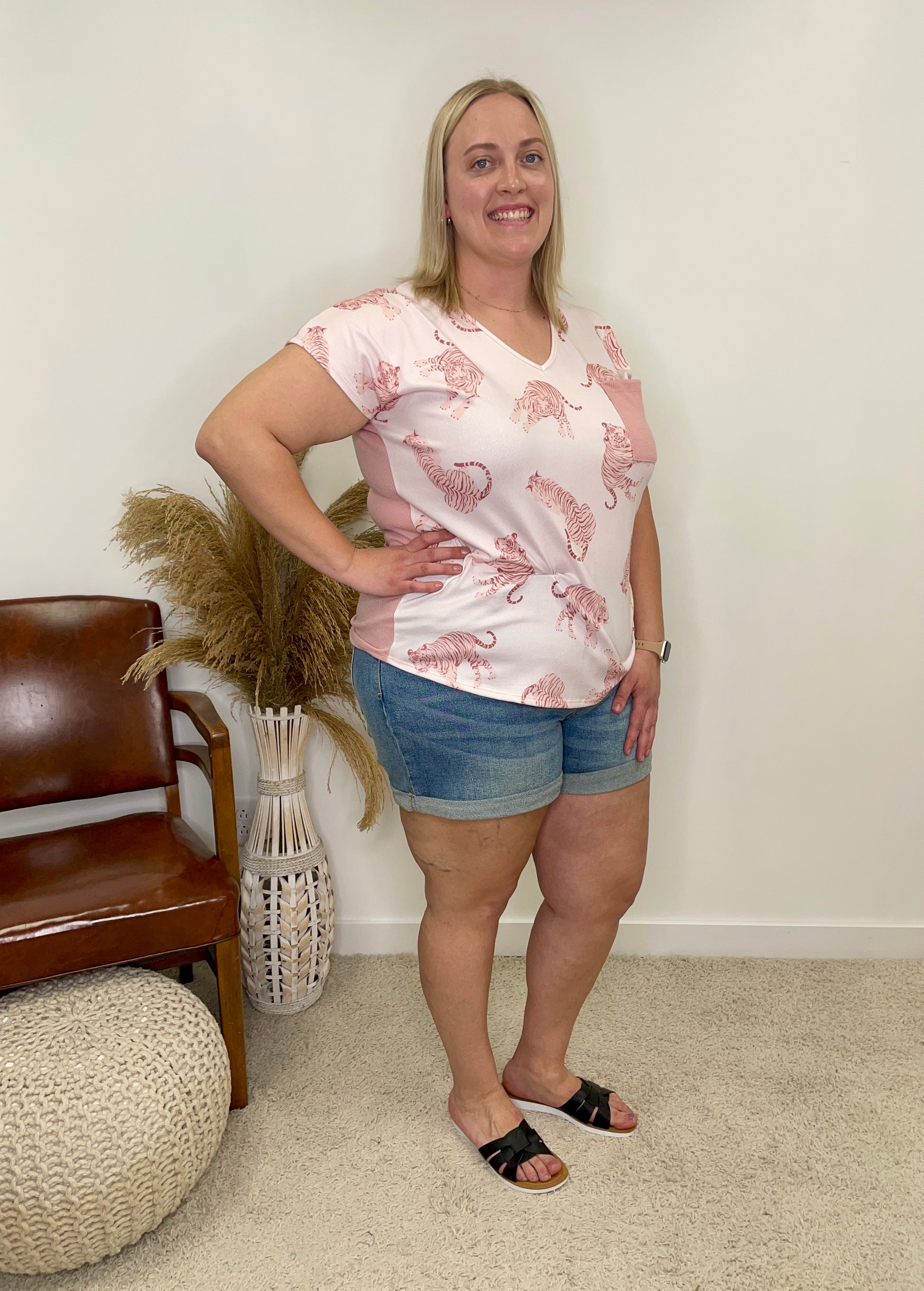 This Blush and Ivory Curvy Top Features a Tiger Design and A V Neckline Detail. This Top Also Had. Front Left Chest Pocket. The Bridget Tiger Top is Lightweight and The Design Makes it Unique in Itself!