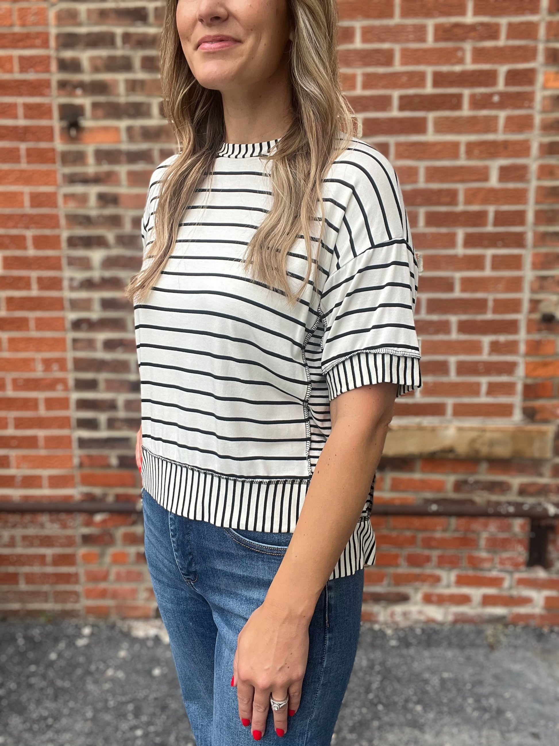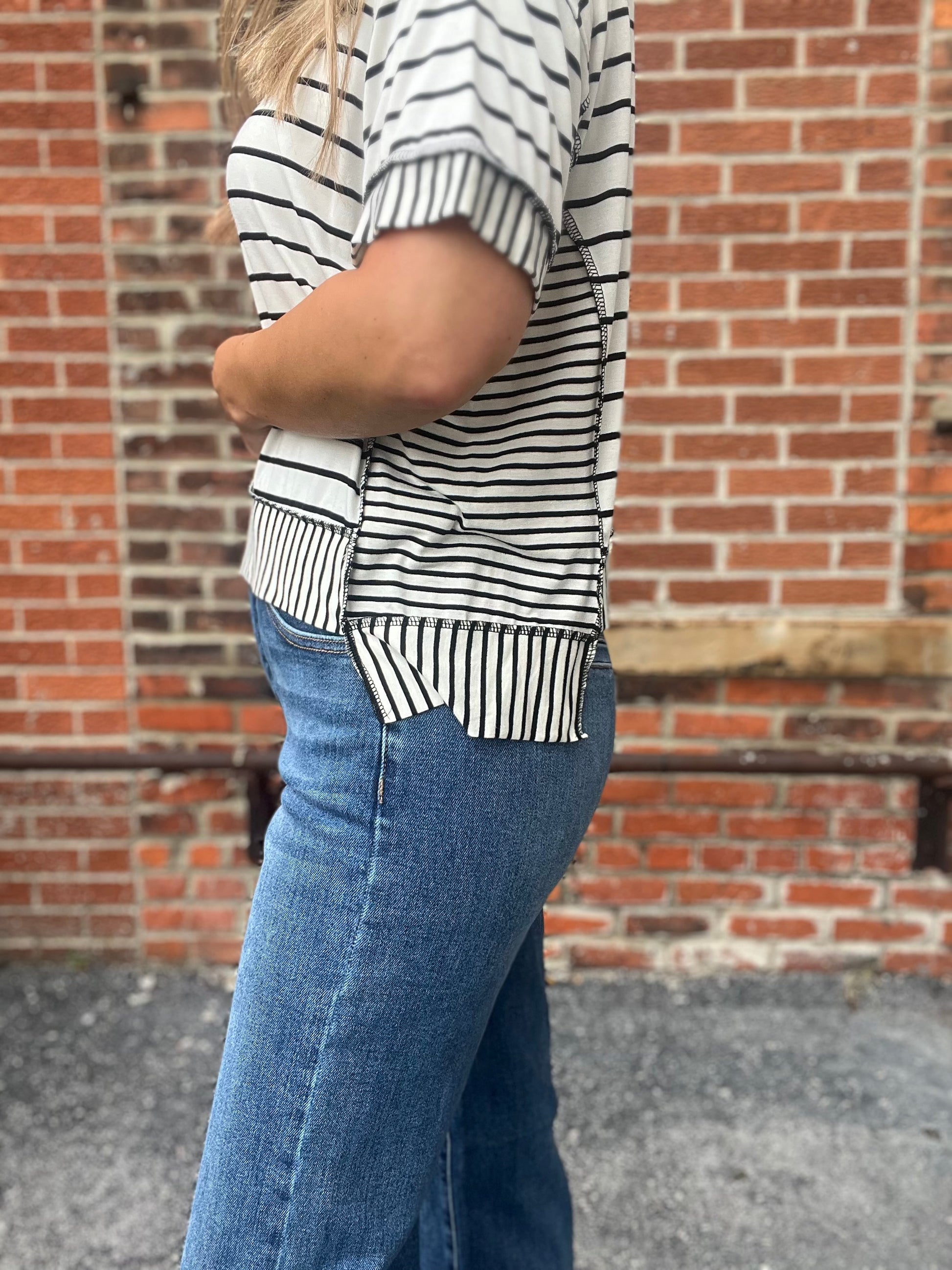 This is a round neck, curvy short sleeve knit top featuring a yarn dyed stripe and color block design. The loose fit and oversized silhouette offer a relaxed, comfortable feel, perfect for casual wear. Made with soft knit fabric, it drapes effortlessly and adds a cozy, laid back vibe. The combination of stripes and color blocks adds visual interest and a playful touch to this effortlessly stylish piece.