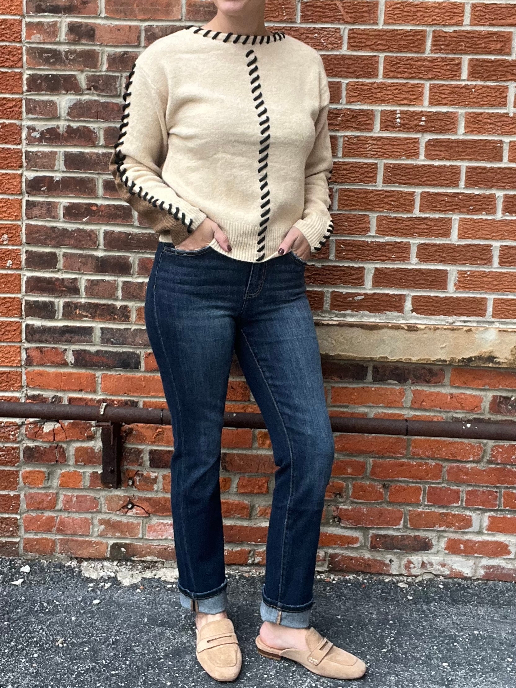 Sleek and timeless, these high rise slim straight jeans feature a flattering fit with just the right amount of structure. The dark wash gives them a classic look, while the mild textured hem adds a subtle touch of edge. Perfect for dressing up or keeping casual.