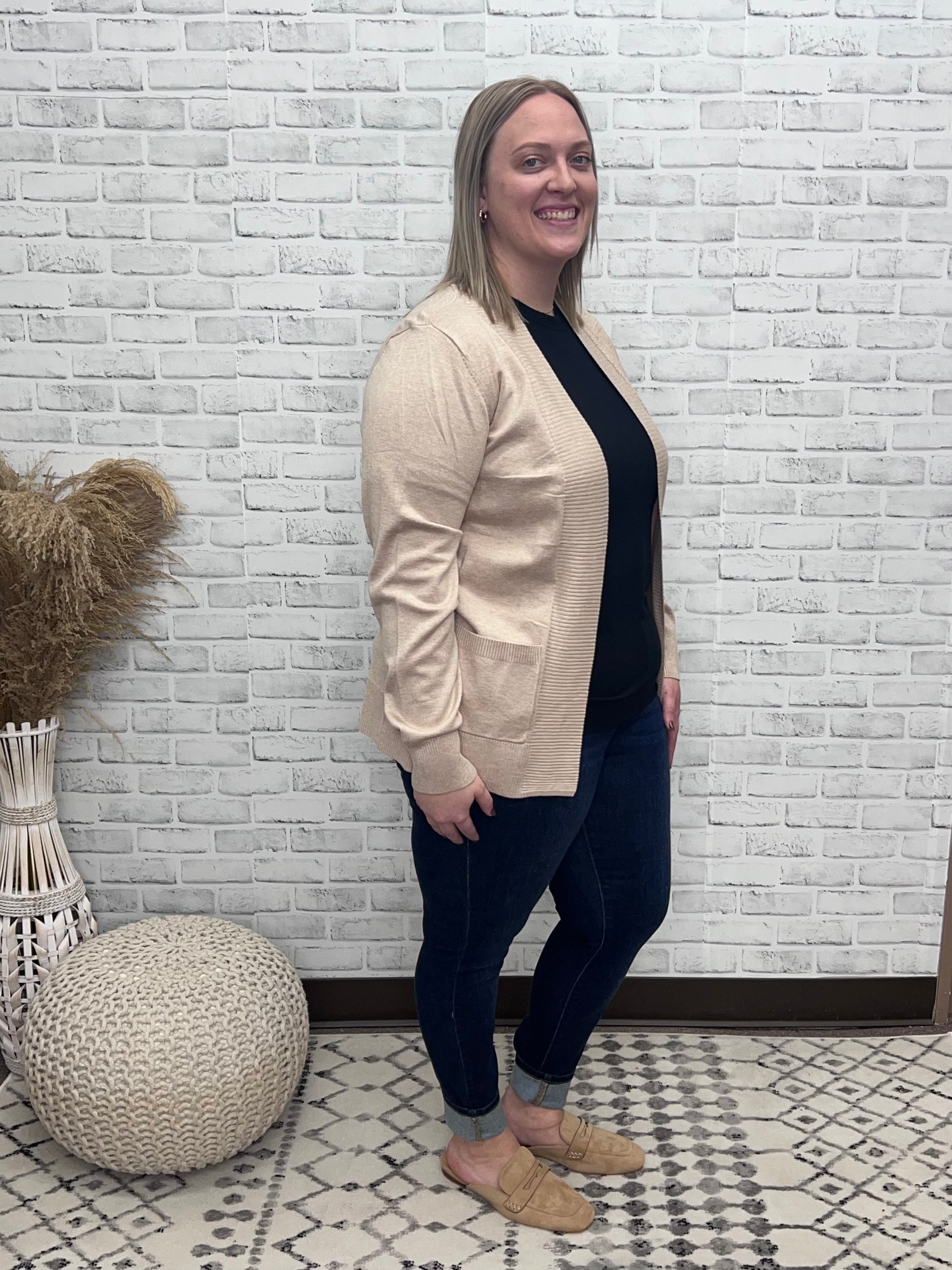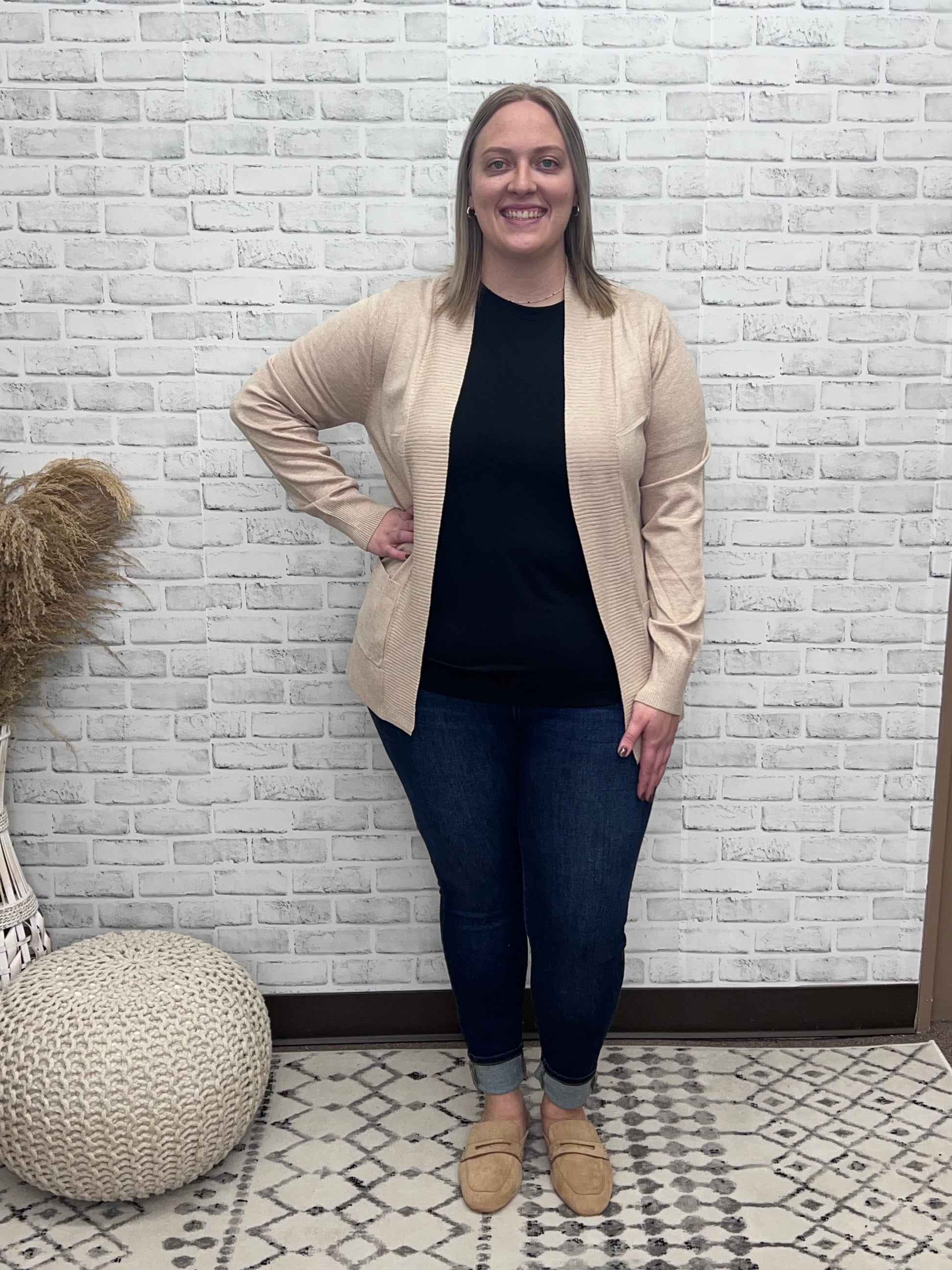 Basic Lightweight Cardigan with Ribbed Neckline Detail and Front Pockets
