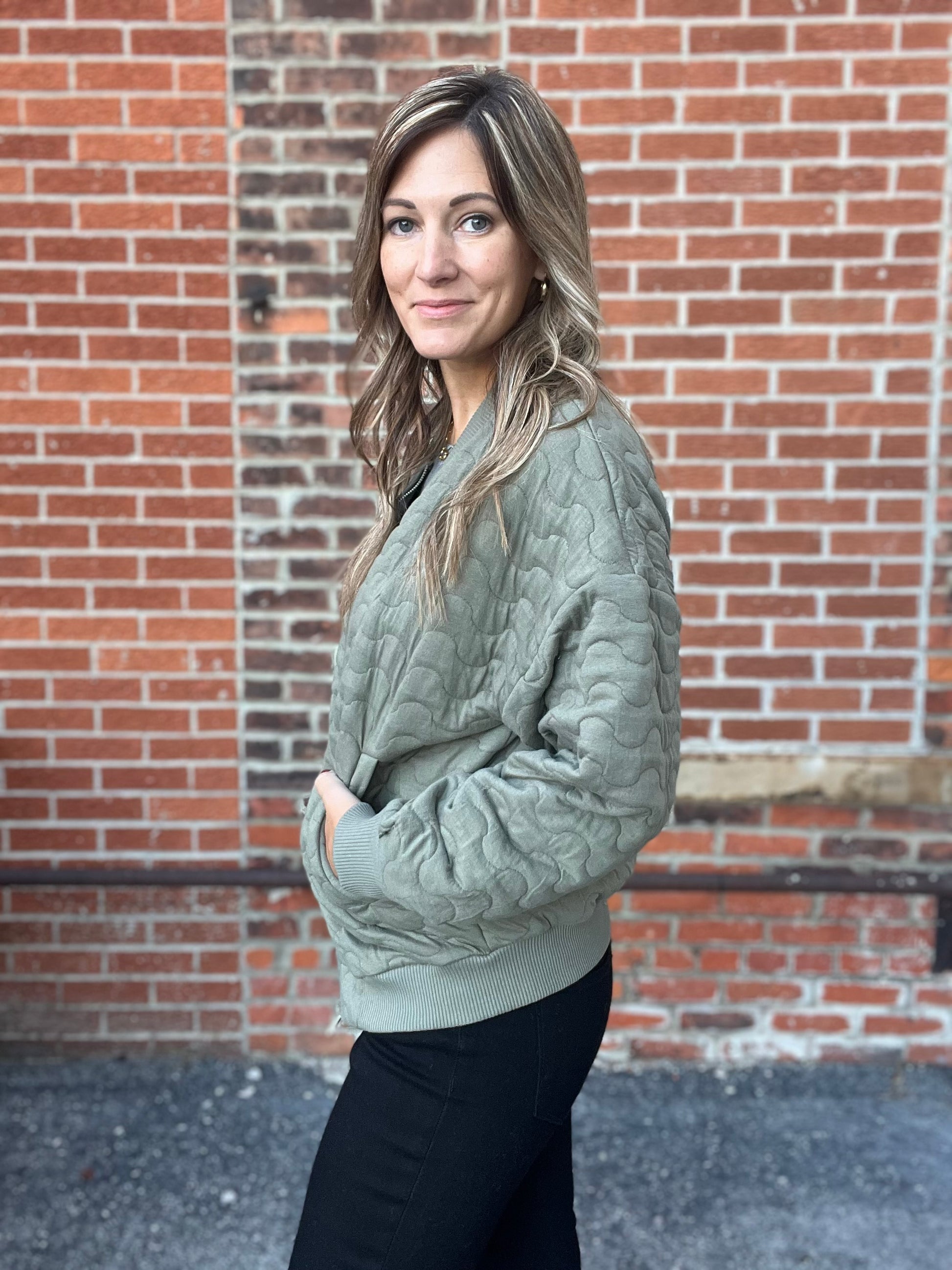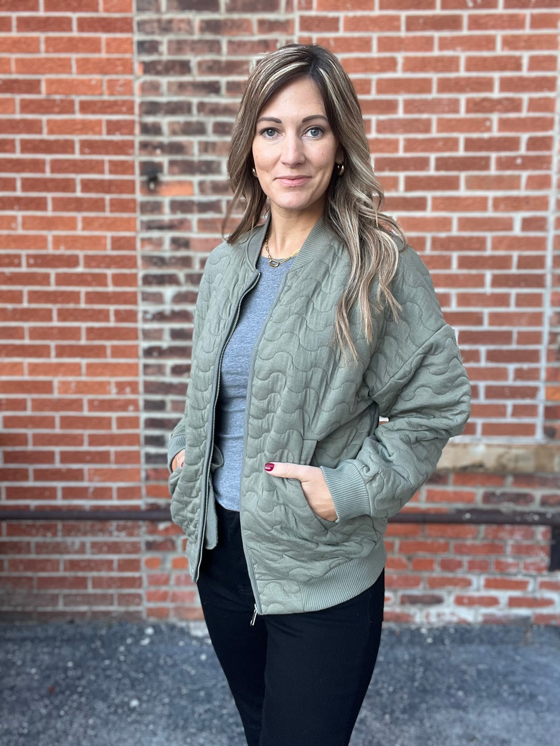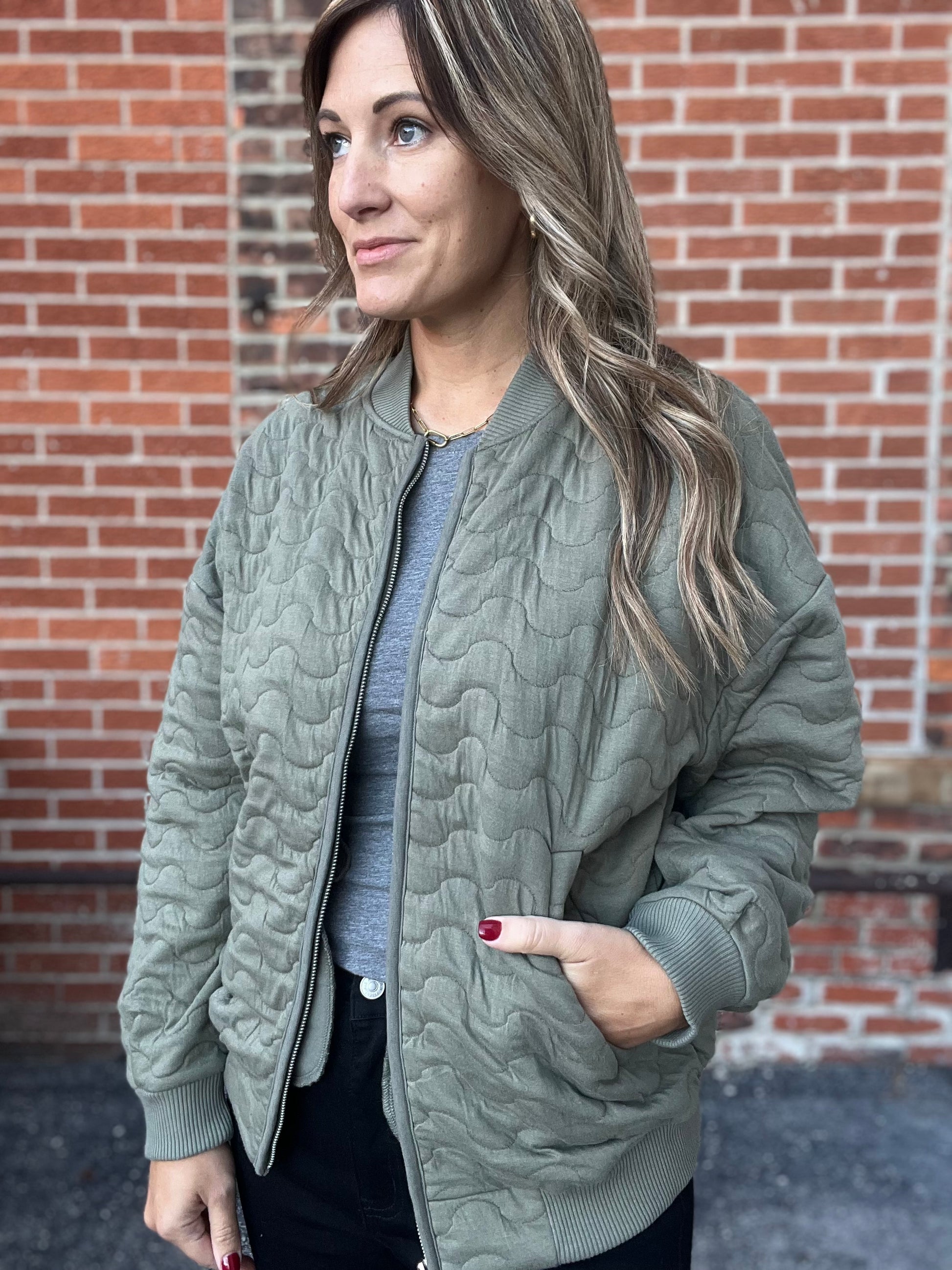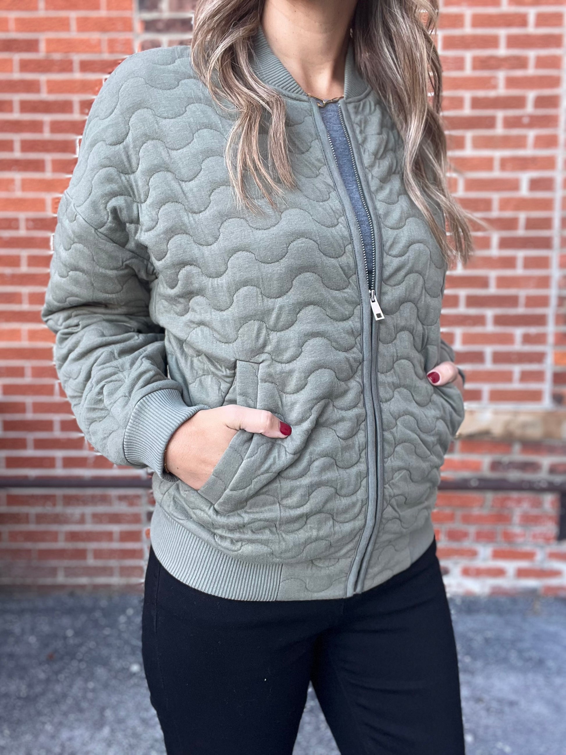 A cozy and comfy quilted zip up jacket featuring a relaxed fit, front zipper closure, and handy side pockets. Perfect for layering, this soft jacket adds warmth and laid back style to any casual outfit.