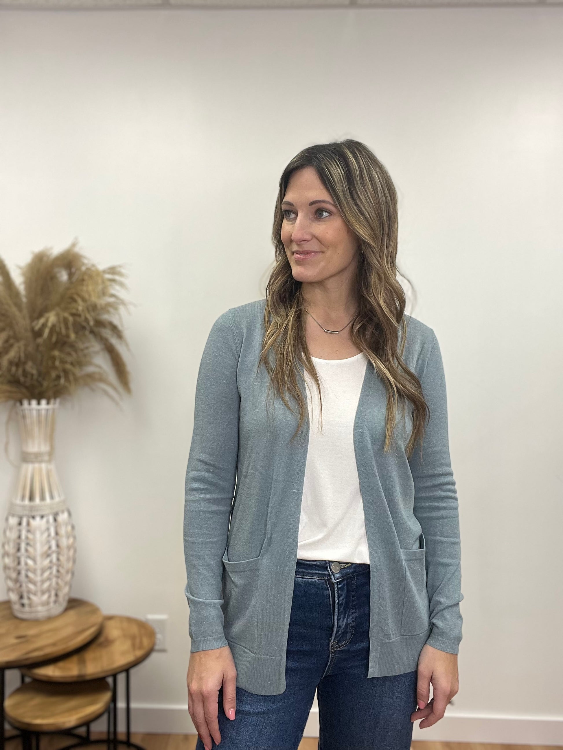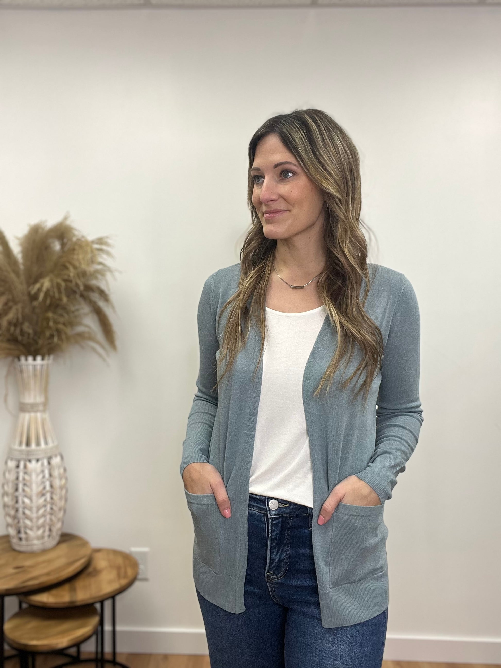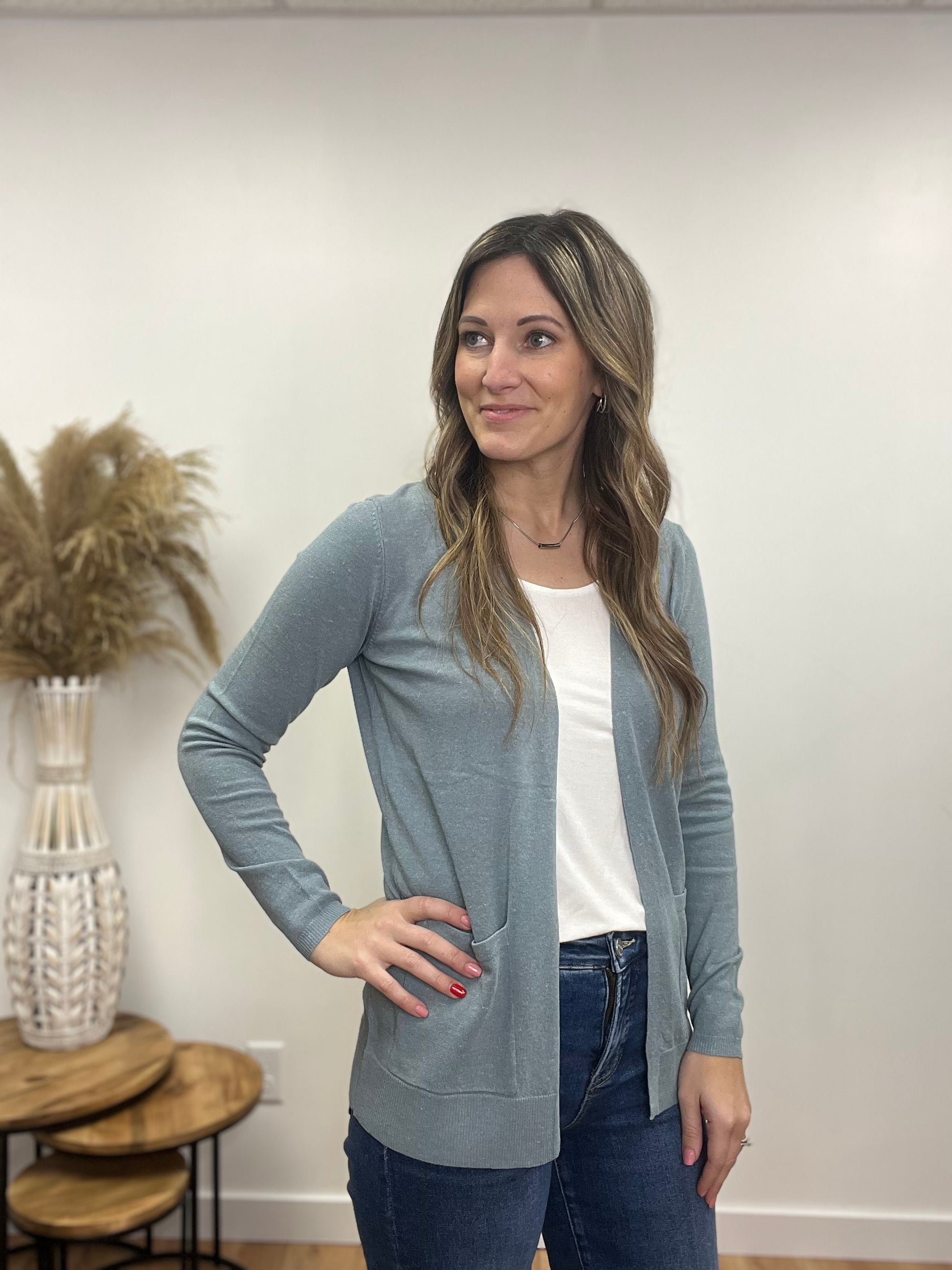 Definitely a must have for spring, this dusty blue open-front cardigan is a piece you will gravitate to over and over. It’s lightweight and breathable, this long sleeve layering piece is perfect for adding a touch of cozy elegance to any outfit. Dress it up or keep it casual—it’s a must-have for every wardrobe!