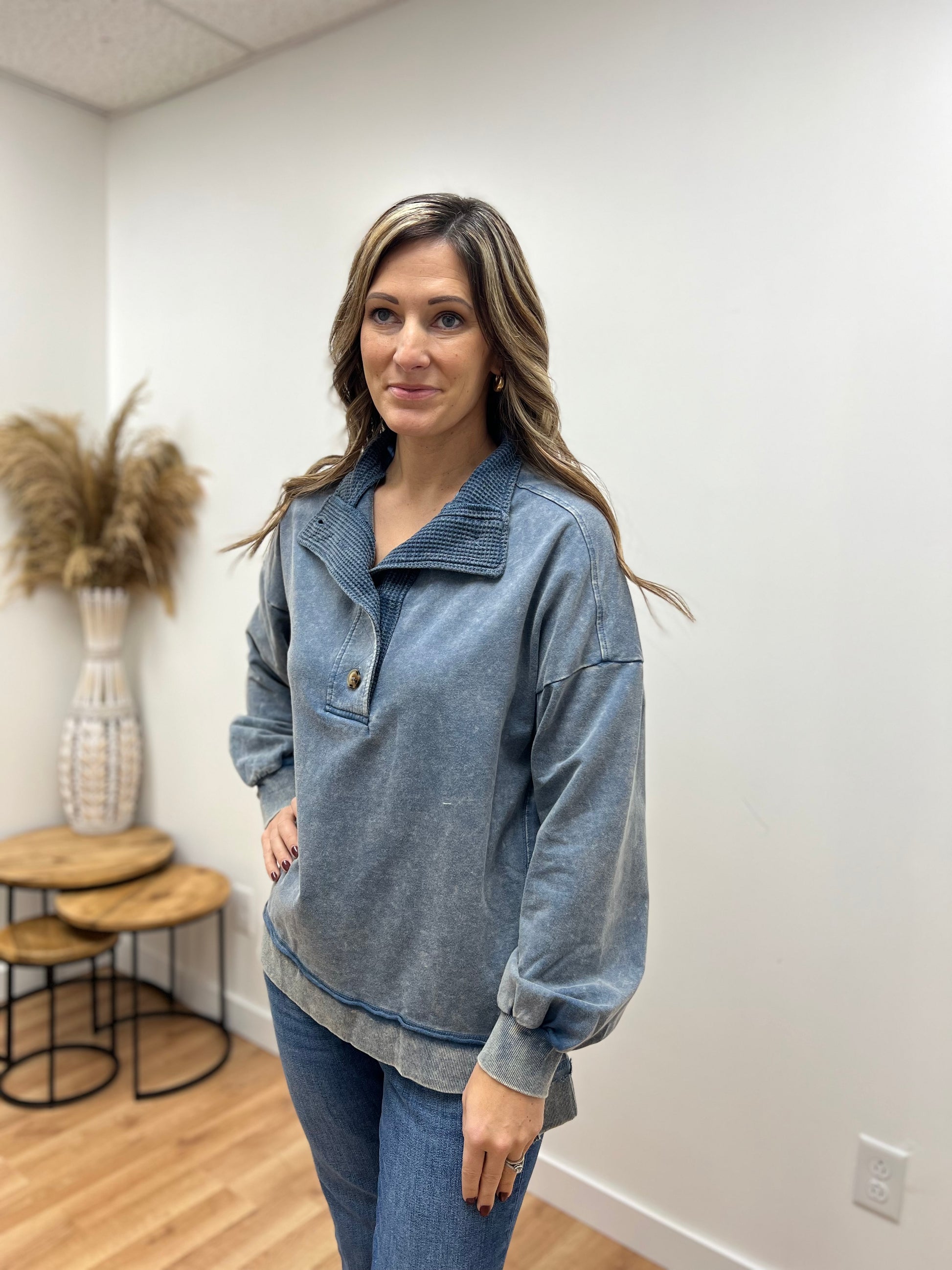 Cozy up in this oversized quarter button up pullover, designed with a soft waffle textured neckline and a stylish mineral washed finish. The relaxed fit makes it perfect for layering, lounging, or everyday wear. A comfortable, lived in look you’ll reach for again and again!