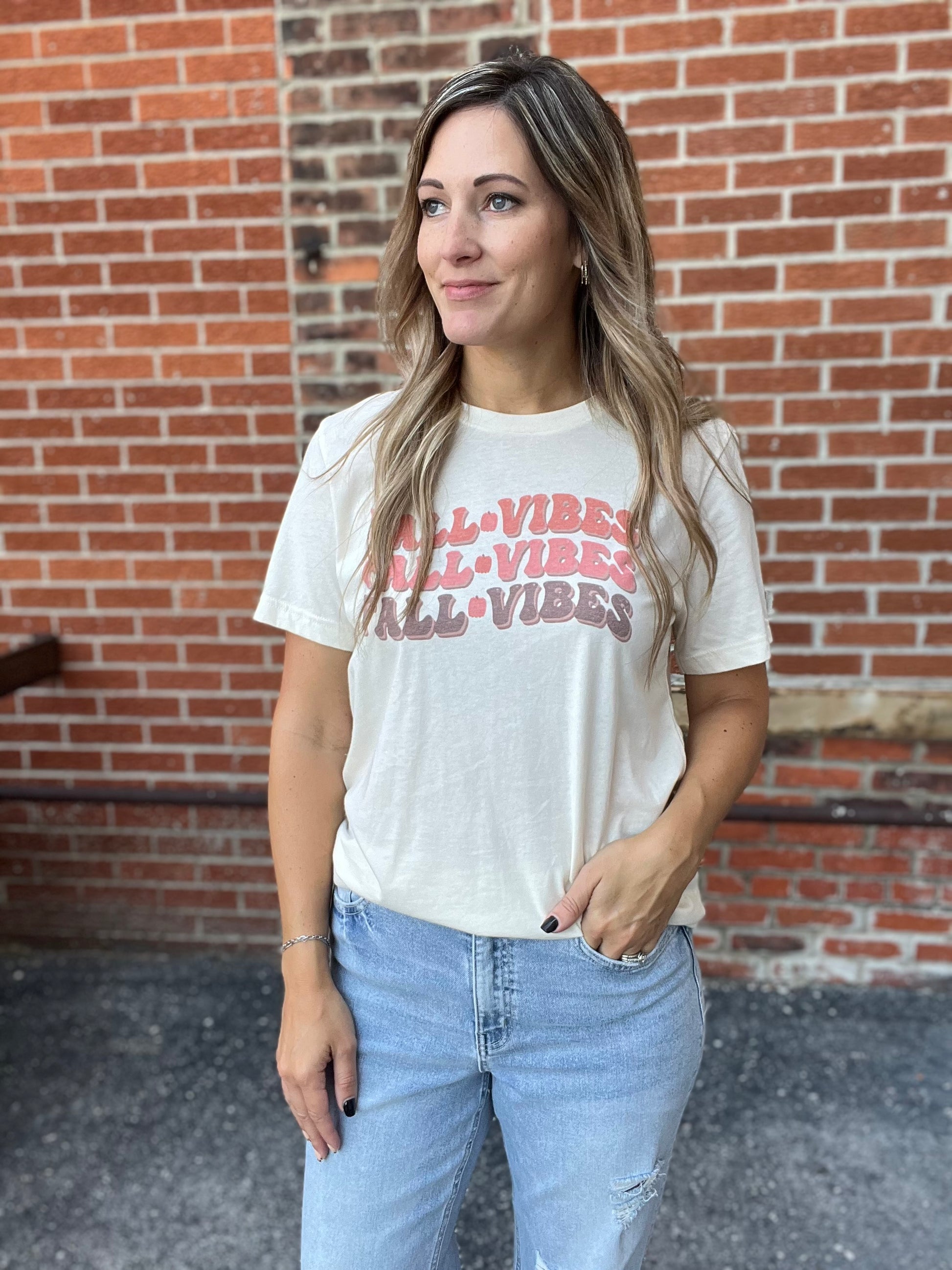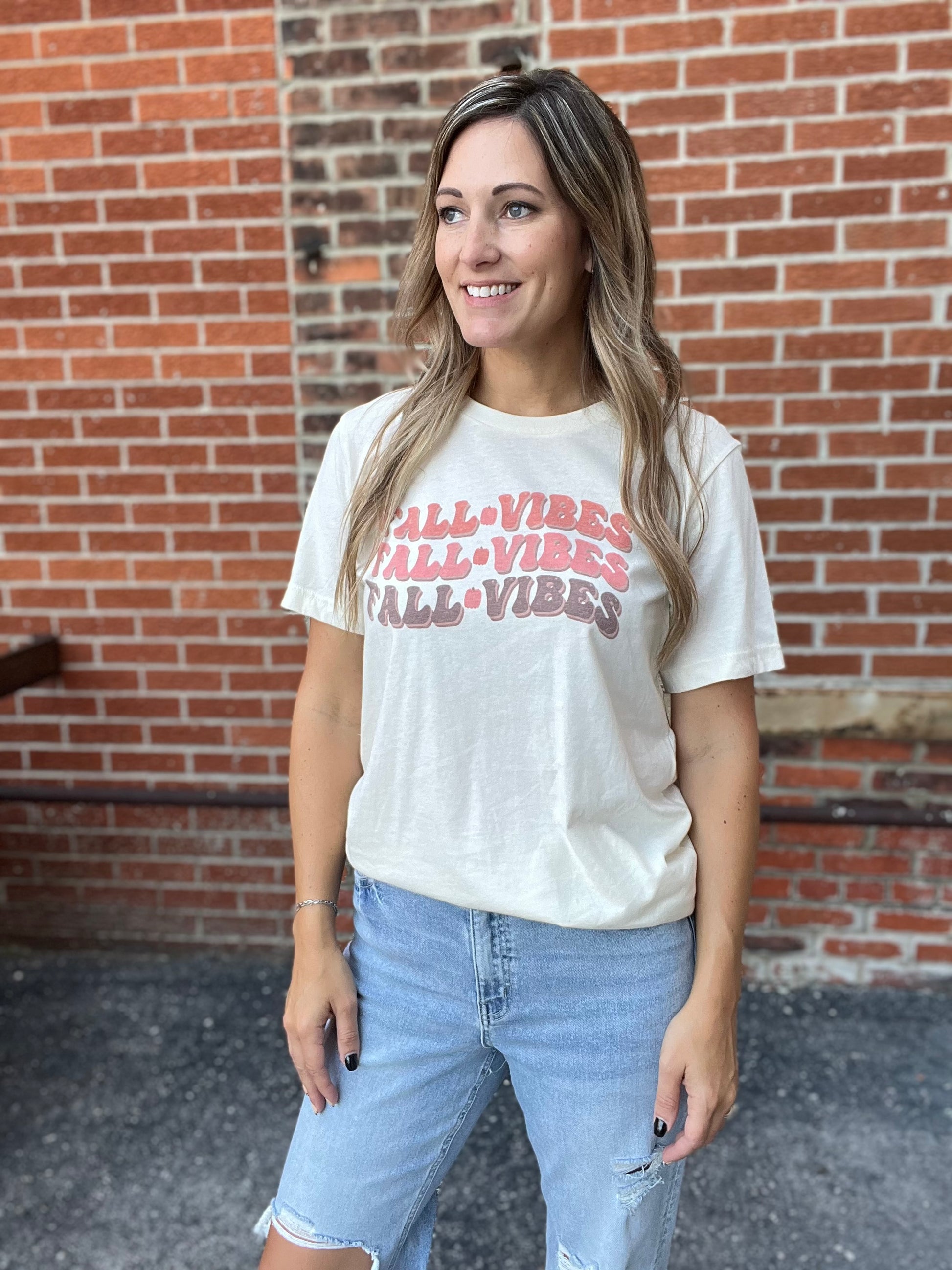 Embrace The Cozy Season With This Adorable Cream Graphic Tee! Featuring The Playful Phrase 'Fall Vibes' Repeated Three Times In A Charming, Handwritten Font, This Tee Is Perfect For Those Who Love Autumn's Warmth And Style. Soft, Comfortable, And Effortlessly Cute—It's Your Go-To Top For Pumpkin Picking Or Just Enjoying The Crisp Fall Air. Stay Fun And Fashionable All Season Long!