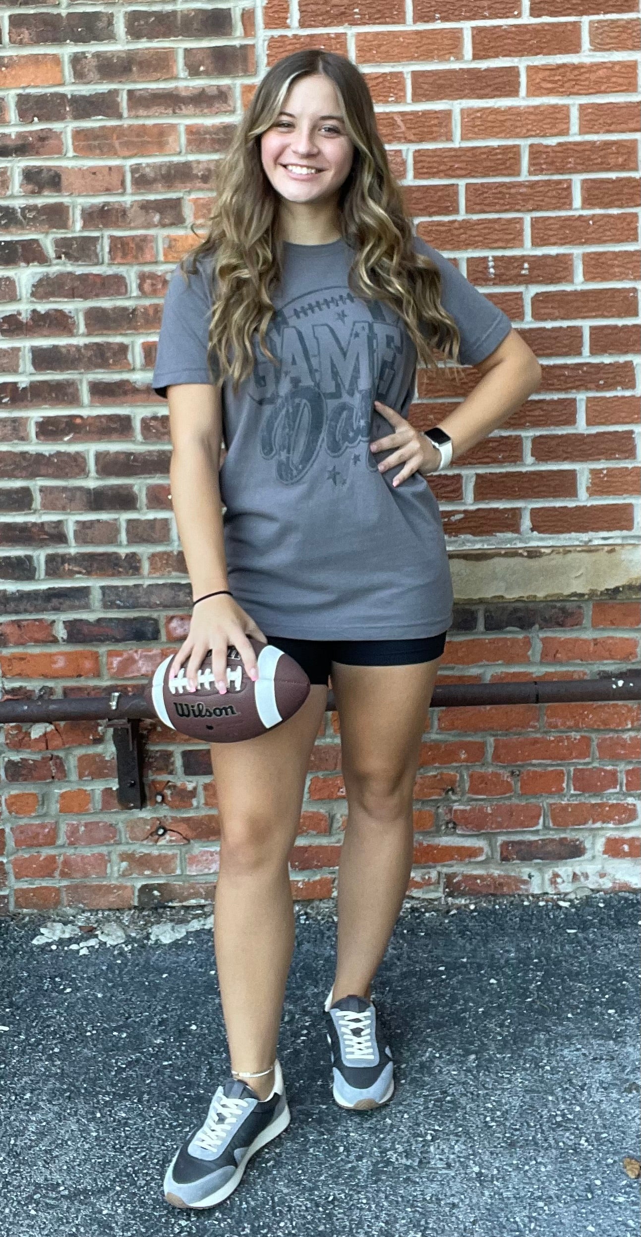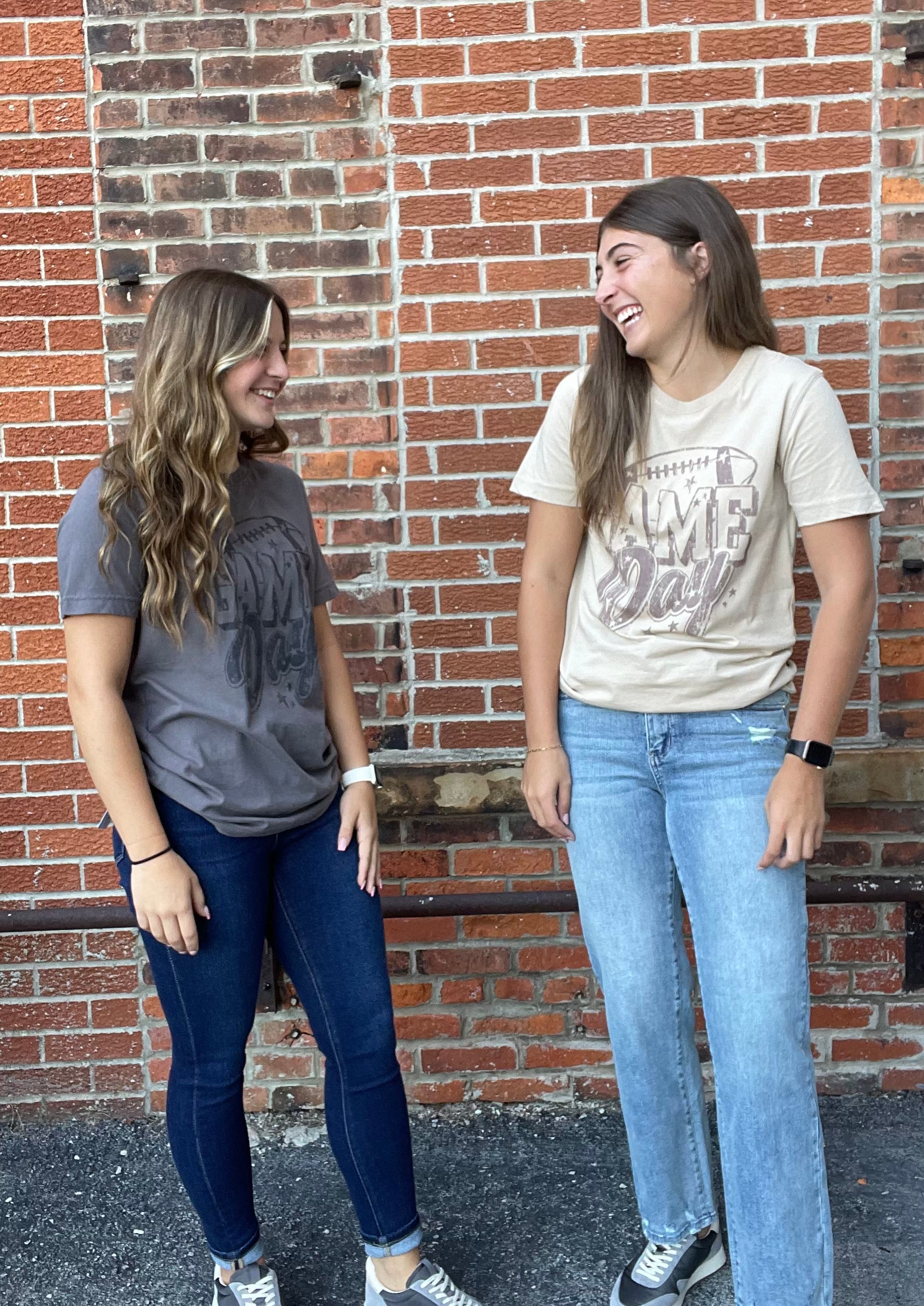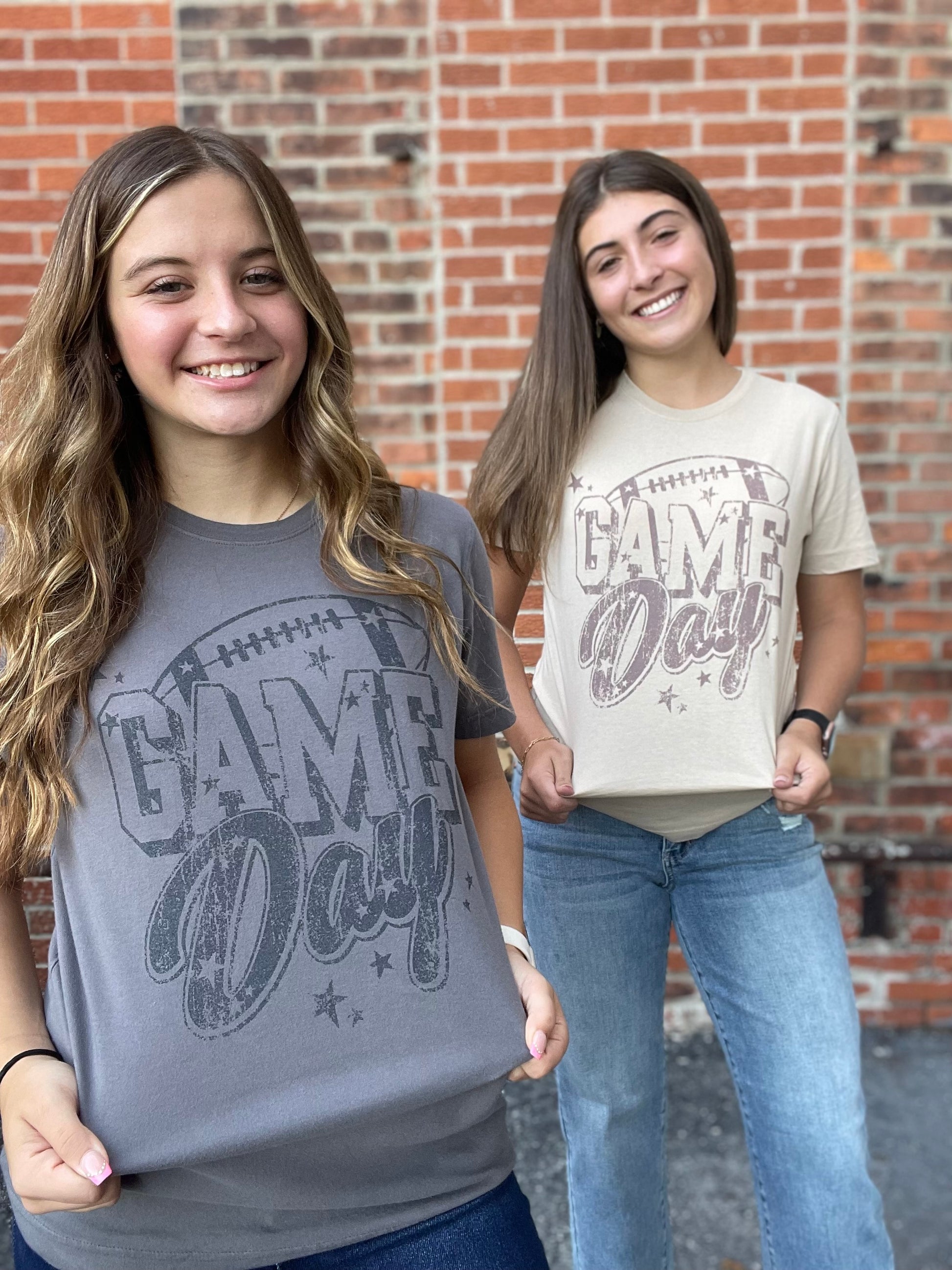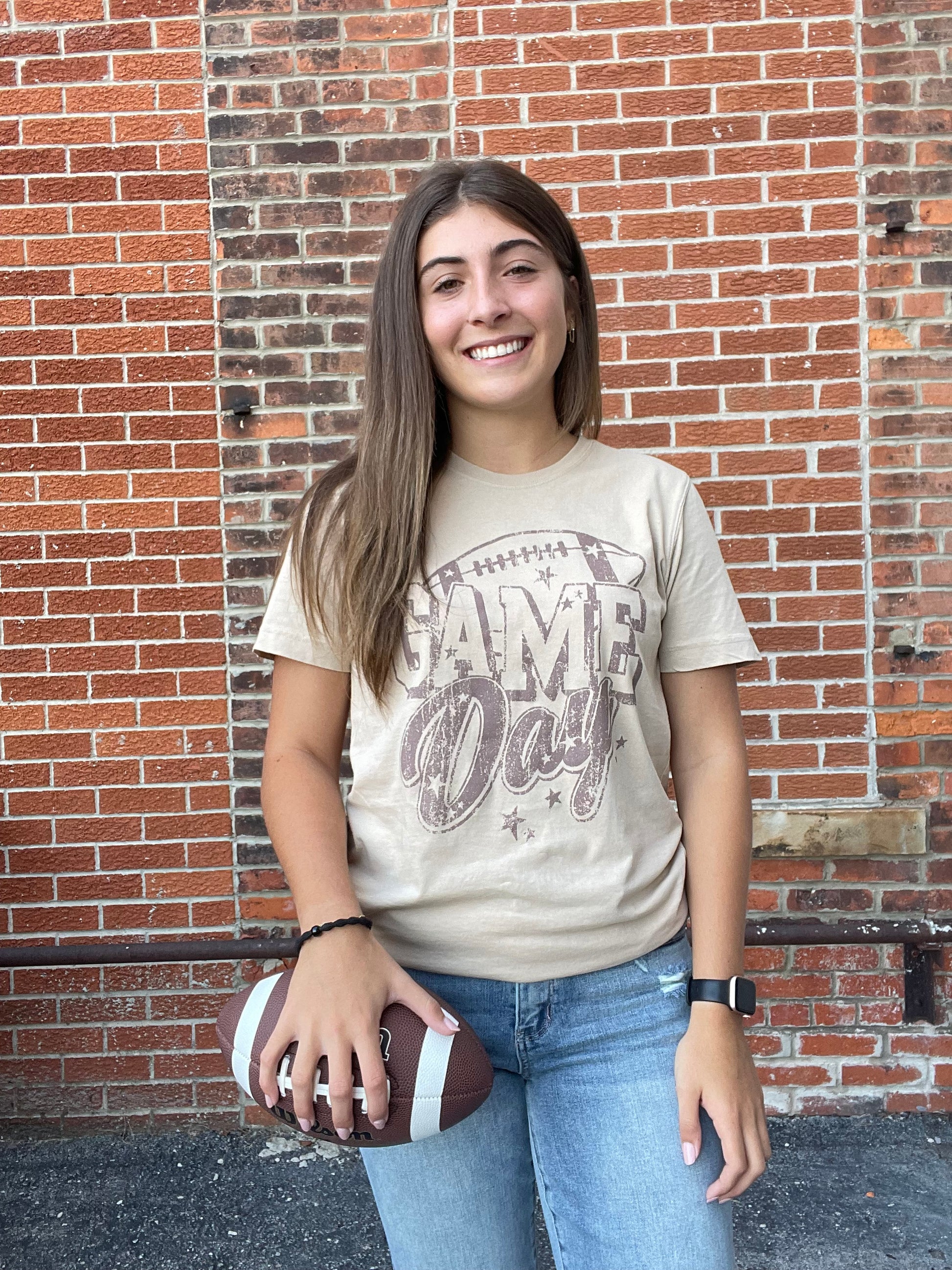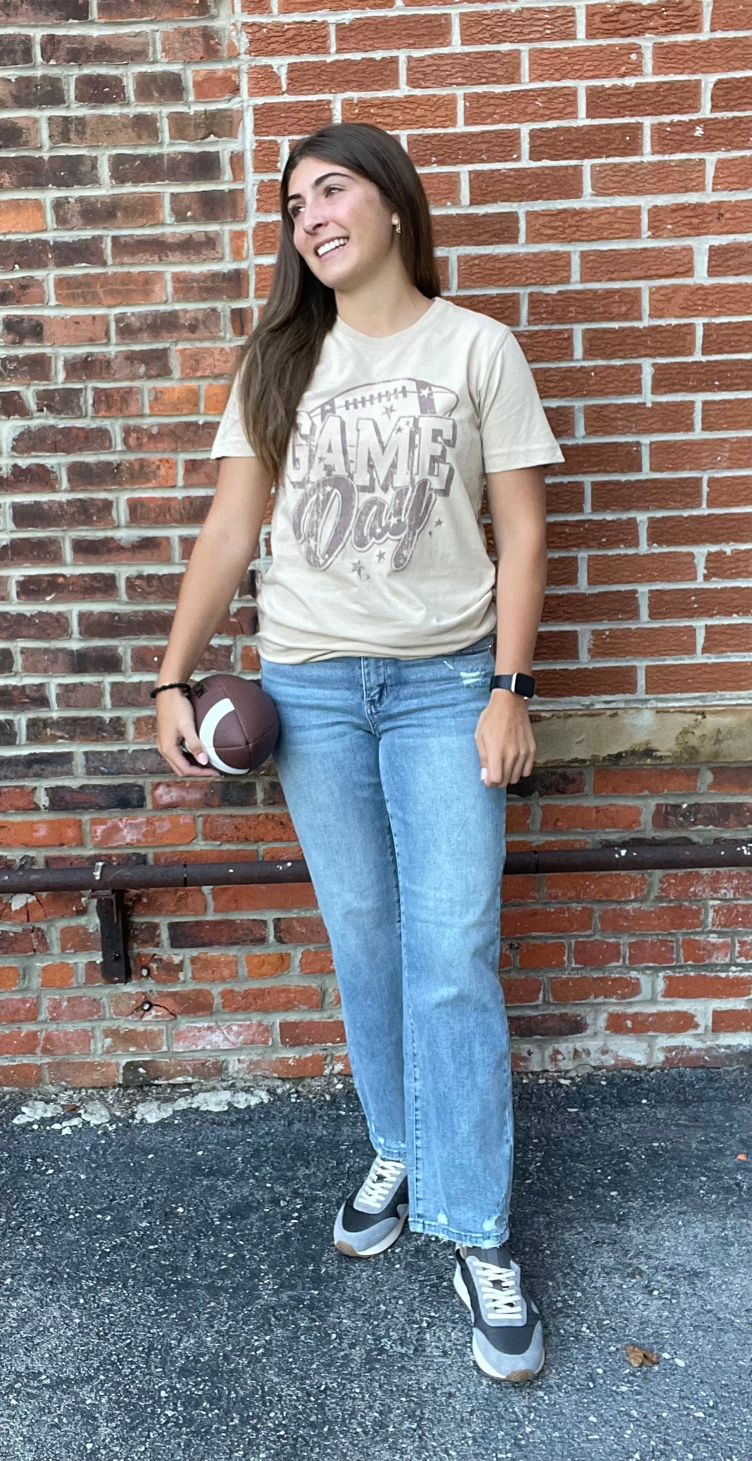 This Fun And Trendy Shirt Features A Fun And Playful “Game Day” Design In A Charming Distressed Font That Gives It A Stylish Worn-In Look. Introducing our Game Day Sleeve Graphic Tee!. Perfect For Showing Your Team Spirit With A Touch Of Chic, This Tee Pairs Well With Jeans Or Shorts For A Casual, Sporty Vibe.