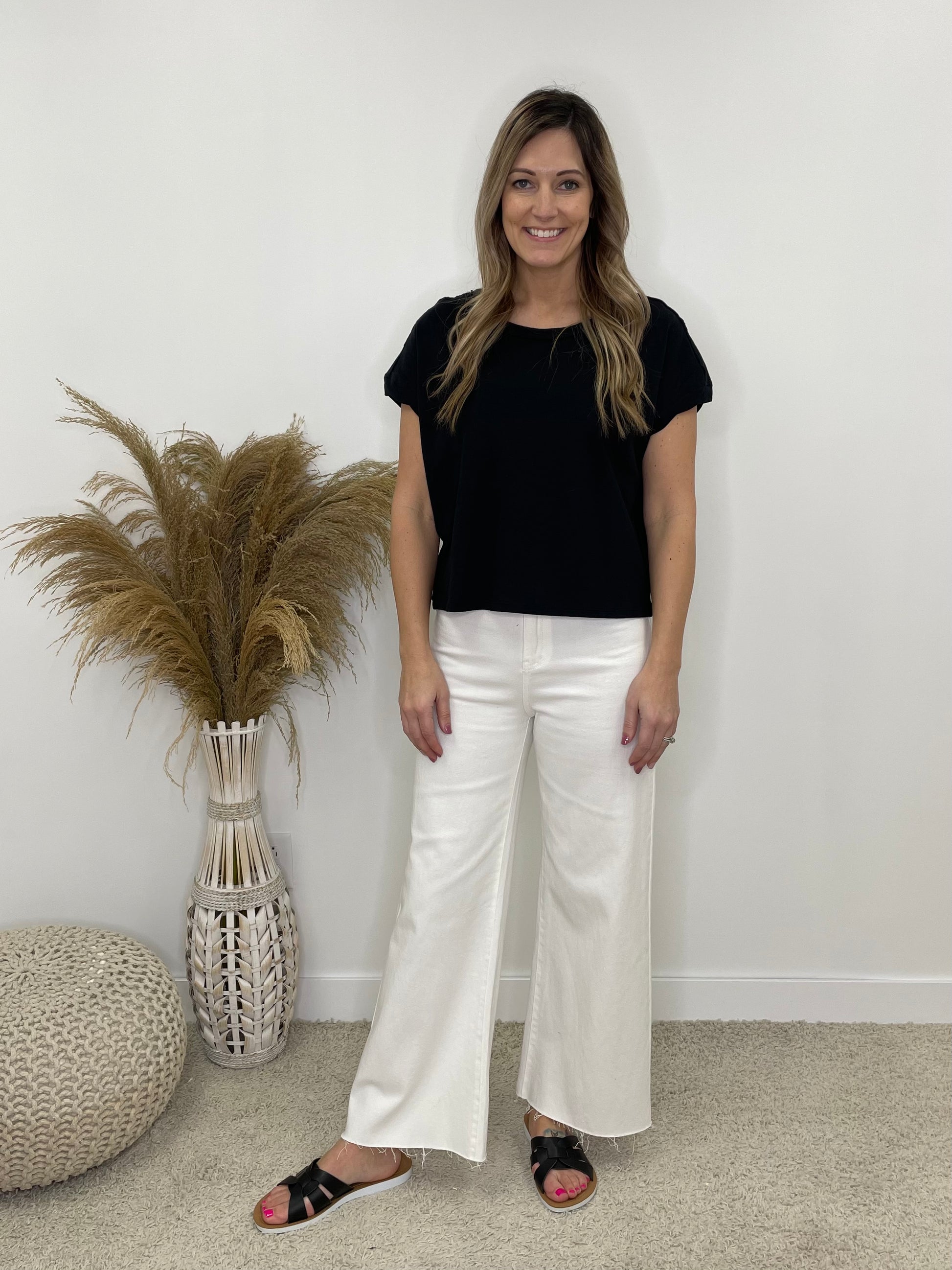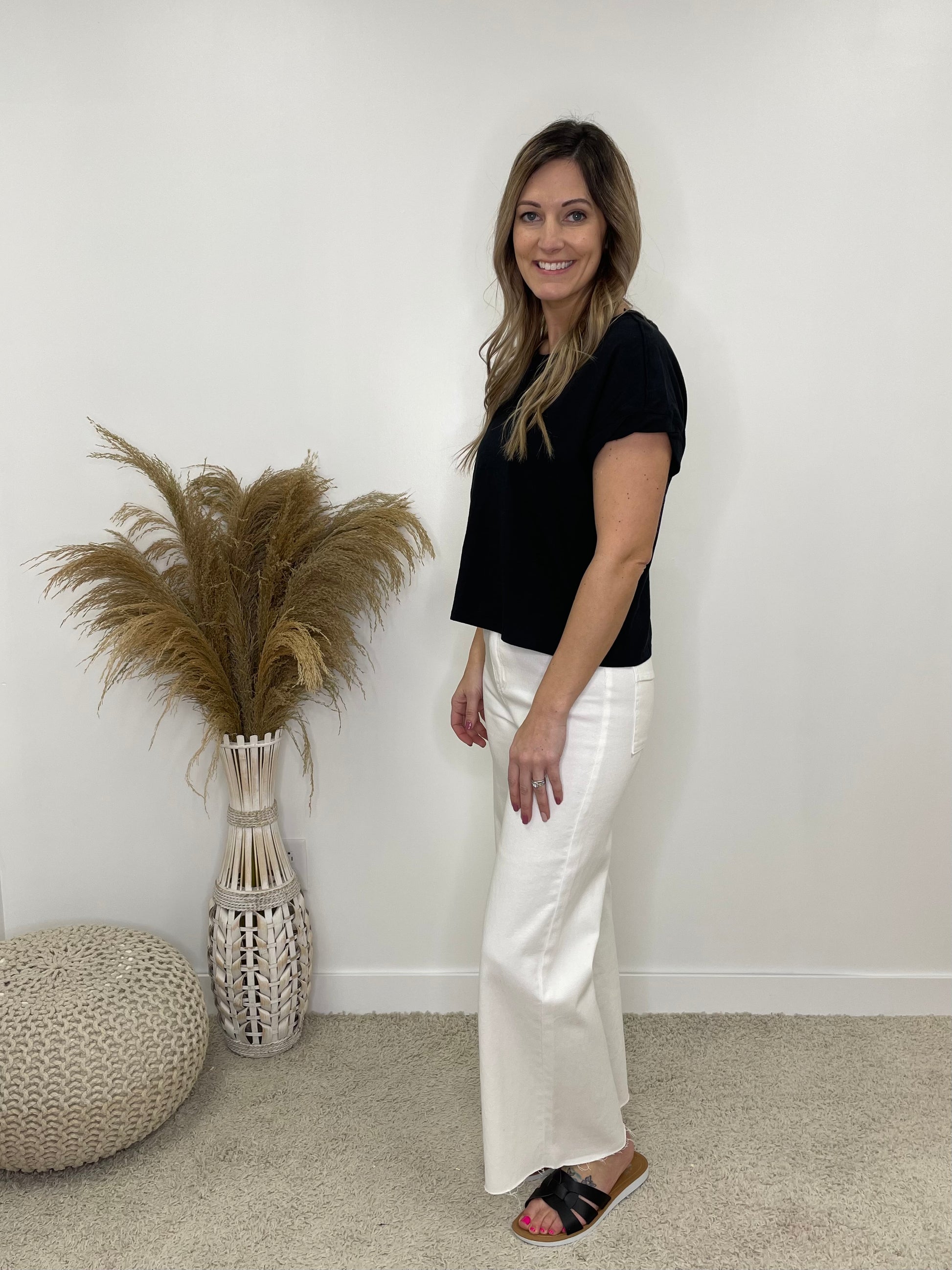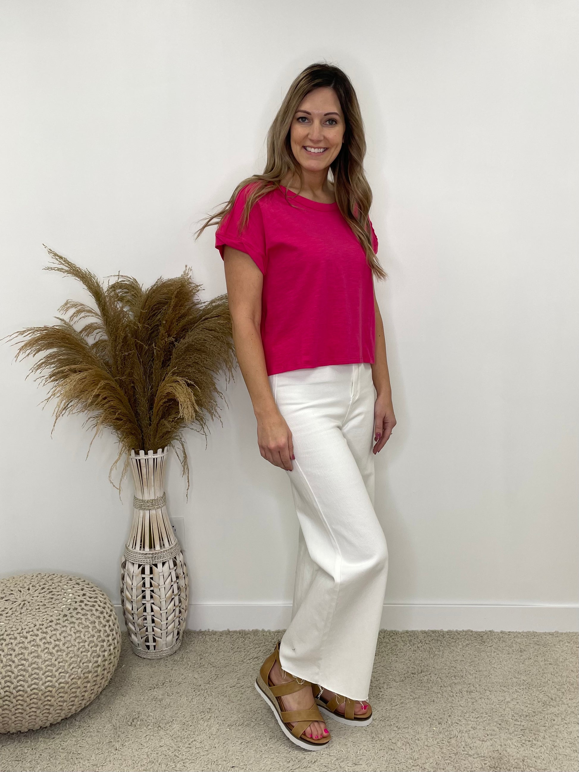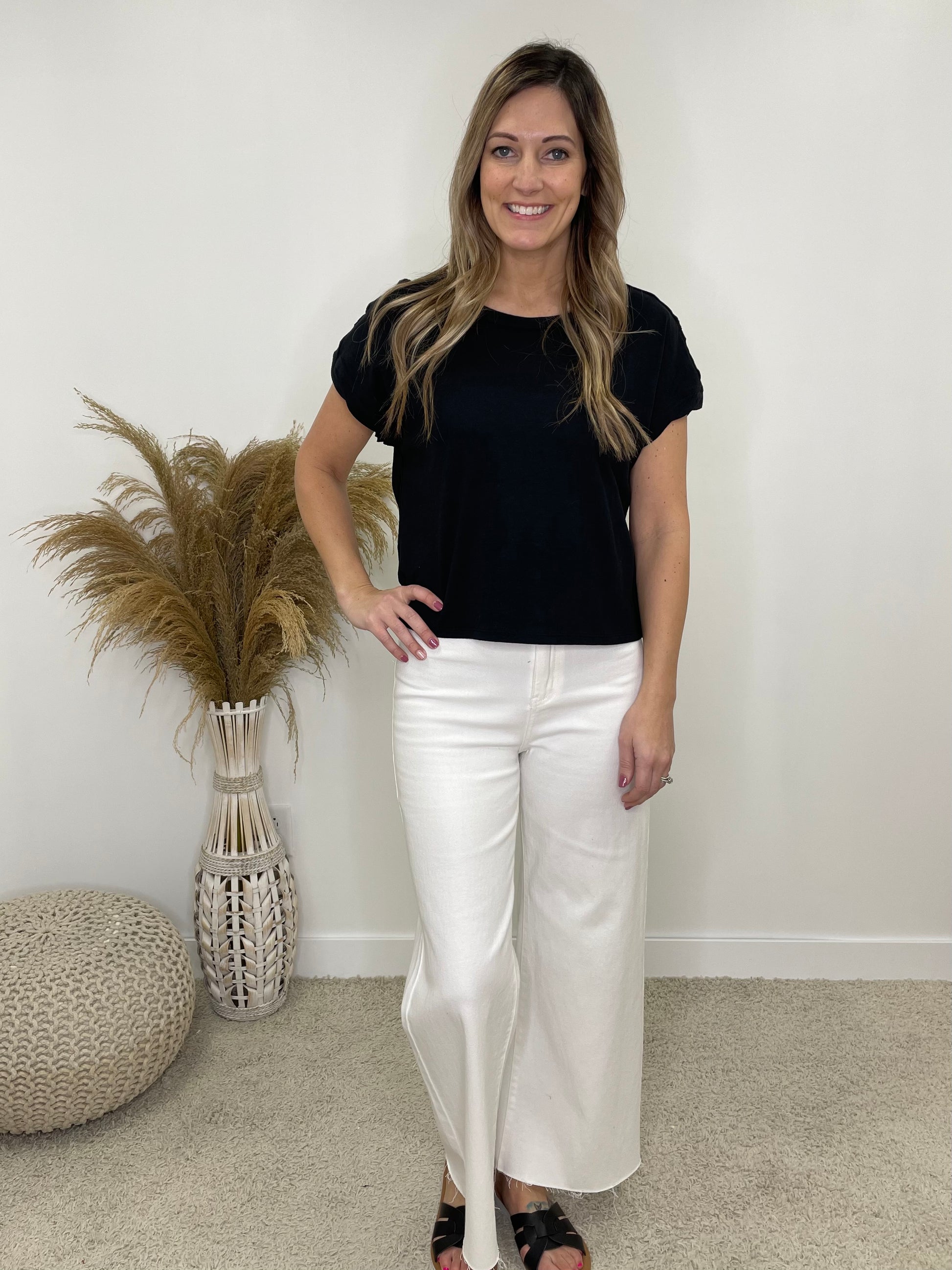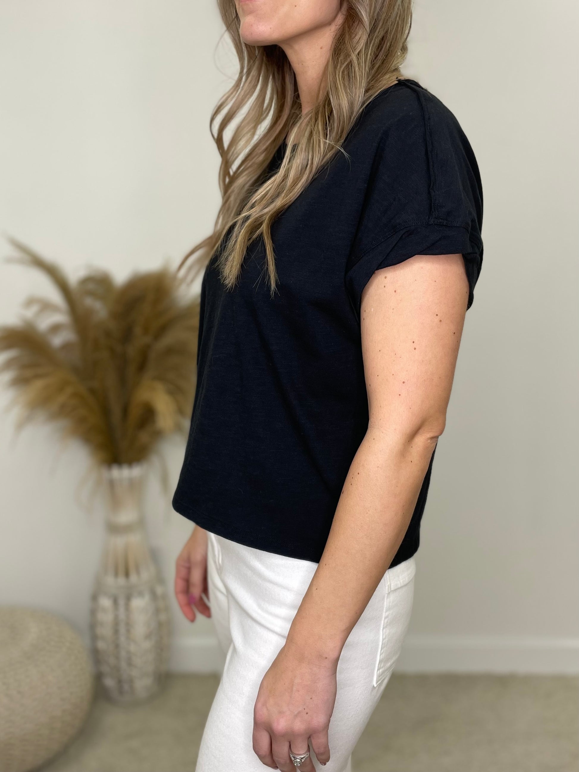 This Basic Slightly Cropped Tee Is a Must Have. This Tee Has A Cotton Feel and Is Lightweight. This Top Is Perfect To Throw On For Any Occasion and is Super Comfortable for All Day Wear