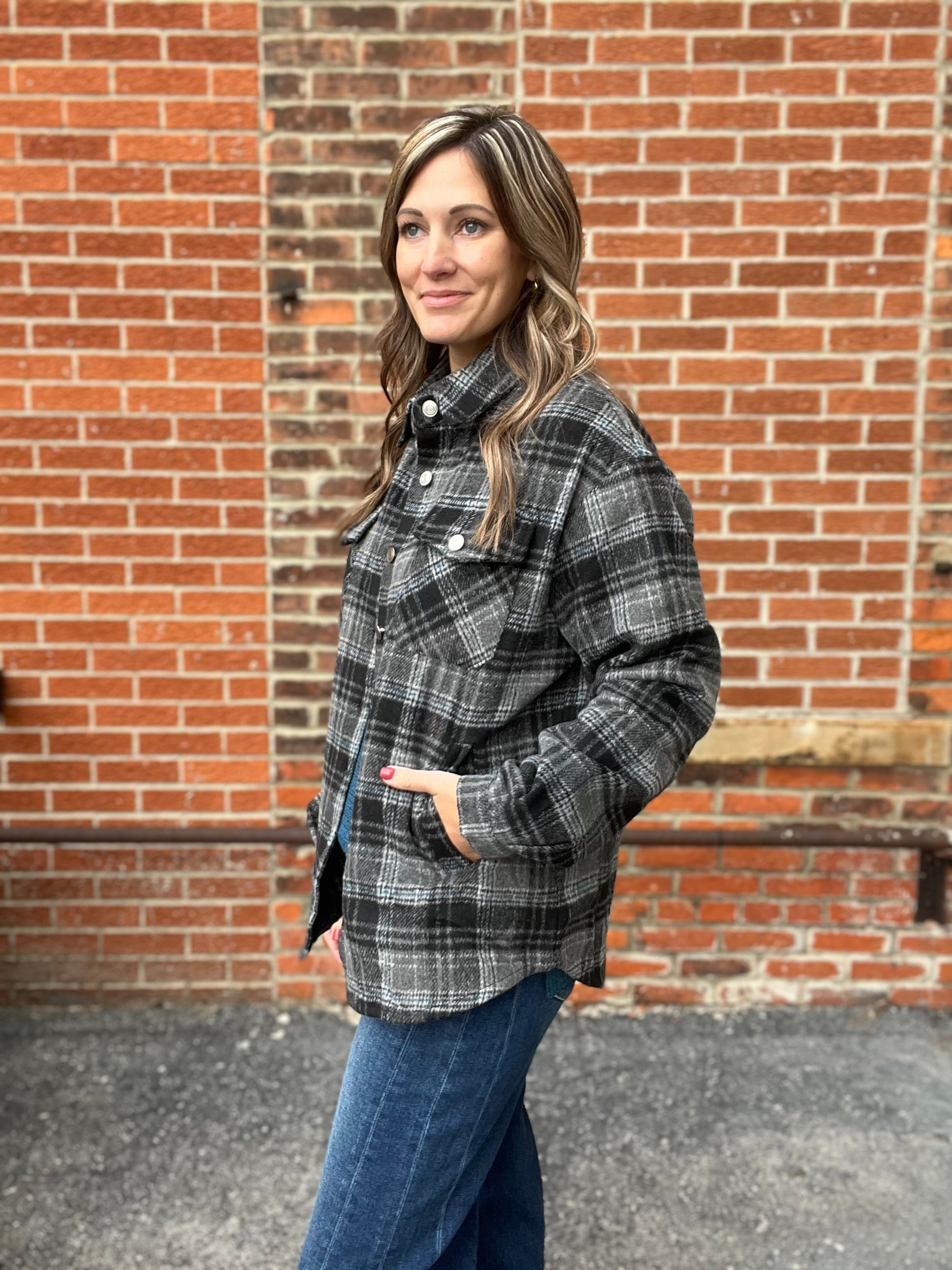 This plaid Shacket features tones of black, blue, and gray, with chest pockets, a button up front, and a relaxed fit perfect for easy layering.