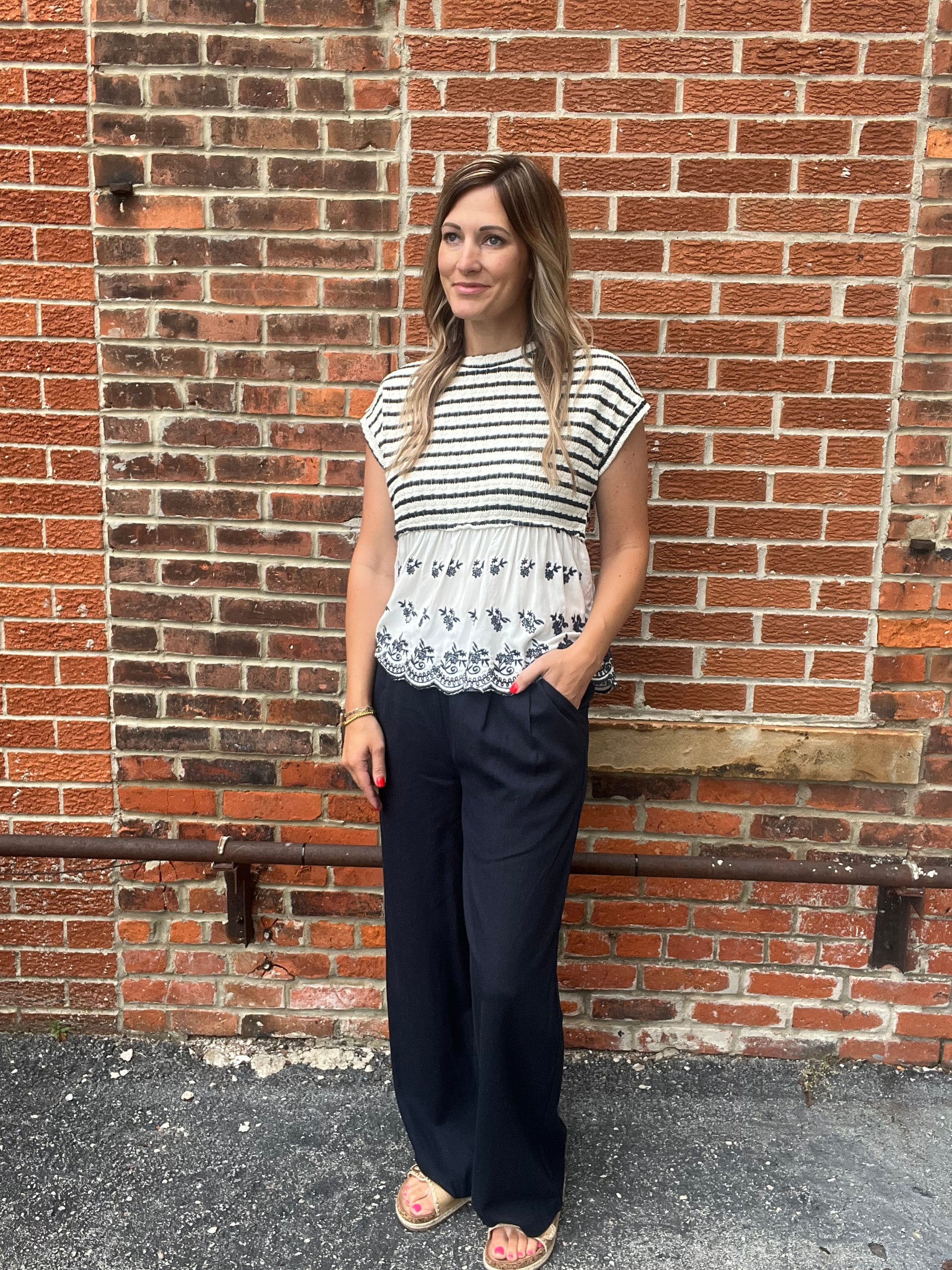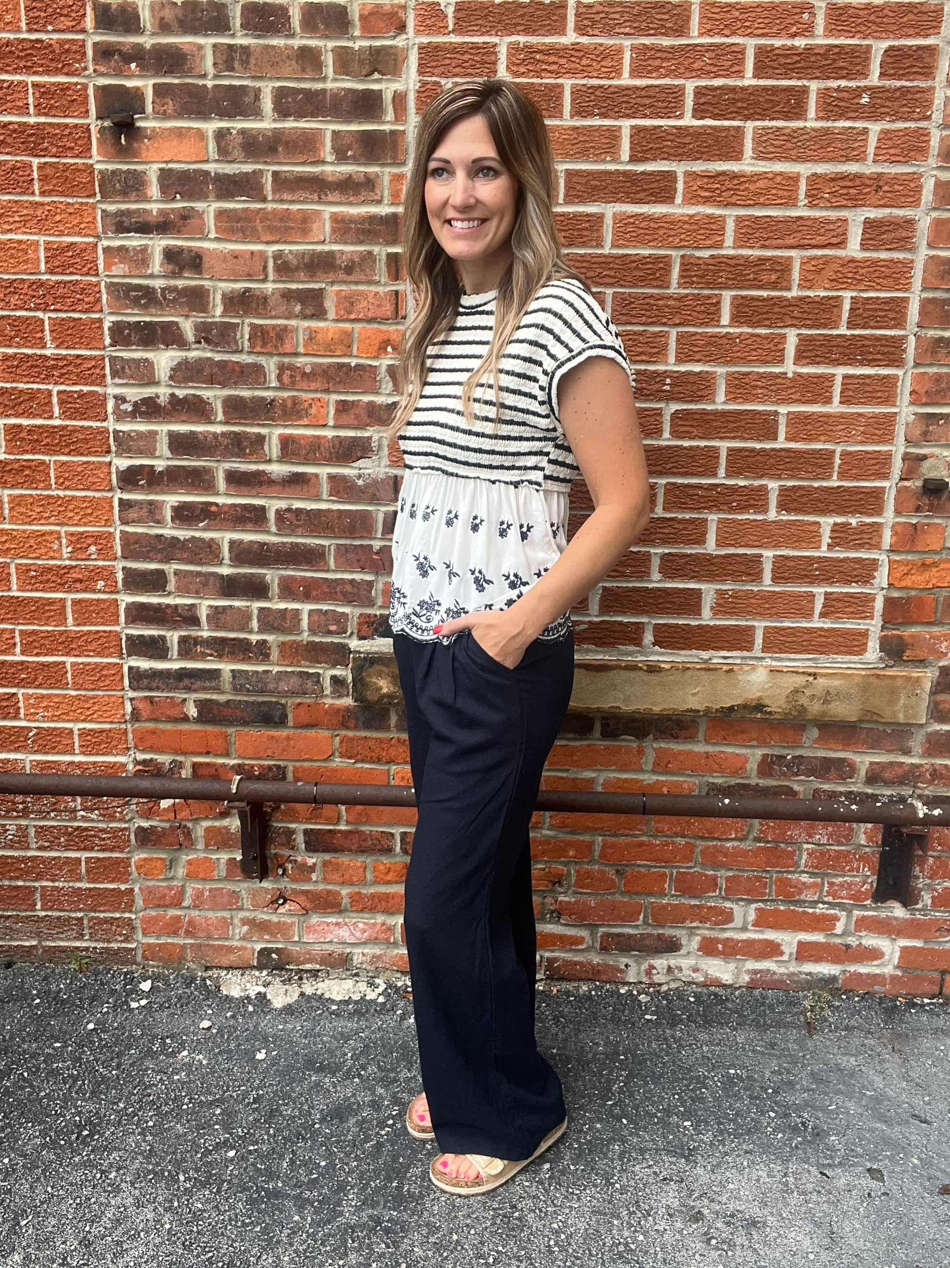 Elevate your everyday look with these navy high waist linen pants featuring a flattering front pleat detail and a comfortable elastic waistband in the back for the perfect fit. Lightweight and breathable, these pants offer effortless style with a tailored touch.
