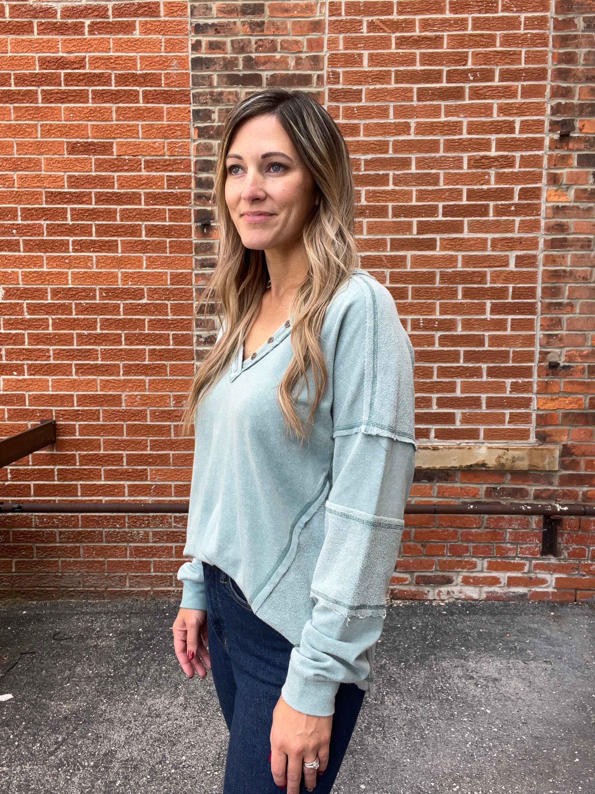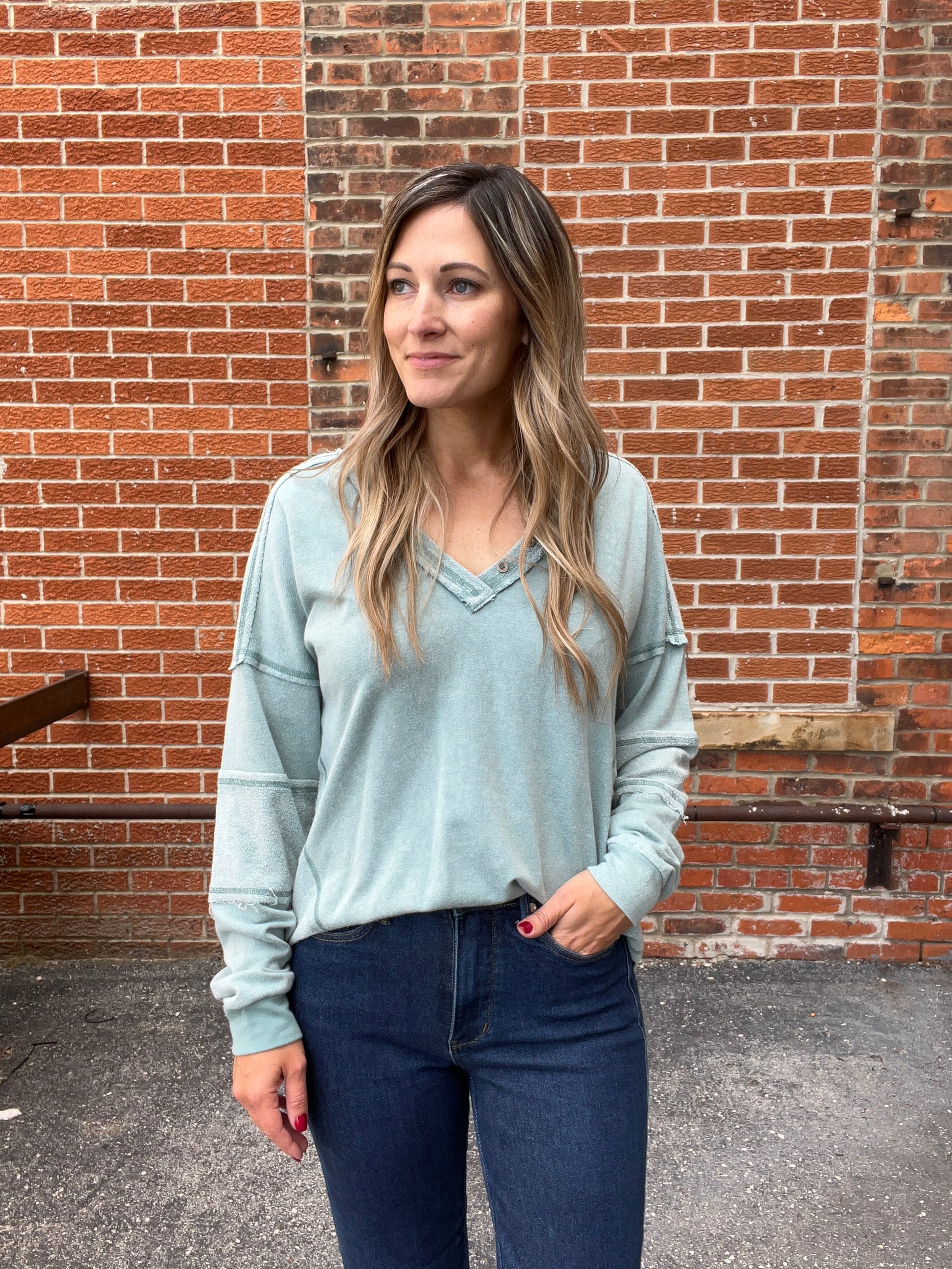 This sage long-sleeve top combines a relaxed, effortless vibe with unique detailing. Featuring a deep V-neck with button accents, it offers a flattering and feminine silhouette. The lightweight fabric ensures all-day comfort, while the frayed seams and subtle patchwork details add a touch of rustic charm. The curved hem provides a modern, flattering fit, making it perfect for layering or wearing on its own. This top effortlessly blends comfort and style, ideal for laid-back days with a hint of sophistication.