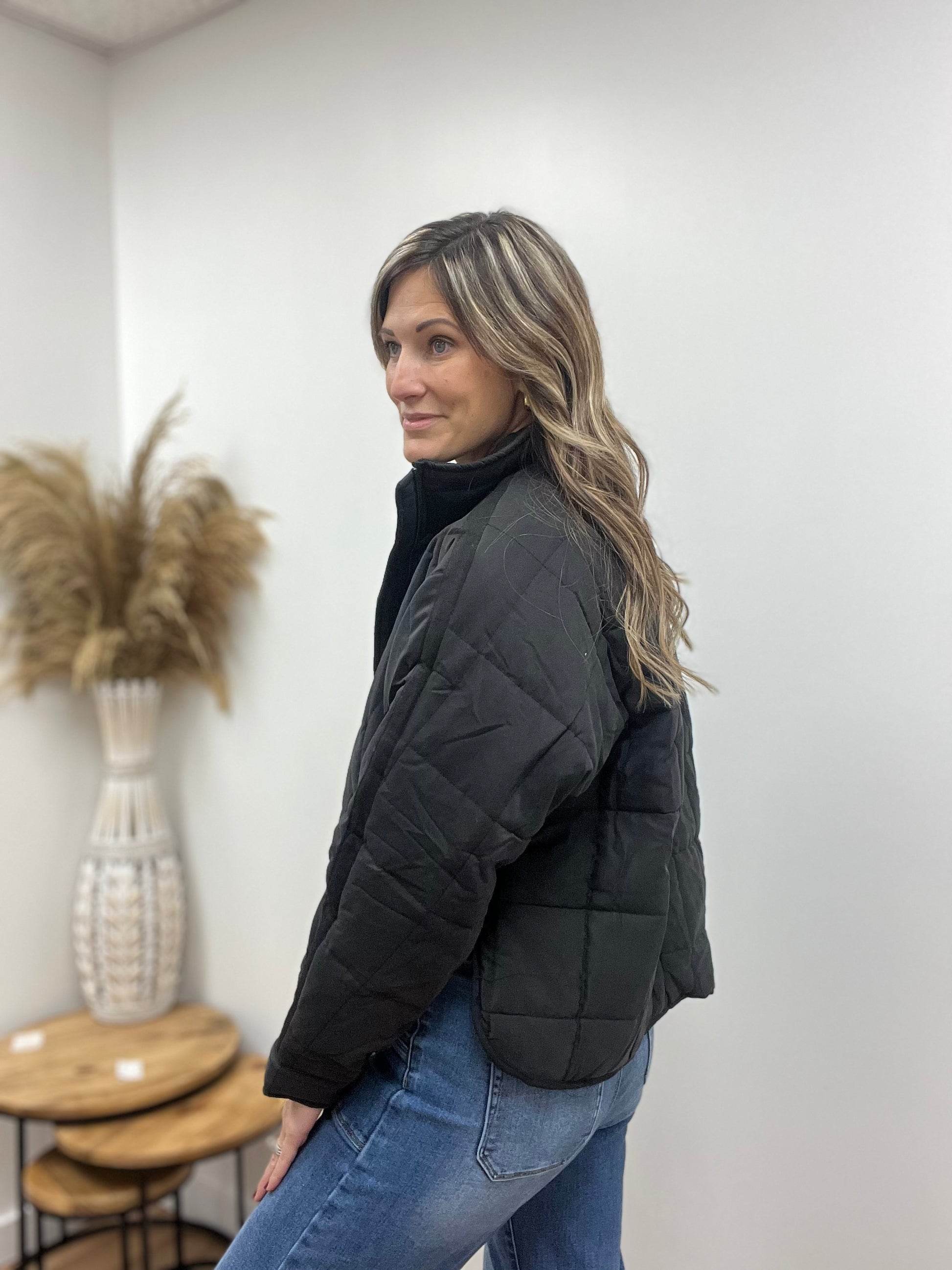 Stay sleek and cozy in this black quilted jacket, designed with functional front pockets and a flattering high low hem. Finished with subtle side slits for easy movement, it’s the perfect lightweight layer to throw on for everyday style and comfort.