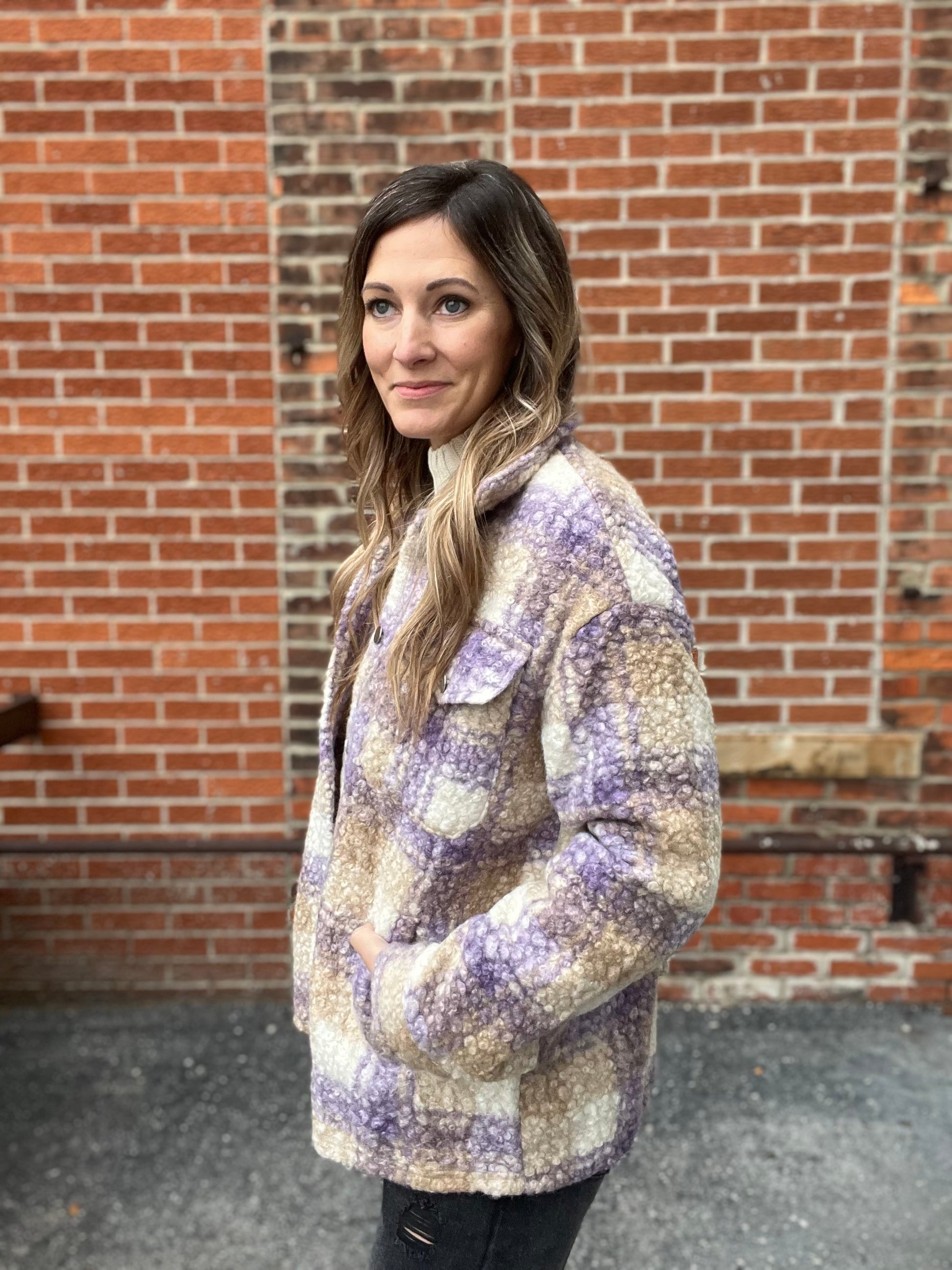 This cozy sherpa jacket features a soft, textured fabric in a unique plaid pattern with shades of lavender, cream, and beige, giving it a warm, rustic feel. It’s designed with a relaxed fit, making it perfect for layering over sweaters or tees. The jacket includes classic details like a button-up front, a collared neckline, and front pockets for added functionality and style. Ideal for chilly days, this jacket combines warmth with a touch of vintage-inspired charm.