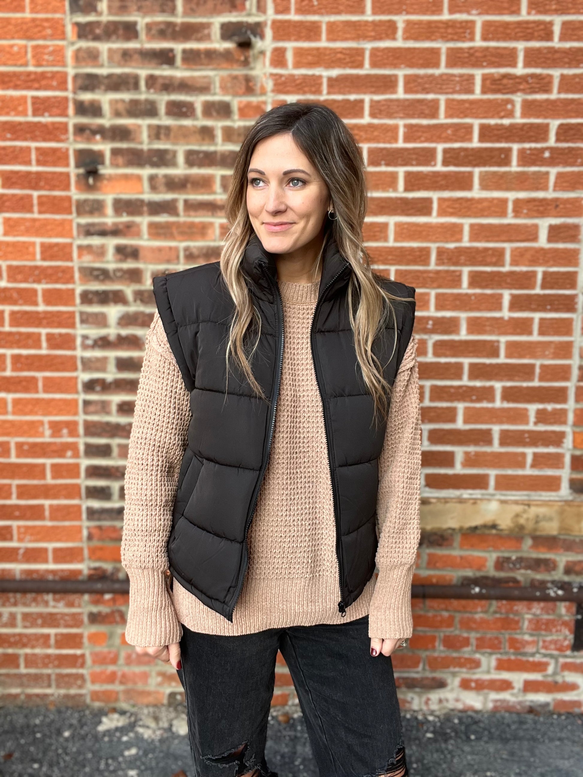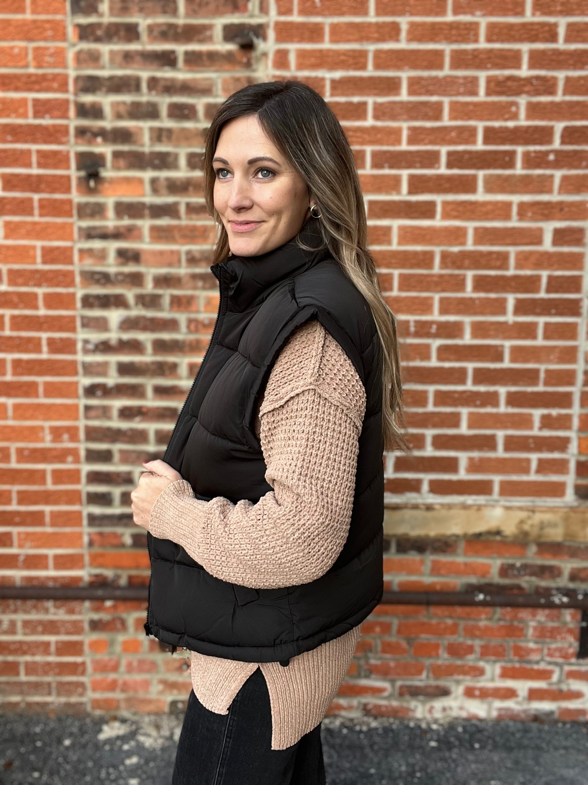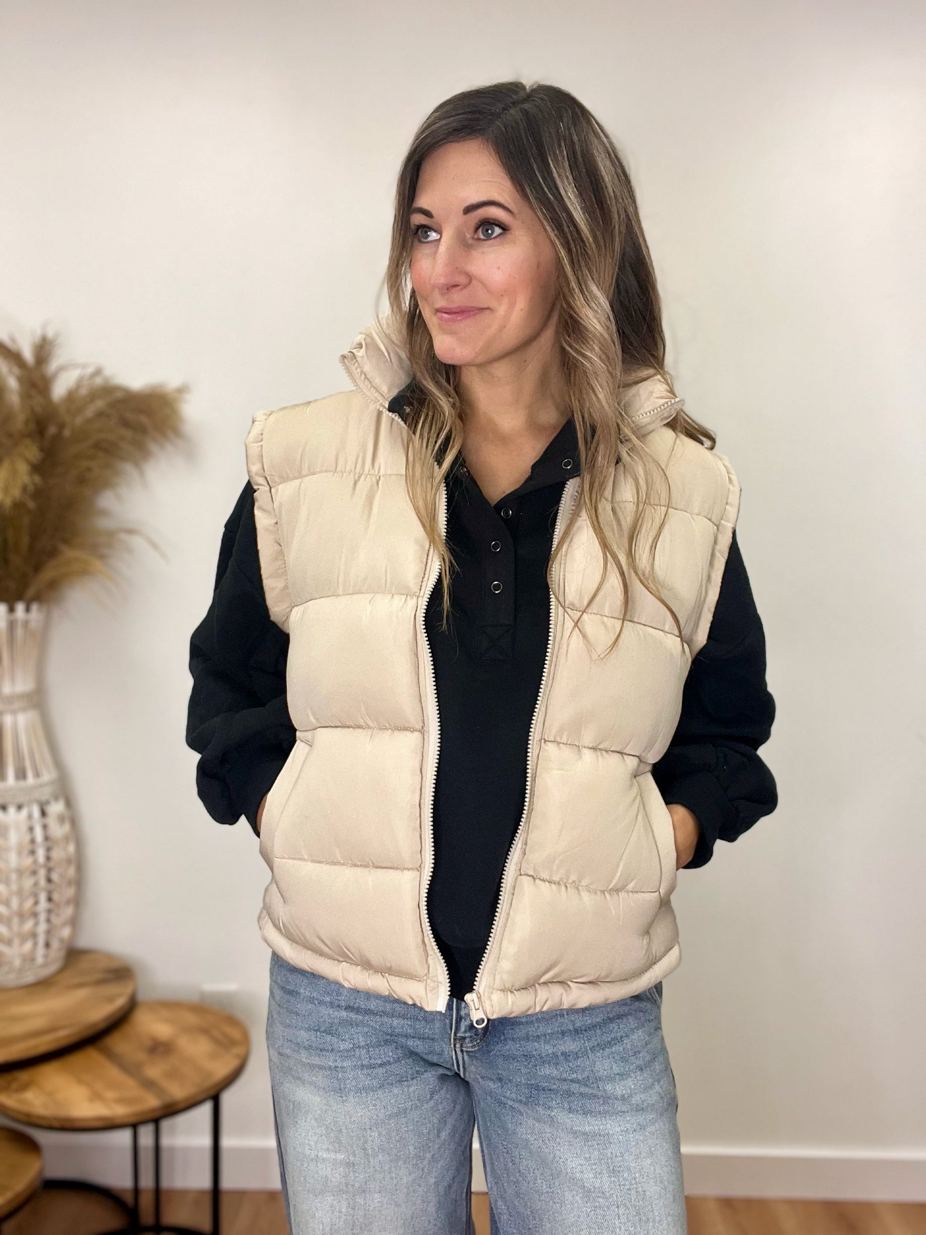 A cozy high-neck puffer vest designed for comfort. Featuring a zip-up front and practical pockets, this versatile vest is perfect for layering on chilly days while keeping you warm and stylish.
