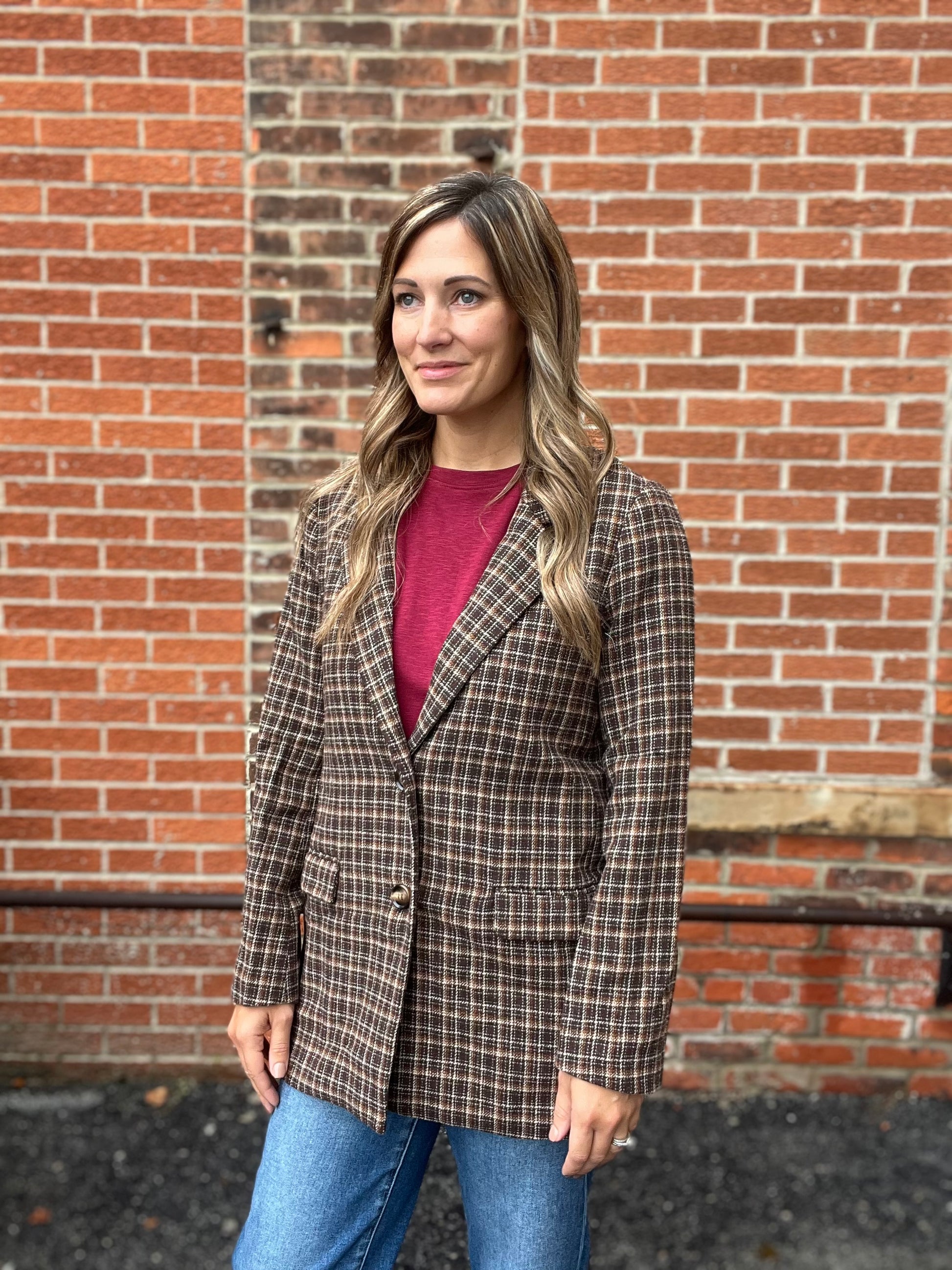 A timeless layering essential. This plaid blazer jacket features a structured fit, classic collar, and full lining for comfort and polish. The rich brown plaid pattern makes it a versatile choice, perfect for elevating casual looks or adding a sharp finish to dressier outfits.