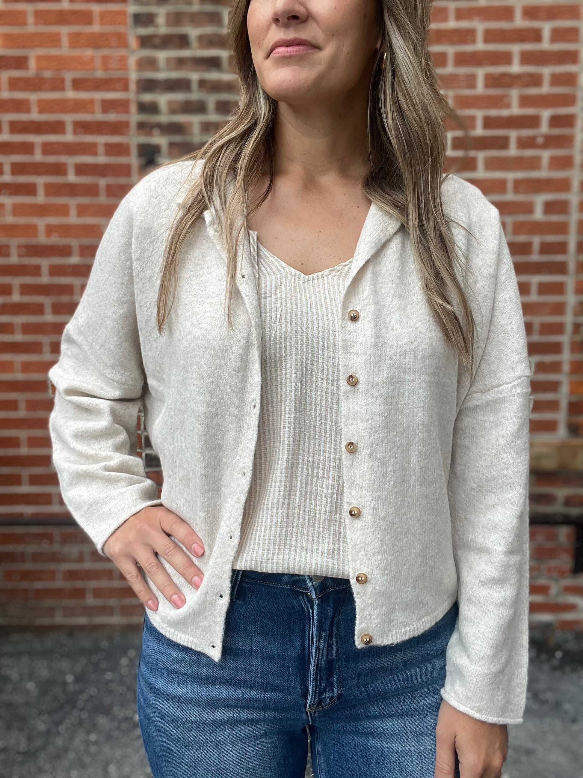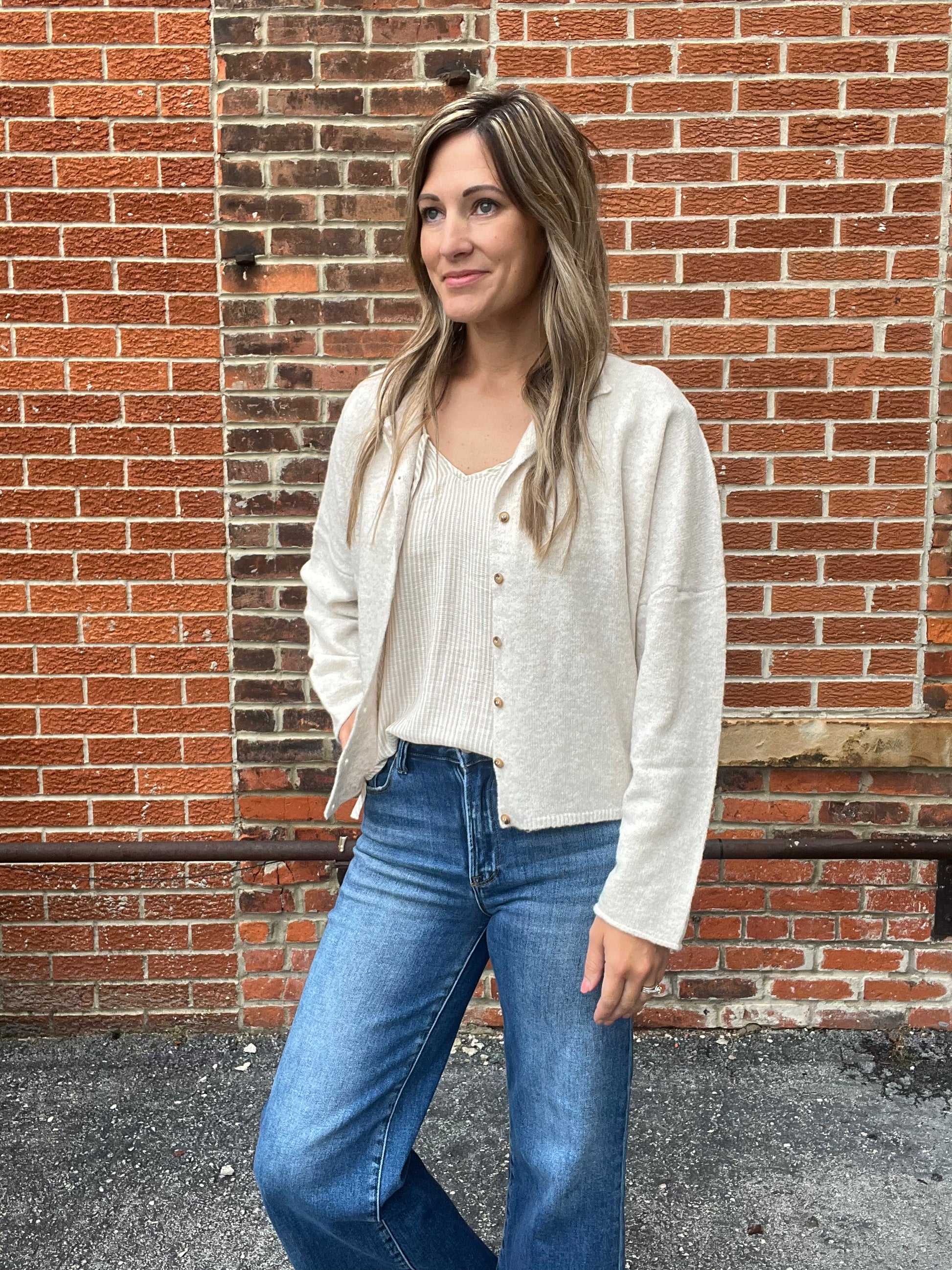 This lightweight cream knit cardigan is the perfect layering piece for any season. Made from a soft, breathable knit, it features a classic button down front and a relaxed fit for easy, everyday wear. Timeless, cozy, and effortlessly chic.