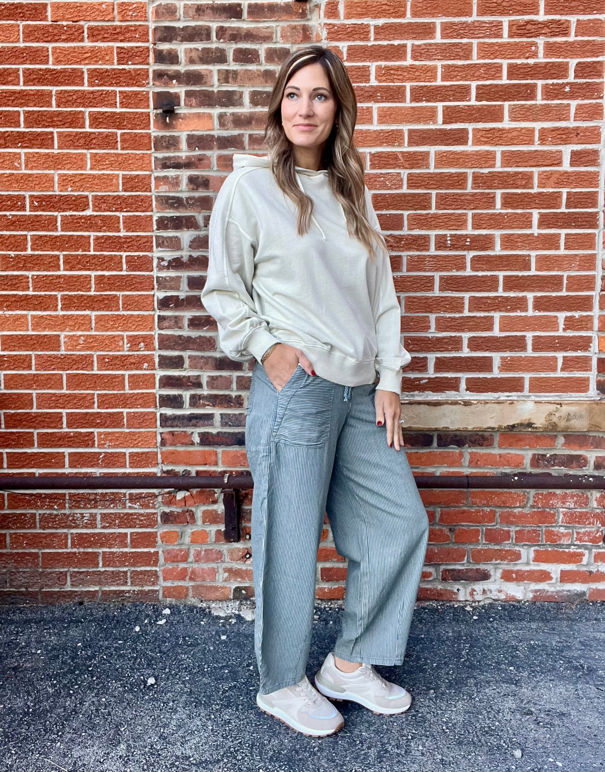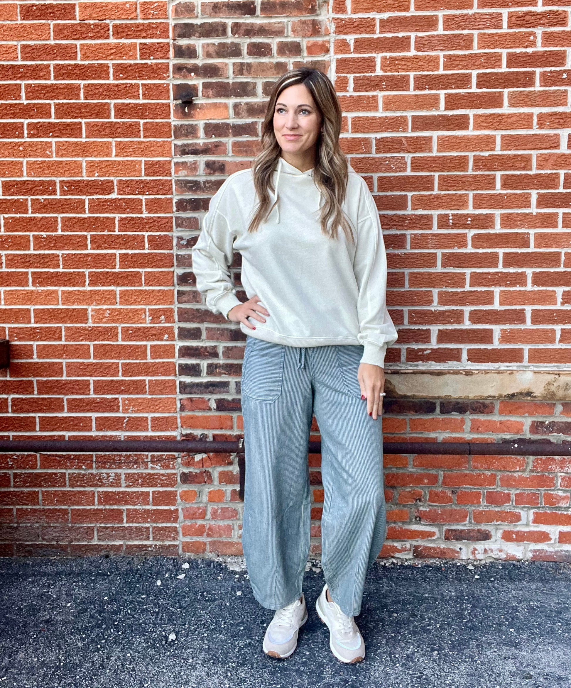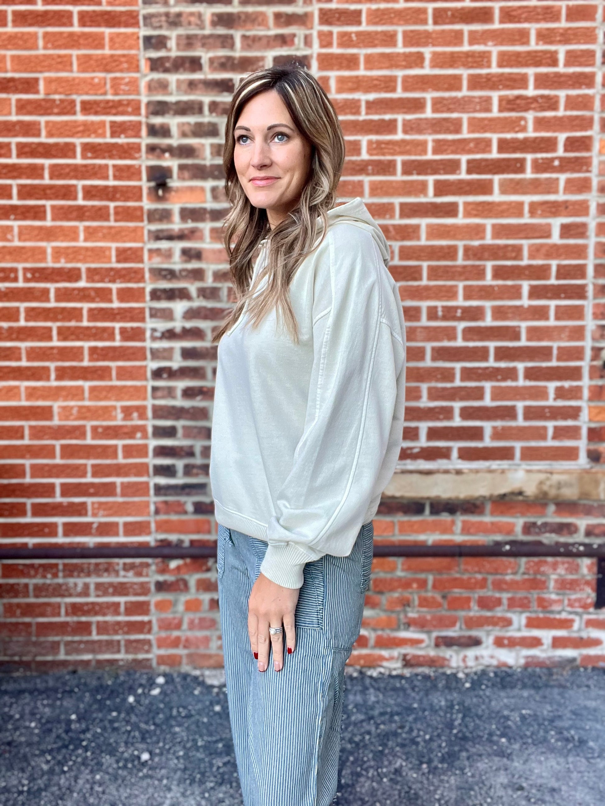 This light weight sand beige hoodie is the perfect blend of comfort and style, featuring a soft feel with ribbed cuffs and a ribbed bottom hem for a classic finish. Easy to wear and effortlessly laid back, your new everyday go to.